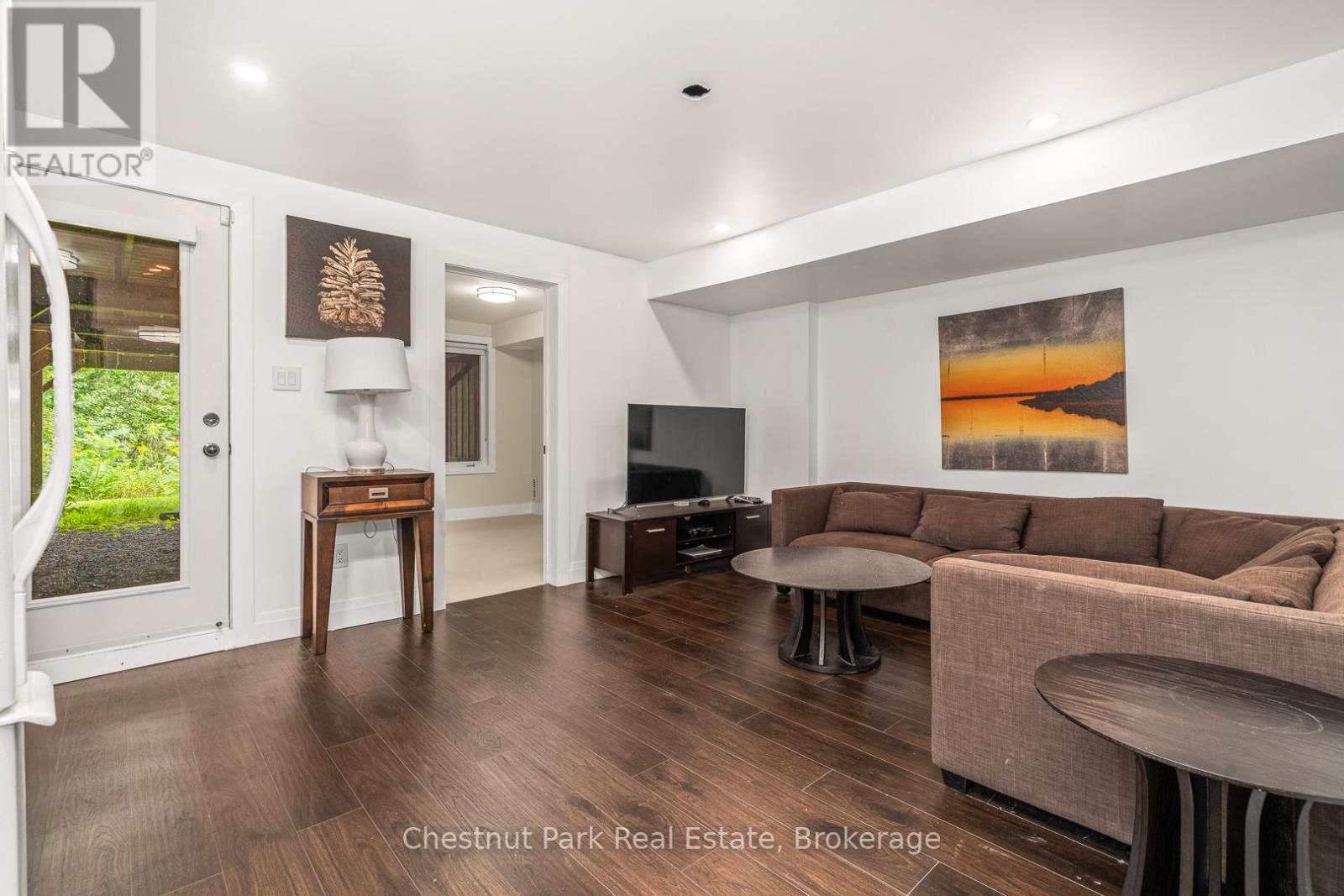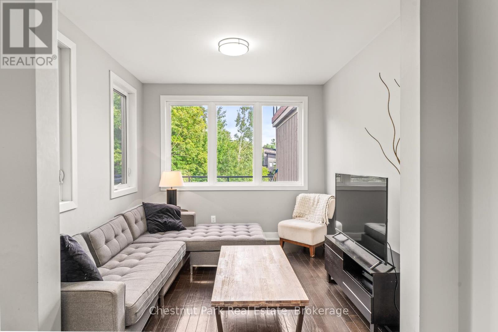 Discover refined living at Muskoka Bay Resort with this stunning 4 bedroom, 3.5 bathroom townhouse. Blending modern comfort with resort style amenities , this 1573 square foot home is perfect for year round living, investment or a luxury retreat. The main floor features an open concept kitchen with central island, a bright dining area, and a welcoming living room with gas fireplace. A beautiful four season room extends your living space and a walkout deck overlooks the natural ravine below. Upstairs the Primary Bedroom offers a private balcony and a three piece ensuite. Two additional bedrooms and a four piece washroom provide ample space for family or guests. The fully furnished lower level includes a spacious living room with walk out access to green space, a full four piece washroom, laundry and direct access to the one car garage. Take advantage of the fully managed resort rental program to help generate revenue when you are not using your unit. As part of Muskoka Bay Resort this property includes the initiation fee for a golf or social membership, granting access to world class amenities such as the award winning championship golf course, clifftop clubhouse with restaurant and patio, infinity pool, kids pool and sauna and a variety of year round activities such as skiing, snowshoeing, skating and more. Whether you are entertaining, relaxing or enjoying Muskoka's four season, this home offers the perfect balance of comfort and lifestyle. (id:64974)