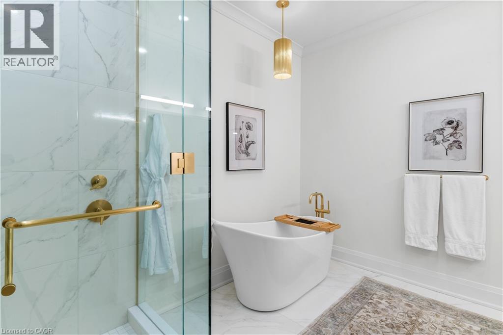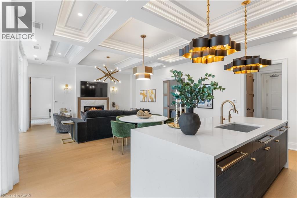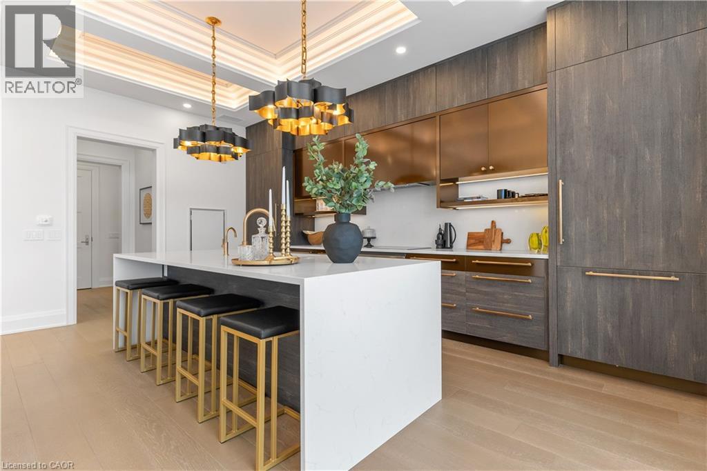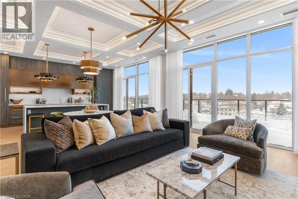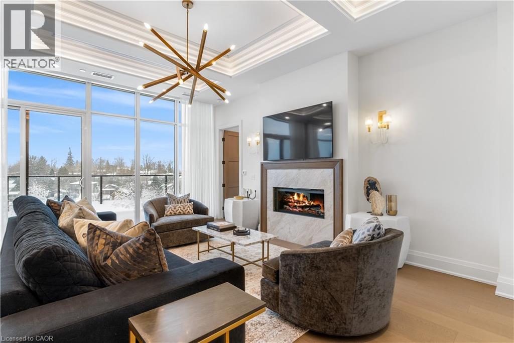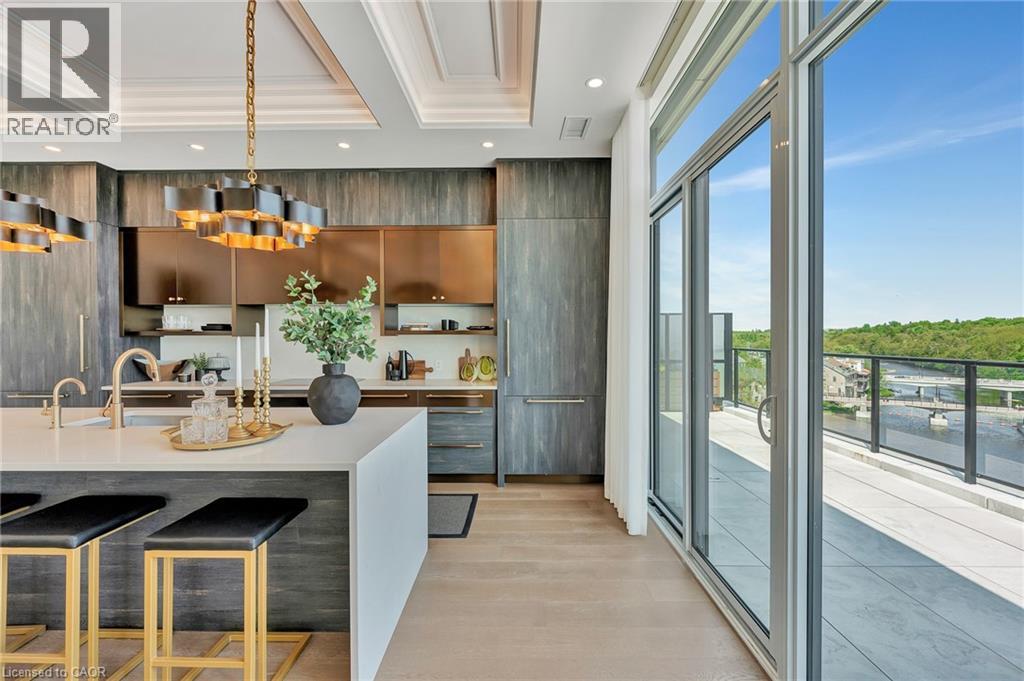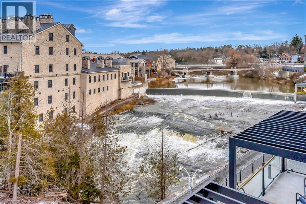 Experience elevated living at its finest in The Mill Penthouse! Set within the coveted Elora Mill Residences, this penthouse redefines luxury with soaring 10-foot ceilings, designer lighting, and curated finishes throughout. A gas fireplace adds warmth and sophistication to the open-concept living space, while the expansive private terrace, boasting over 650 sq. ft., offers a built-in gas line perfect for a custom outdoor kitchen, grill, or fireplace. Glass railings reveal panoramic, unobstructed views of the Elora River and its iconic bridges, with four separate walkouts creating seamless indoor-outdoor living. At the heart of the home, the chef-inspired kitchen impresses with a grand island with seating, full-height cabinetry, and upgraded Miele appliances. The open living and dining areas provide flexibility to design your perfect entertaining space, while a private den with sliding doors is ideal as a home office, media room, or formal dining area. The primary suite is a tranquil retreat, complete with a custom walk-in closet and a spa-like ensuite featuring a deep soaker tub, oversized glass shower, double vanity, and private water closet. A second bedroom, in its own private wing with a dedicated full bathroom, is perfect for guests or family. Residents enjoy exclusive access to resort-style amenities including a concierge, lobby coffee bar, residents' lounge, formal dining room, outdoor furnished riverfront terrace with firepits, and an outdoor pool with spectacular river views. Just steps from Elora's gourmet restaurants, boutique shops, and charming cafés, you'll enjoy living in this picturesque, walkable community. Complete with fully automated blinds, two parking spaces, and a storage locker, an opportunity to own a penthouse suite at one of Elora's most prestigious and sought-after addresses. (id:64974)