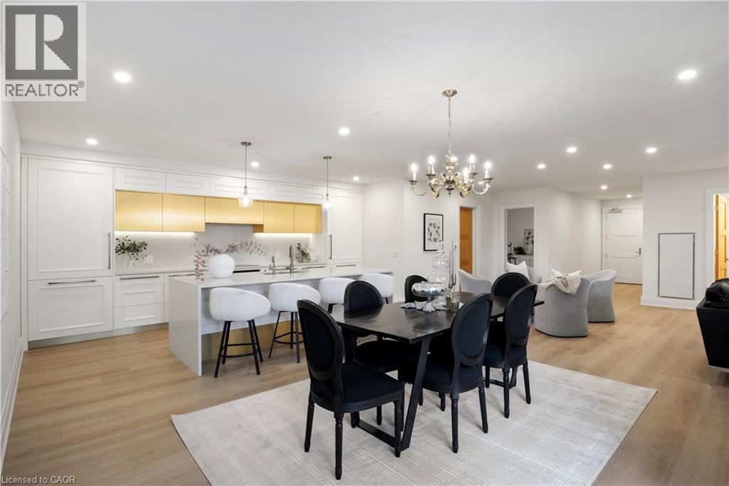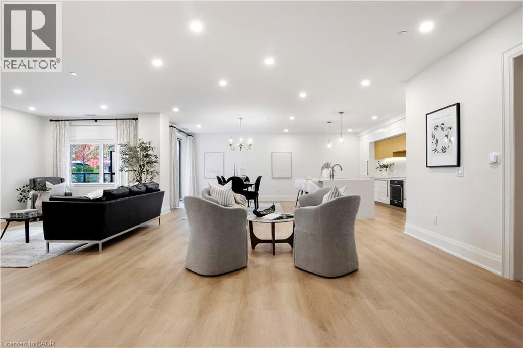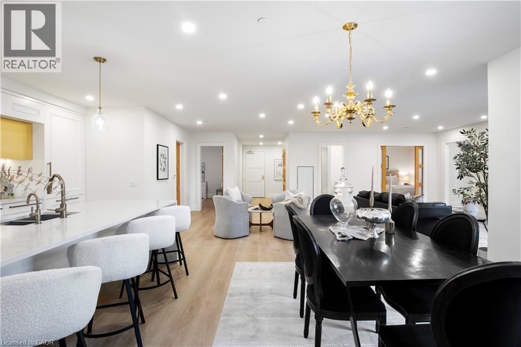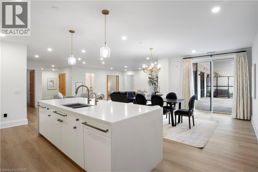 This Luxury suite was designed for those looking to downsize without compromise. 2,098 Sqft of thoughtfully designed living space, this stunning first-floor residence combines the ease of Condo Living with the space and comfort of a Detached Home. This open concept layout has incredible flexibility, allowing you to tailor the space to suit your needs. The expansive dining area comfortably accommodates a full sized dining table, perfect for hosting dinner parties or cherished family gatherings, with room to bring your heirloom set. The living room is ideal for entertaining or relaxing with multiple seating areas and direct access to a sprawling 247 sqft Terrace, perfect for outdoor dining or enjoying your morning coffee. The designer kitchen, complete with an oversized island, with seamless integration into the living and dining areas. Tucked away the primary suite is a true retreat, accessed by a separate hallway and features a spa-inspired ensuite bath and generous walk-in closets. A second spacious bedroom, ideal for family or guests with a large closet & the 3rd bonus room provides added versatility, easily used as a home office, media room or even a 3rd bedroom for visitors. The full-size laundry room offers additional storage and convenience. Located on the ground floor, this suite offers direct views of the Terrace and across the river to the Elora Mill. Perfect for pet owners or those who prefer to avoid elevators. Start your mornings with a short stroll to the resident lounge to enjoy coffee and fresh pastries from the Elora Mill. This suite includes one underground parking space, a locker, and offers access to resort-style amenities: Fitness centre, Yoga studio, Lounge and Lobby Coffee Bar, Outdoor Terrace, and a Pool with Spectacular River Views!! Experience refined living in one of Ontario's most charming and walkable communities. Just steps away from award winning restaurants, artisan shops, cafes and the natural beauty of Elora. (id:64974)