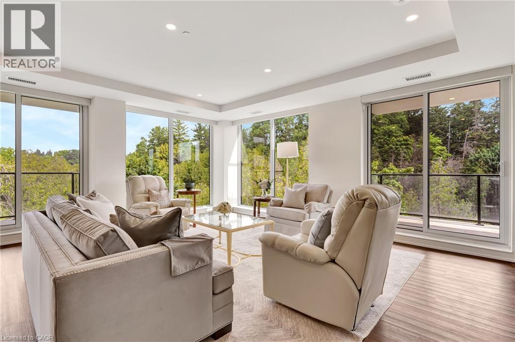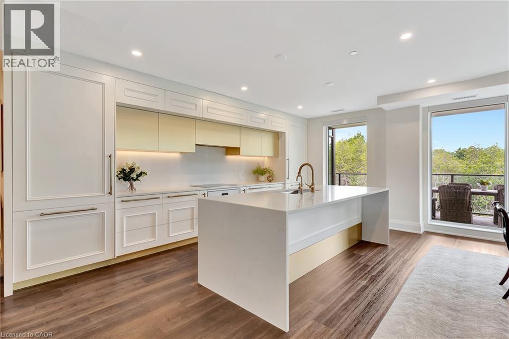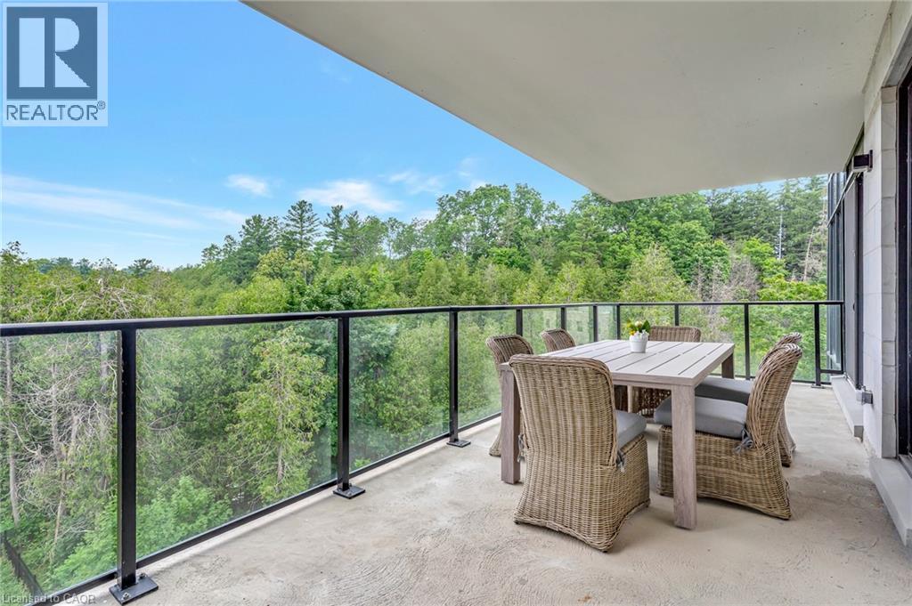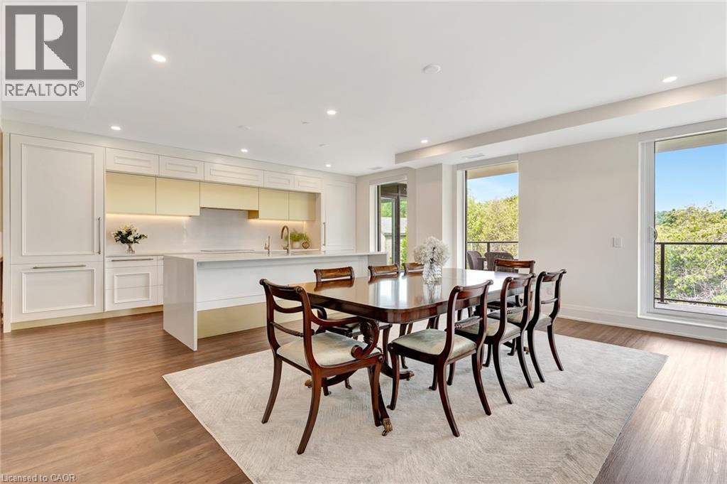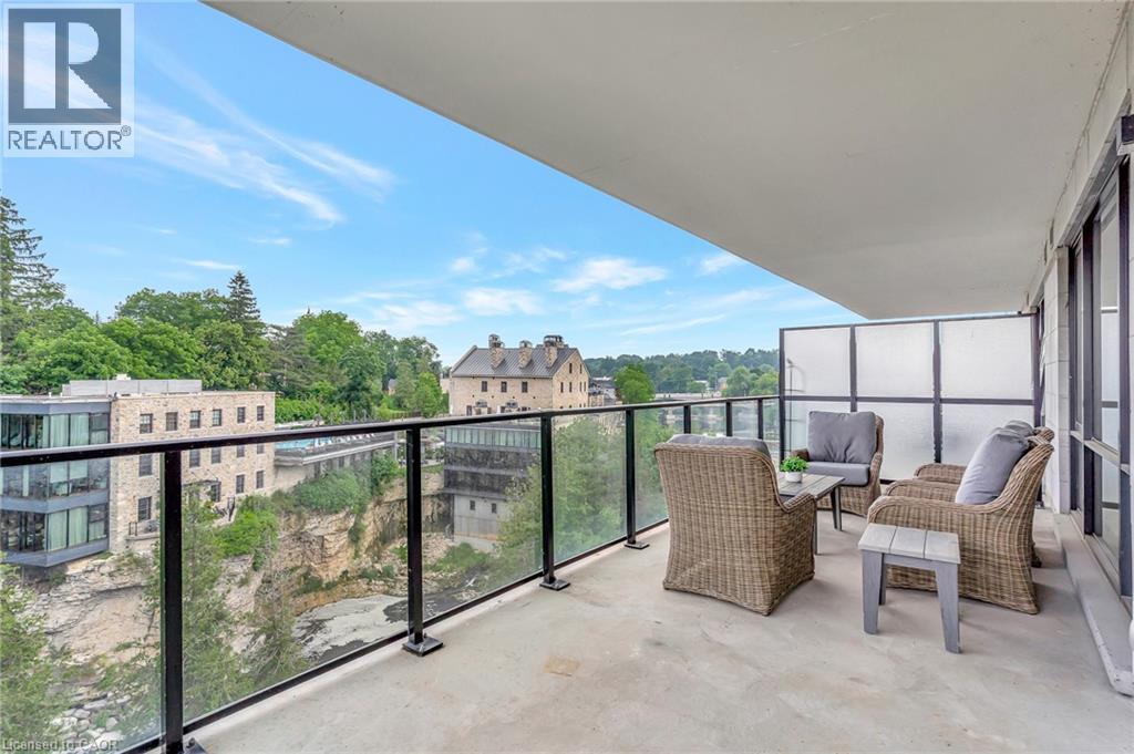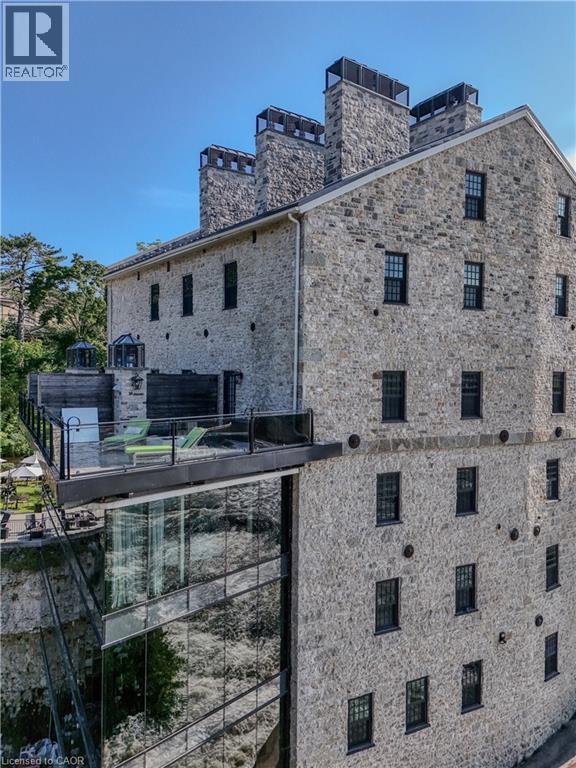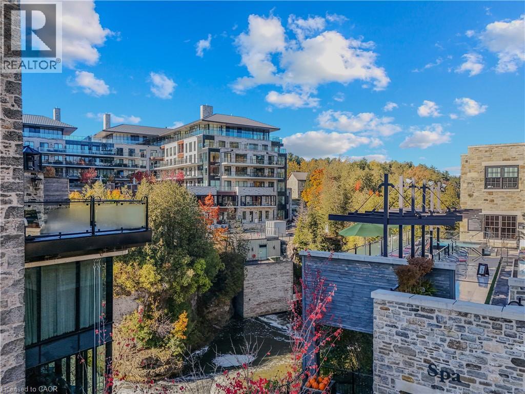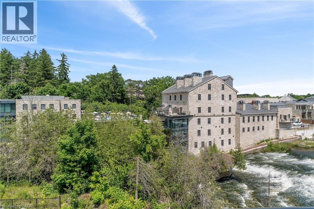 This luxurious 1,979 sq ft, 2-bedroom plus den corner suite is in the most desired location in the building. An additional 500 sq ft of outdoor living space and wrap-around windows give spectacular views in every season.. stunning water views of the Grand River, Gorgeous Elora Mill and the Scenic Tranquil views of the Elora Gorge. The main living area features a kitchen with floor-to-ceiling custom cabinetry, Upgraded Miele appliances, a walk-in pantry, a large island with a waterfall countertop, and seating for four. The spacious dining room provides ample room for a large dining table perfect for hosting dinner parties or family dinners. The bright living room is open and easily accommodates larger furniture making this suite ideal for downsizers. The impressive primary suite boasts river views, two walk-in closets, and a five-piece ensuite bath with a double vanity, a gorgeous soaker tub with chandelier and a separate shower. This ideal layout also has a second wing with an additional bedroom and bathroom for guests, providing privacy. A spacious den with a door offers a versatile bonus room, perfect for a home office, guest room, or home theater. The Luxury Elora Mill Residences offer resort-style living, complete with a concierge, lobby coffee bar, resident lounge, private dining/party room, gym, yoga studio, outdoor terrace with fire pits, and an incredible outdoor pool with spectacular river views. Just steps from Elora's charming downtown, you'll find top restaurants, shops, and cafes to explore, as well as quick access to the trails along the Elora Gorge in this amazing walkable community. Automated blinds throughout the suite, two underground parking spots and a locker complete this ideal luxury home, offering low-maintenance, resort-style living. (id:64974)