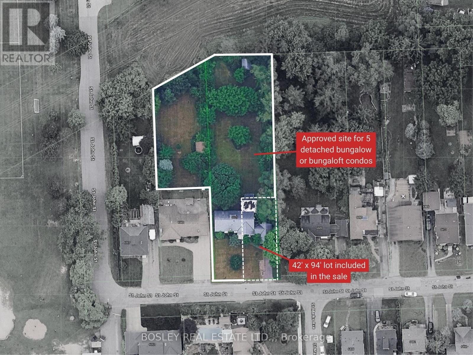 Prime development opportunity in a desirable Niagara Falls neighbourhood close to great schools, parks, shopping necessities and highway access. This 0.831-acre parcel offers approved plans to build five (5) detached vacant land condominium units, ideal for bungalow or bungaloft designs. The approved concept includes the creation of an 41.95 ft. x 94 ft. building lot, that fronts onto St. John St on the Eastern edge of the property - see the attached siteplan. The total parcel measures 83.65 feet of frontage on St. John Street with a depth of approximately 296 feet, expanding to a maximum width of 156 feet, allowing for a well-designed, low-density residential development. The successful purchaser will be required to proceed with either a Plan of Subdivision or Plan of Condominium with the City of Niagara Falls. (id:64974)