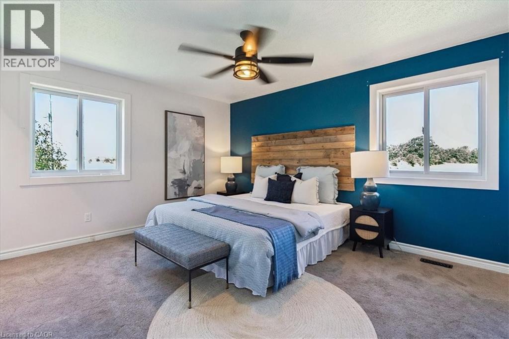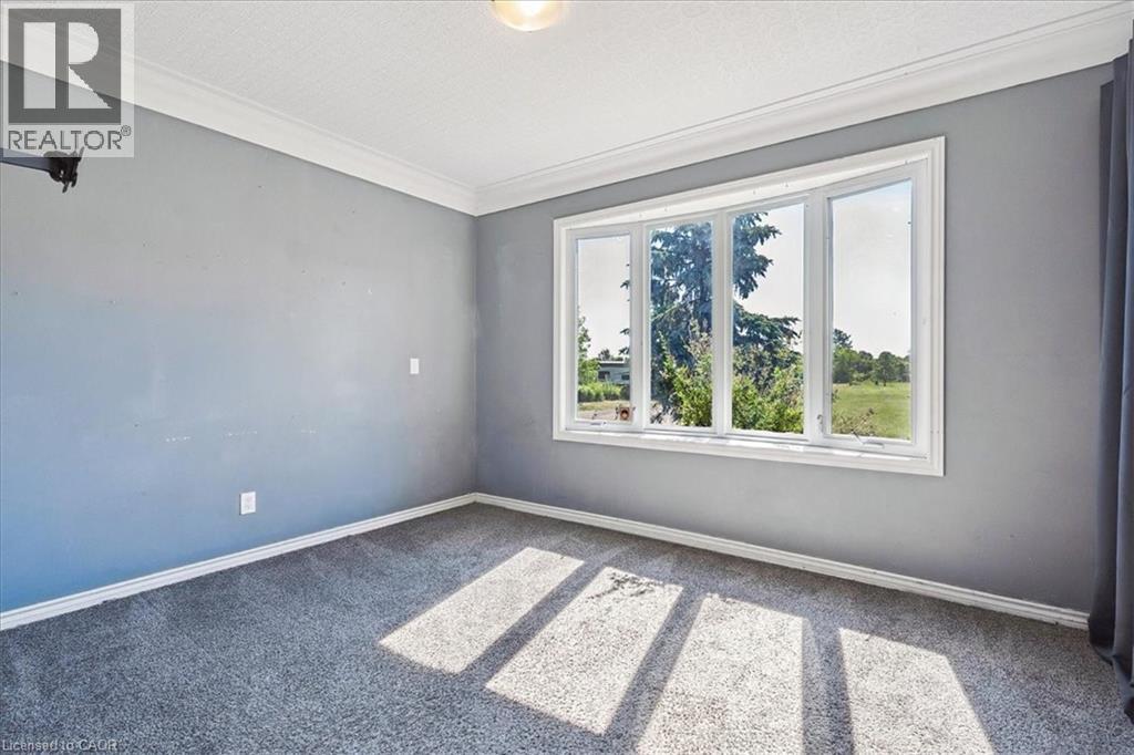 Set on just over an acre and backing onto peaceful farmland, this beautifully updated 4+1 bedroom, 4-bath bungalow delivers the perfect balance of space, privacy, and modern comfort. Nestled in a highly desirable pocket of Glanbrook, you're minutes from Hamilton, Binbrook, and Ancaster-offering effortless access to city amenities while enjoying the serenity of country living. The bright, open-concept main floor features hardwood throughout the kitchen, dining, living areas, and hallway. The updated kitchen is both stylish and functional, complete with block countertops, tile backsplash, pot lights, and a skylight that fills the space with natural light. Sliding doors from the dining room lead to the rear yard-ideal for entertaining, family gatherings, or quiet evenings outdoors. The inviting living room showcases a large bay window and a striking wood-burning fireplace with stone surround and a custom live-edge mantel. An oversized family room adds exceptional versatility with crown moulding and another sun-filled bay window. The primary suite offers a private 3-piece ensuite and a newly added walk-in closet, complemented by an updated main 4-piece bath. A brand-new powder room and refreshed front entry enhance both flow and functionality. Laundry on both the main and lower levels adds everyday convenience. A separate rear entrance leads to a fully self-contained in-law suite, renovated in 2016, featuring an open-concept kitchen and living area with pot lights throughout-perfect for extended family or excellent rental potential. Notable upgrades include 200-amp electrical service, new LED pot lights, a 2024 heat pump and air conditioning system, and a complete water purification system with UV and charcoal filtration. This is a rare opportunity to enjoy modern living surrounded by natural beauty, in a prime location just outside the city-where comfort, flexibility, and lifestyle come together seamlessly. (id:64974)