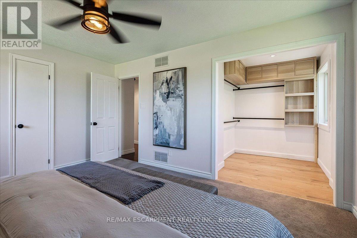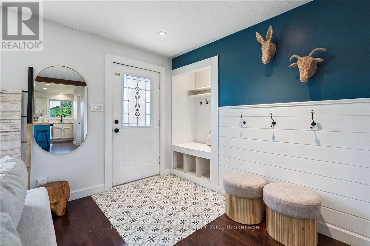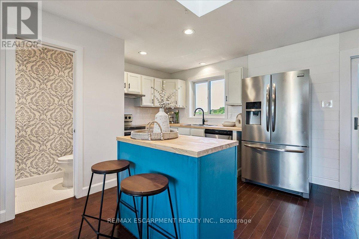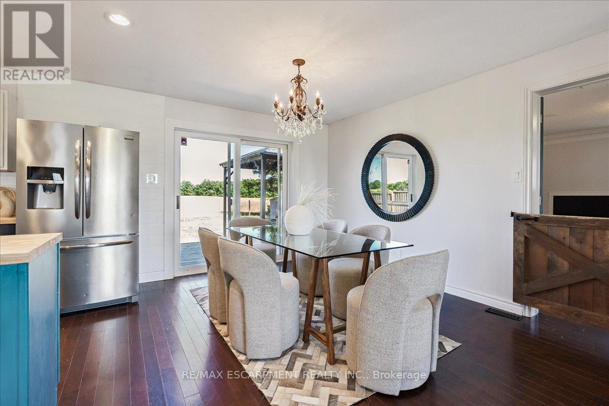 Set on just over an acre and backing onto peaceful farmland, this beautifully updated 4+1 bedroom, 4-bath bungalow delivers the perfect balance of space, privacy, and modern comfort. Nestled in a highly desirable pocket of Glanbrook, you're minutes from Hamilton, Binbrook, and Ancaster-offering effortless access to city amenities while enjoying the serenity of country living. The bright, open-concept main floor features hardwood throughout the kitchen, dining, living areas, and hallway. The updated kitchen is both stylish and functional, complete with block countertops, tile backsplash, pot lights, and a skylight that fills the space with natural light. Sliding doors from the dining room lead to the rear yard-ideal for entertaining, family gatherings, or quiet evenings outdoors. The inviting living room showcases a large bay window and a striking wood-burning fireplace with stone surround and a custom live-edge mantel. An oversized family room adds exceptional versatility with crown moulding and another sun-filled bay window. The primary suite offers a private 3-piece ensuite and a newly added walk-in closet, complemented by an updated main 4-piece bath. A brand-new powder room and refreshed front entry enhance both flow and functionality. Laundry on both the main and lower levels adds everyday convenience. A separate rear entrance leads to a fully self-contained in-law suite, renovated in 2016, featuring an open-concept kitchen and living area with potlights throughout-perfect for extended family or excellent rental potential. Notable upgrades include 200-amp electrical service, new LED pot lights, a 2024 heat pump and air conditioning system, and a complete water purification system with UV and charcoal filtration. This is a rare opportunity to enjoy modern living surrounded by natural beauty, in a prime location just outside the city-where comfort, flexibility, and lifestyle come together seamlessly. (id:64974)