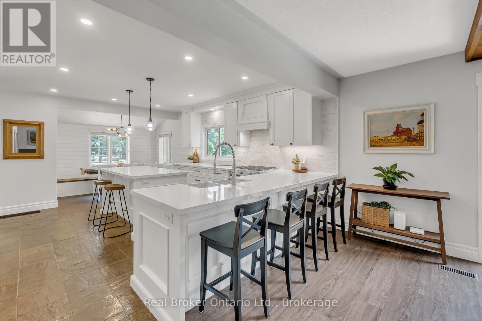 Welcome to 6566 Concession Rd 4, a beautifully updated country retreat offering the perfect blend of modern comfort and rural charm. This 3- bedroom, 3-bathroom home sits on a private, landscaped lot in the heart of Puslinch - just 5 minutes to Guelph, less than 5 minutes to Cambridge, and with quick access to the 401 for commuters. Families will appreciate being in the Kortright Hills Public School catchment (JKGrade 8), offering excellent education within reach. Inside, the heart of the home is the bright, open-concept kitchen, featuring quartz countertops, a large island, custom cabinetry, and stainless steel appliances. The adjoining living area is equally inviting, with exposed wood beams and a cozy fireplace that makes it perfect for gathering. Extensive renovations over time include a fully finished basement, a luxurious new ensuite bathroom, and heated floors in the kitchen, basement, ensuite, and kid's bathroom - ensuring comfort throughout the seasons. Step outside to your own private oasis. The fenced, fully landscaped backyard includes a covered patio, outdoor kitchen, and hot tub - perfect for entertaining or relaxing in peace. A standout feature of the property is the detached garage with both front and rear garage doors, offering added functionality, storage, and easy access for yard equipment or recreational vehicles. Additional highlights include a drilled well (approx. 120+ ft deep with excellent water quality), a septic system installed around 2015, and the rare benefit of natural gas on a country property. With modern conveniences, scenic surroundings, and an unbeatable location close to top schools, trails, and amenities, this move-in ready home offers an exceptional lifestyle opportunity in one of Wellington County's most desirable rural communities. (id:64974)