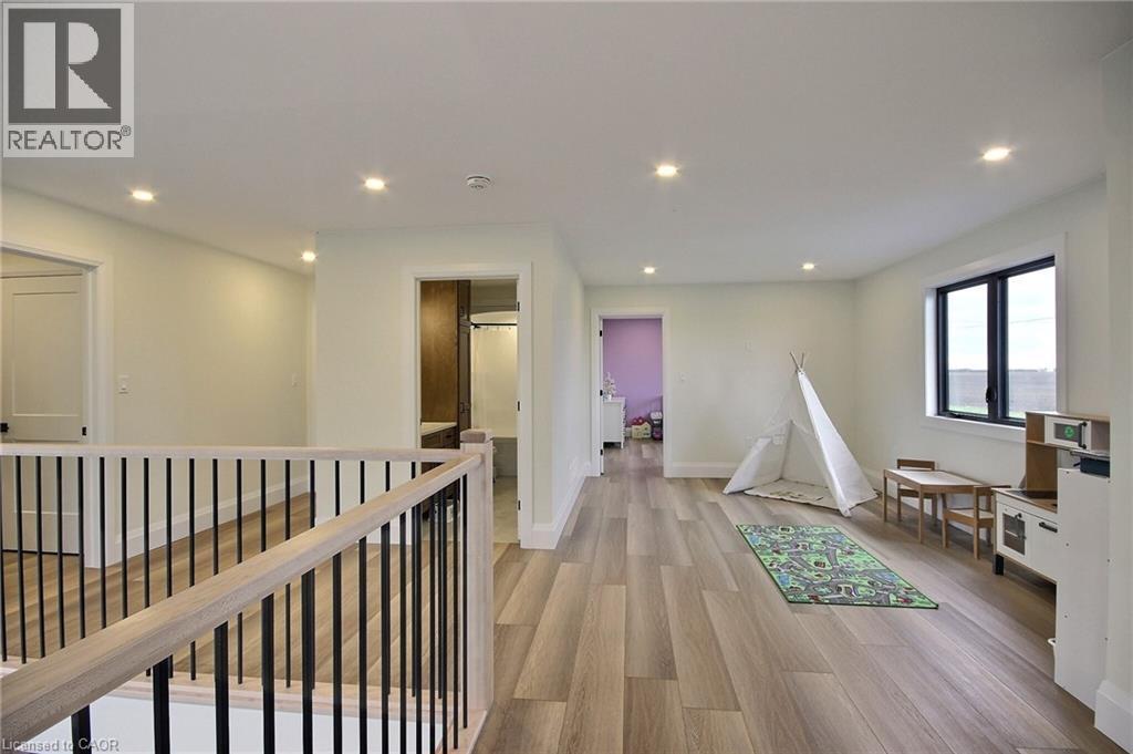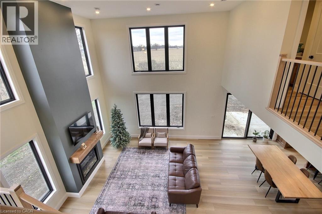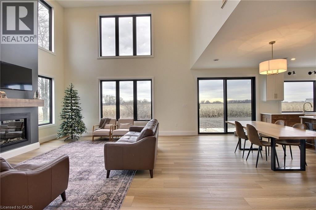 Country living at its finest! This exceptional home features a custom kitchen with a pot filler and picturesque views overlooking serene farm fields. The open-concept main level boasts elevated ceilings and a stately fireplace, along with a convenient main-area office perfect for working from home. Enjoy infloor heating throughout the main level and garage—ideal for the ultimate, trusscore-lined man cave. The upper level offers an additional family room, three generously sized bedrooms, and an open view of the main living space below. Large windows bathe every room in natural light, while the primary suite showcases a beautiful ensuite and all bedrooms include spacious walk-in closets. (id:64974)