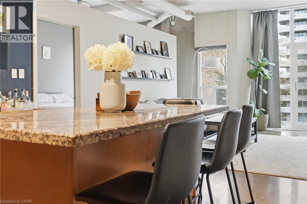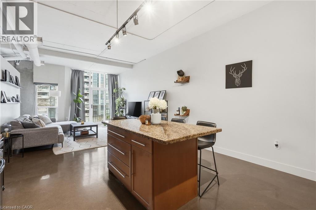 Welcome to Core Lofts, a unique conversion of the historic Bell Canada building in the heart of downtown Hamilton. This spacious Lincoln model offers approximately 1,100 square feet of loft-style living with 10+ ft ceilings, floor-to-ceiling windows and polished concrete floors that give the space its signature feel. Filled with great afternoon light from its west-facing exposure, the unit features a Juliet balcony and an open layout centred around a spacious kitchen with granite counters, newer appliances and an oversized island. Two well-sized bedrooms, updated bathrooms and in-suite laundry complete the space. Condo fees cover nearly everything, and a rented parking space is available for $200/month, with the option to assume. The building offers a rooftop patio with BBQs and city views, along with a gym and party room – all just steps to transit, the GO station, restaurants and everything downtown has to offer. Don’t be TOO LATE*! *REG TM. RSA. (id:64974)
