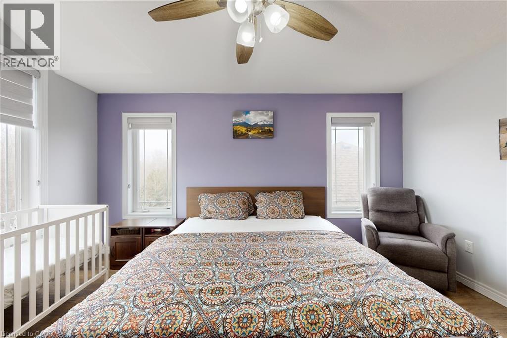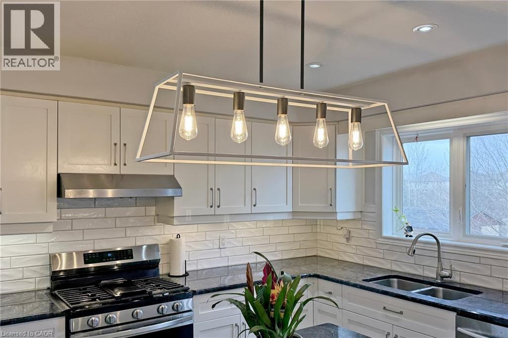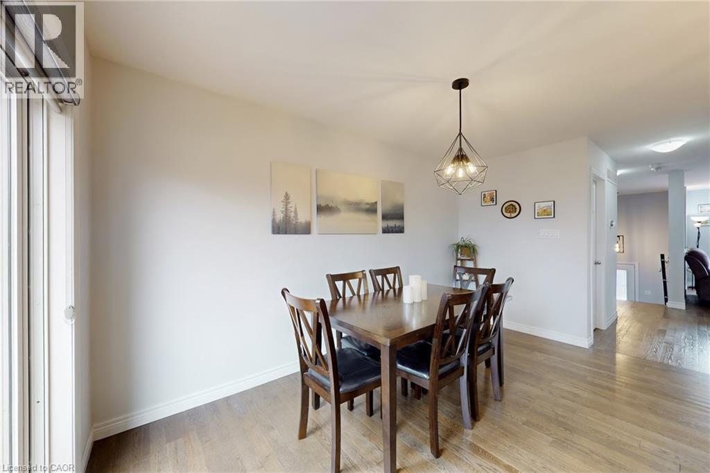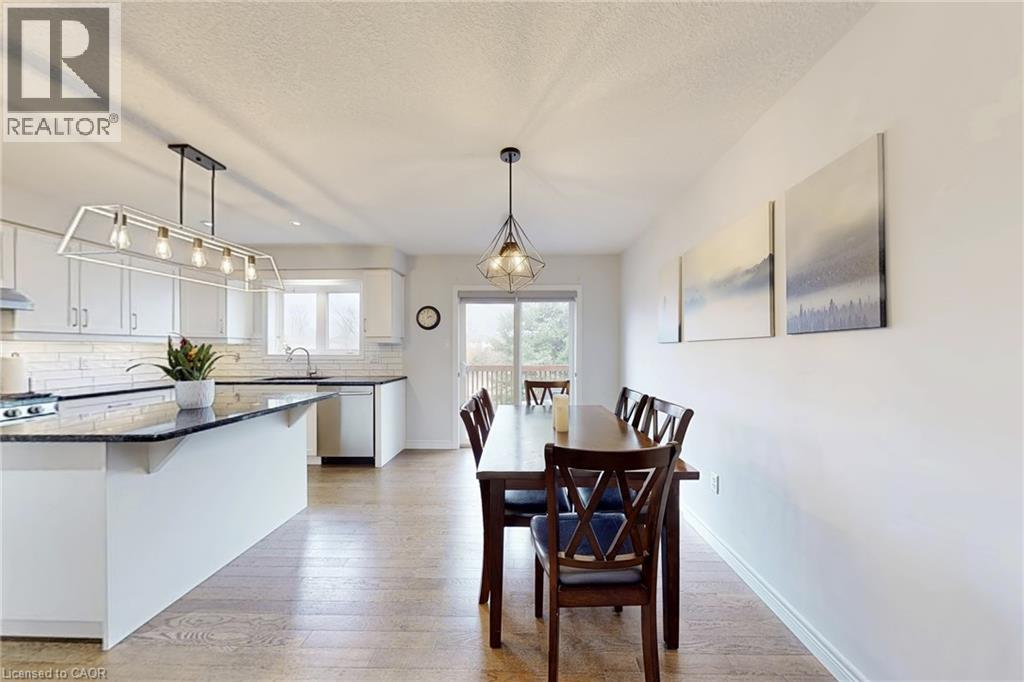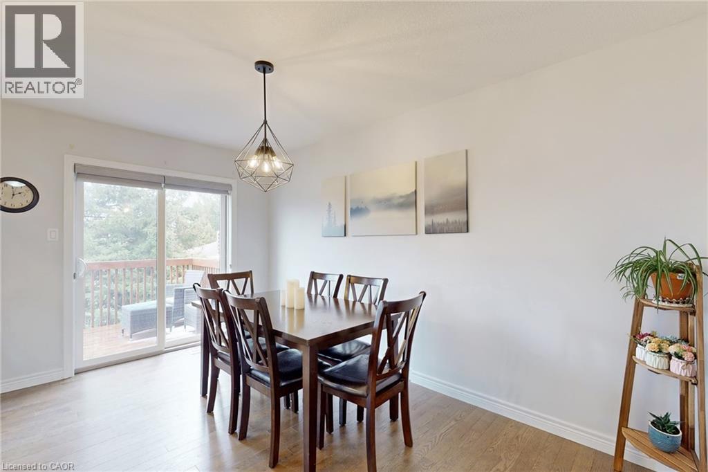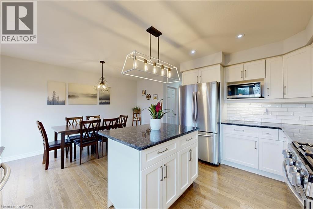 Executive condo townhouse in the modern Natura complex, offering move in ready living with clear pride of ownership. Built in 2016, this home features a spacious eat in kitchen with granite countertops, upgraded backsplash, stainless steel appliances, and a new 2025 gas stove. The dinette opens to a lovely deck overlooking the backyard. The bright living room includes hardwood floors and large windows, with a convenient powder room on the main level. Upstairs is a spacious, carpet-free primary bedroom with a walk in closet, massive windows, hardwood floors, and a 4 pc ensuite, plus two additional bedrooms and a 4 pc main bath. The finished walkout basement adds a bright recreation room with access to the fenced yard. Recent upgrades include zebra blinds (2025) and a new water heater (2025). Located on a quiet, family oriented street near parks, schools, grocery stores, LCBO, Victoria Road Rec Centre, East Guelph Medical Clinic, Guelph Lake, and transit routes 13, 17, and 18. (id:64974)