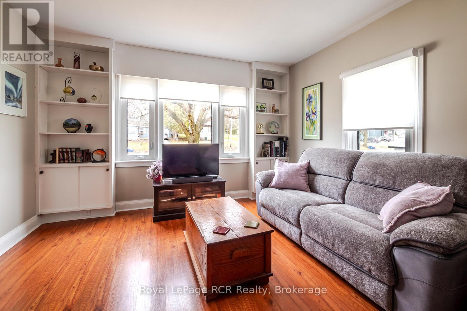 Welcome to this well-maintained 1.5 storey home offering a clean, functional layout with thoughtful updates throughout. With generous storage, bright living spaces, and a private backyard retreat, this property is ideal for families, first-time buyers, or anyone looking for a move-in-ready home close to amenities. The main floor features a bright kitchen with recently updated cabinetry, quartz countertops, and a large window that fills the space with natural light. The spacious dining area is perfect for family meals and entertaining, while the comfortable living room offers a beautiful oversized window and charming built-in shelving. Upstairs, you'll find three bedrooms and a refreshed 4-piece bathroom complete with a new tub surround and modern vanity. The full semi-finished basement adds excellent versatility, offering ample storage, a 2-piece bathroom, laundry area, and a dedicated workshop space. Recent updates and features include a re-shingled roof (2020), new cement driveway, new eavestroughs, owned water heater (2024), forced-air natural gas furnace with central air conditioning, and Bell Fibre internet availability. Step outside to enjoy the private backyard oasis featuring mature gardens, two storage sheds, and a screened-in gazebo - perfect for relaxing summer evenings. Conveniently located close to shopping, schools, the YMCA of Owen Sound Grey Bruce, the Grey Bruce Health Services hospital, and other everyday amenities, this home offers comfort, convenience, and excellent value. A solid opportunity in a great location - contact your REALTOR to book your showing today! (id:64974)