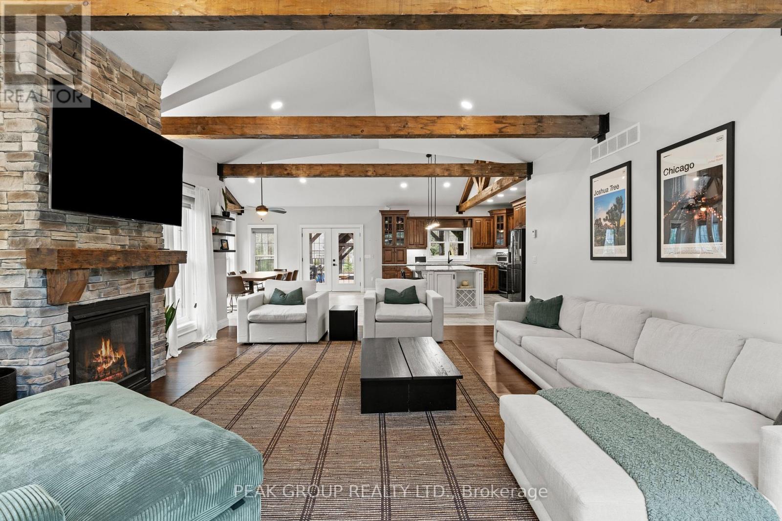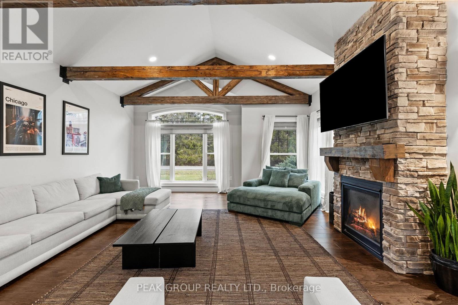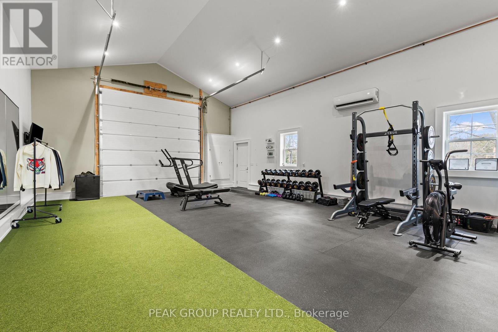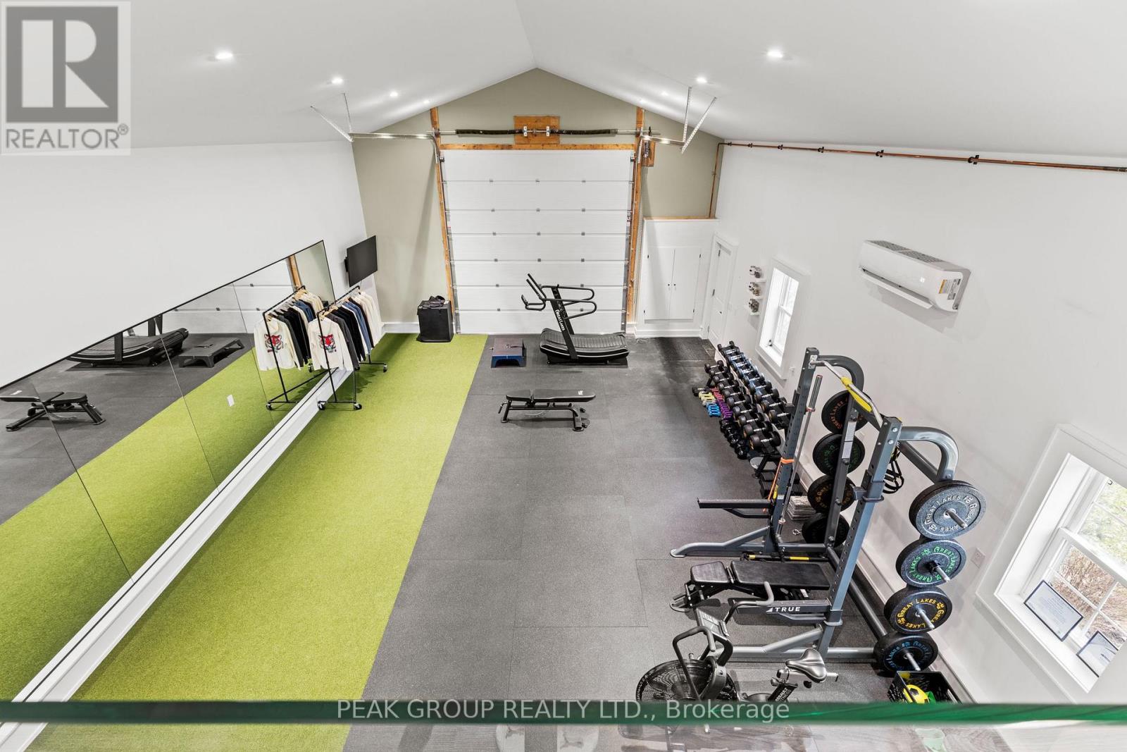 Welcome to luxury living in the heart of Pelham where privacy, charm, and lifestyle come together on a beautifully manicured property. From the moment you arrive, you're greeted by mature trees, expansive u-shaped driveway, and a stunning home featuring a wraparound porch-perfect for enjoying peaceful mornings and scenic surroundings. Step inside to a bright, open-concept main floor highlighted by soaring cathedral ceilings, exposed wood beams, and oversized windows that flood the space with natural light. The thoughtfully designed kitchen features a large island and generous dining area ideal for hosting, all seamlessly connected to a warm and inviting living room with a gas fireplace. Walk out from the kitchen to a covered deck built for entertaining, complete with a hot tub and views of the expansive backyard-your own private outdoor retreat. The main level also offers exceptional functionality, including a spacious mudroom with laundry, ample storage, separate backyard access, and entry to the attached 3-car garage. A guest bathroom and a main floor primary suite with a luxurious 5-piece ensuite provides convenient, main-level living. Upstairs, a loft-style office overlooks the staircase and leads to three additional bedrooms and a well-appointed 4-piece bathroom-perfect for growing families or guests. The fully finished basement extends your living space with a large open-concept recreation room, an additional bedroom, abundant storage, separate entrance to the garage, and a spacious wraparound cold cellar. A standout feature of this property is the beautifully finished accessory dwelling unit , currently set up as a premium home gym. Complete with a glass-tiled shower, loft space with glass railings, heating and cooling split system, and a garage door for seamless indoor-outdoor living. This versatile space offers endless possibilities. Whether used as a gym, future pool house, workshop, studio, or for the car enthusiast, this is a rare and valuable addition. (id:64974)