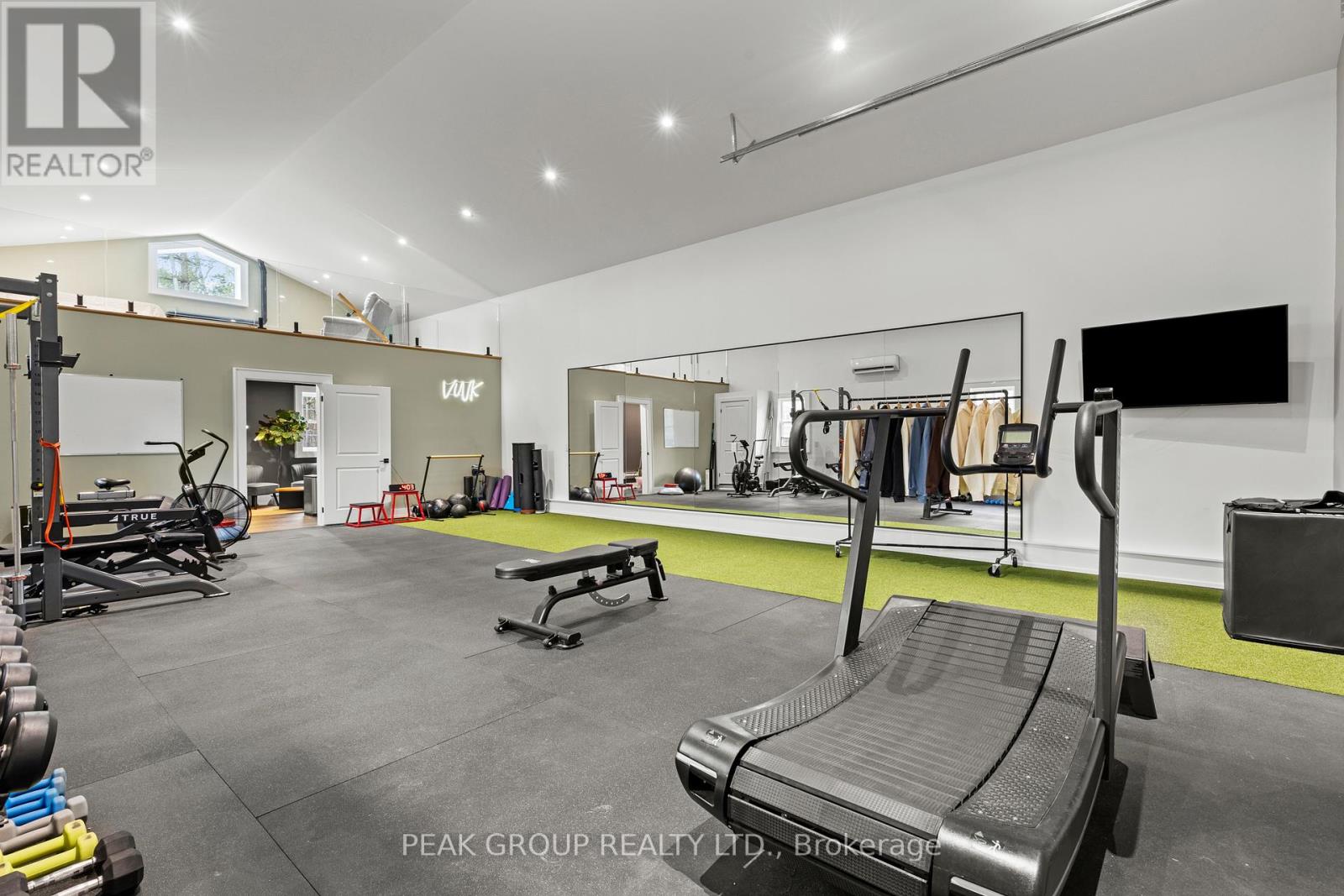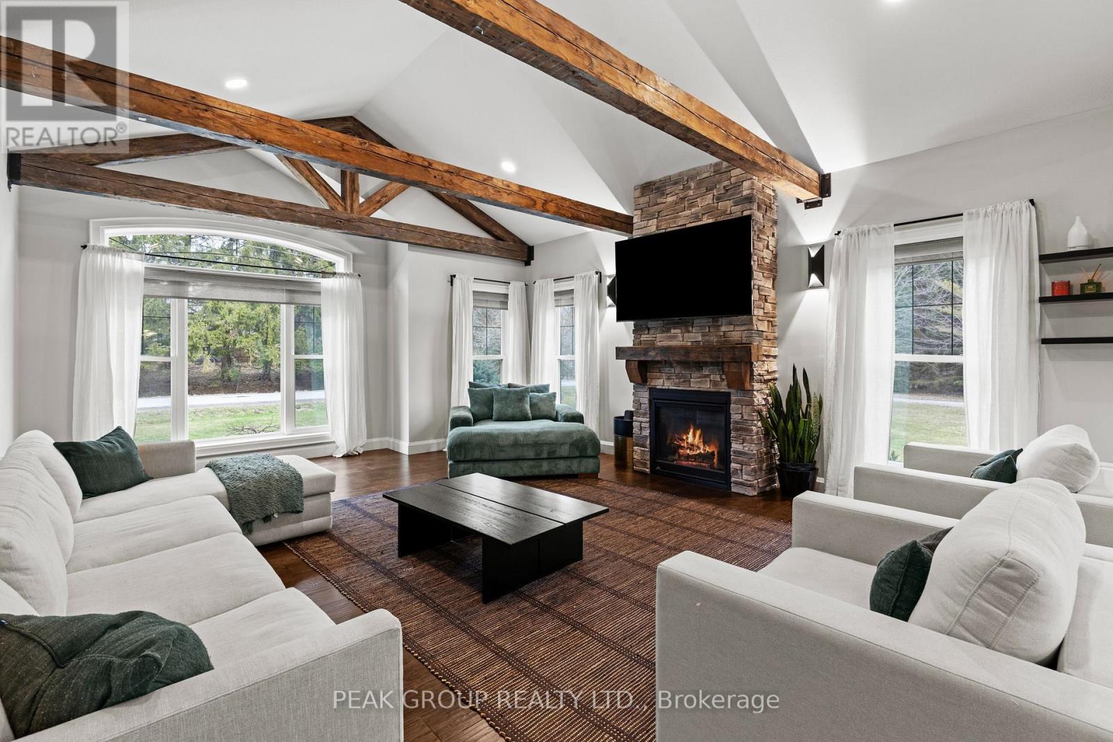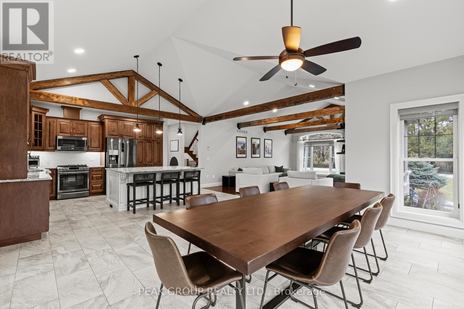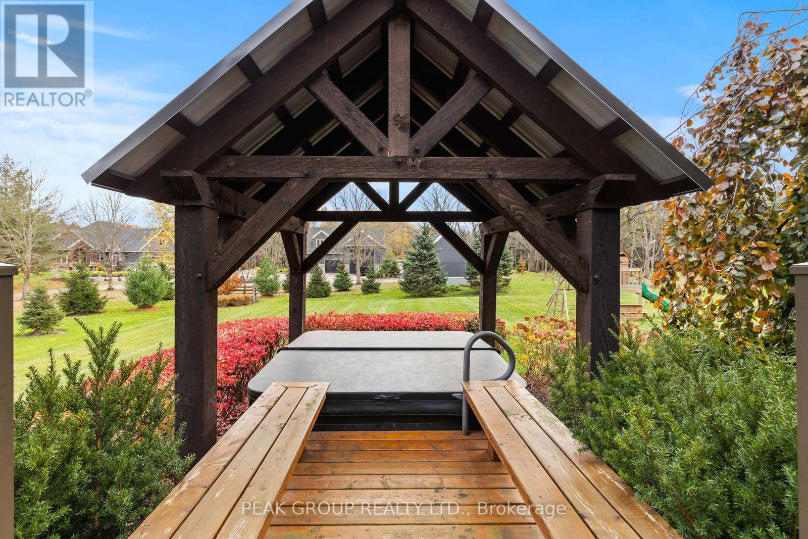 Welcome to luxury living in the heart of Pelham where privacy, charm, and lifestyle come together on a beautifully manicured property. From the moment you arrive, you're greeted by mature trees, expansive u-shaped driveway, and a stunning home featuring a wraparound porch-perfect for enjoying peaceful mornings and scenic surroundings. Step inside to a bright, open-concept main floor highlighted by soaring cathedral ceilings, exposed wood beams, and oversized windows that flood the space with natural light. The thoughtfully designed kitchen features a large island and generous dining area ideal for hosting, all seamlessly connected to a warm and inviting living room with a gas fireplace. Walk out from the kitchen to a covered deck built for entertaining, complete with a hot tub and views of the expansive backyard-your own private outdoor retreat. The main level also offers exceptional functionality, including a spacious mudroom with laundry, ample storage, separate backyard access, and entry to the attached 3-car garage. A guest bathroom and a main floor primary suite with a luxurious 5-piece ensuite provides convenient, main-level living. Upstairs, a loft-style office overlooks the staircase and leads to three additional bedrooms and a well-appointed 4-piece bathroom-perfect for growing families or guests. The fully finished basement extends your living space with a large open-concept recreation room, an additional bedroom, abundant storage, separate entrance to the garage, and a spacious wraparound cold cellar. A standout feature of this property is the beautifully finished accessory dwelling unit , currently set up as a premium home gym. Complete with a glass-tiled shower, loft space with glass railings, heating and cooling split system, and a garage door for seamless indoor-outdoor living. This versatile space offers endless possibilities. Whether used as a gym, future pool house, workshop, studio, or for the car enthusiast, this is a rare and valuable addition. (id:64974)