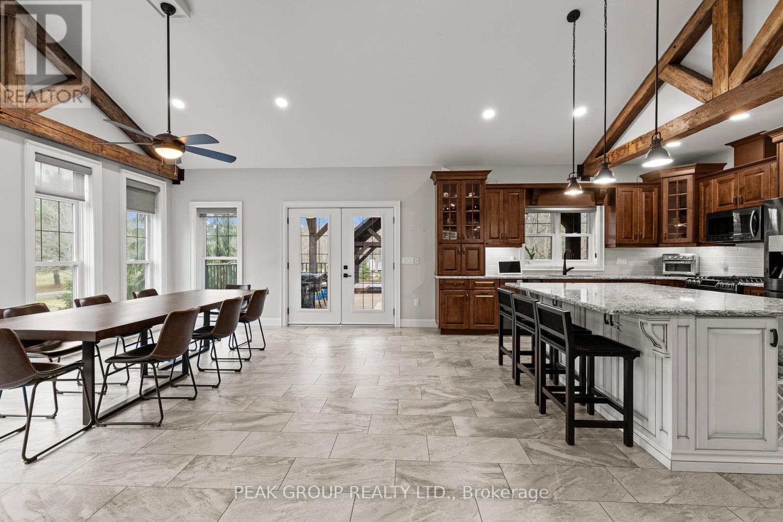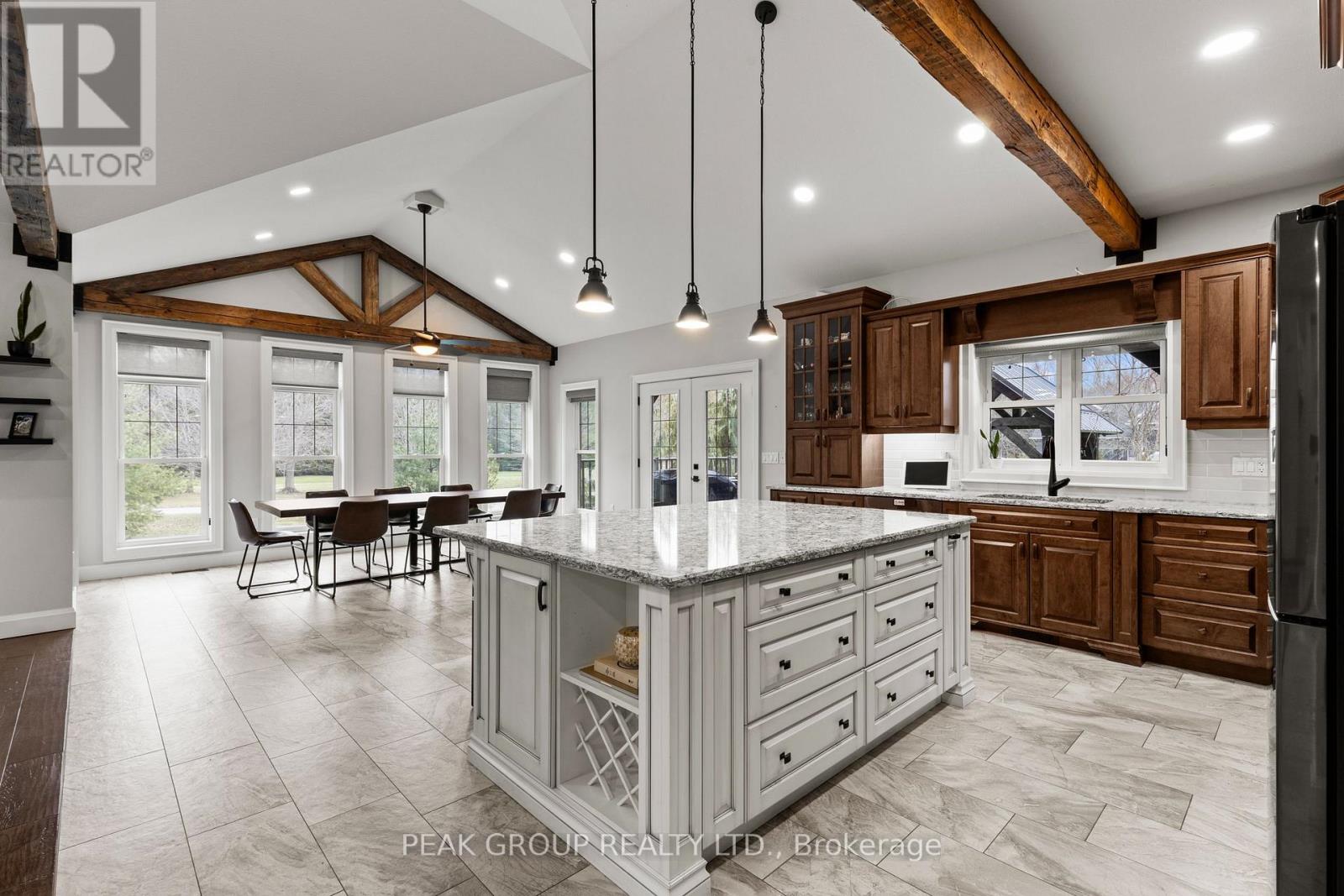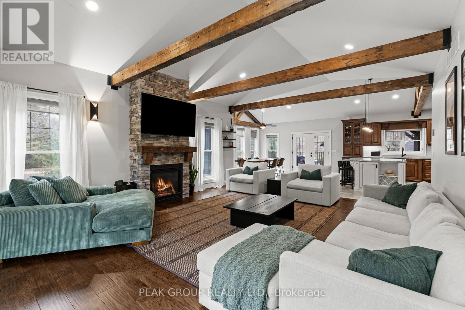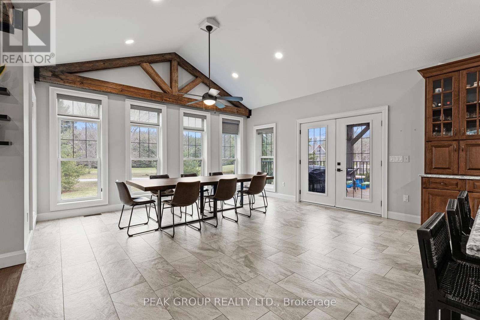 Welcome to luxury living in the heart of Pelham where privacy, charm, and lifestyle come together on a beautifully manicured property. From the moment you arrive, you're greeted by mature trees, expansive u-shaped driveway, and a stunning home featuring a wraparound porch-perfect for enjoying peaceful mornings and scenic surroundings. Step inside to a bright, open-concept main floor highlighted by soaring cathedral ceilings, exposed wood beams, and oversized windows that flood the space with natural light. The thoughtfully designed kitchen features a large island and generous dining area ideal for hosting, all seamlessly connected to a warm and inviting living room with a gas fireplace. Walk out from the kitchen to a covered deck built for entertaining, complete with a hot tub and views of the expansive backyard-your own private outdoor retreat. The main level also offers exceptional functionality, including a spacious mudroom with laundry, ample storage, separate backyard access, and entry to the attached 3-car garage. A guest bathroom and a main floor primary suite with a luxurious 5-piece ensuite provides convenient, main-level living. Upstairs, a loft-style office overlooks the staircase and leads to three additional bedrooms and a well-appointed 4-piece bathroom-perfect for growing families or guests. The fully finished basement extends your living space with a large open-concept recreation room, an additional bedroom, abundant storage, separate entrance to the garage, and a spacious wraparound cold cellar. A standout feature of this property is the beautifully finished accessory dwelling unit , currently set up as a premium home gym. Complete with a glass-tiled shower, loft space with glass railings, heating and cooling split system, and a garage door for seamless indoor-outdoor living. This versatile space offers endless possibilities. Whether used as a gym, future pool house, workshop, studio, or for the car enthusiast, this is a rare and valuable addition. (id:64974)