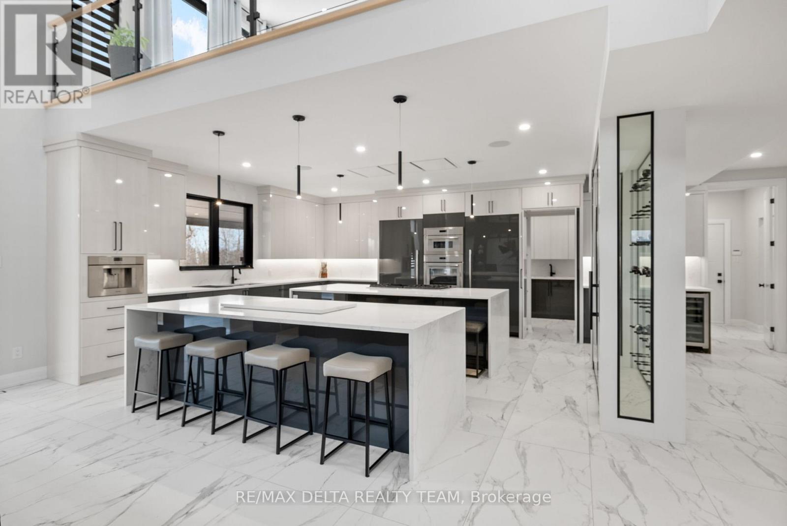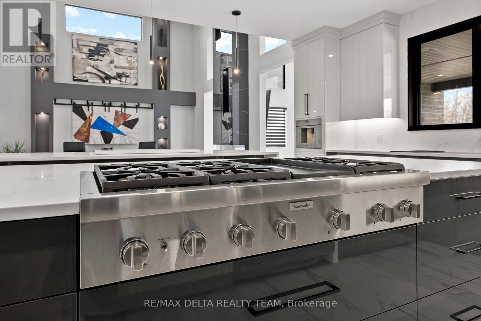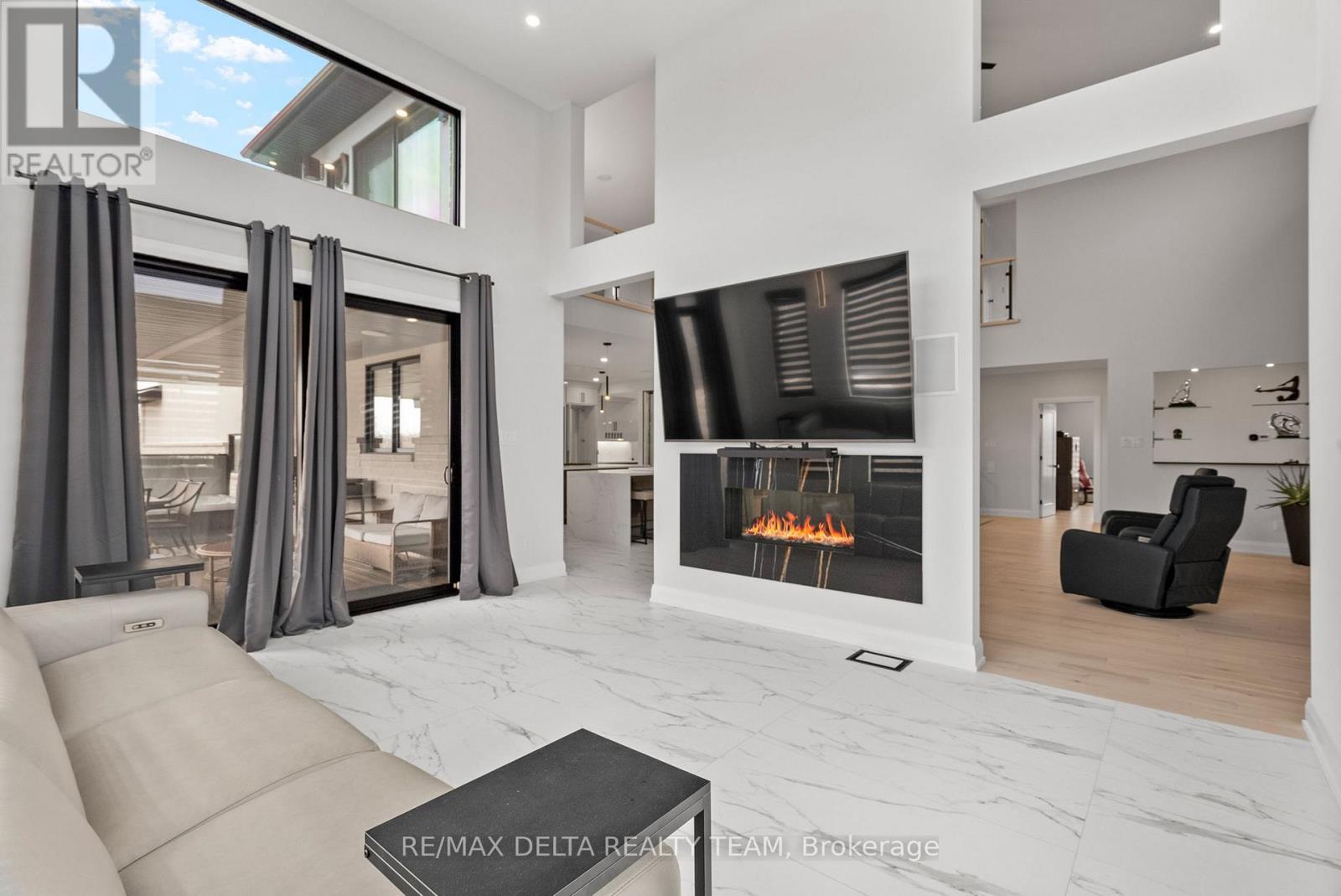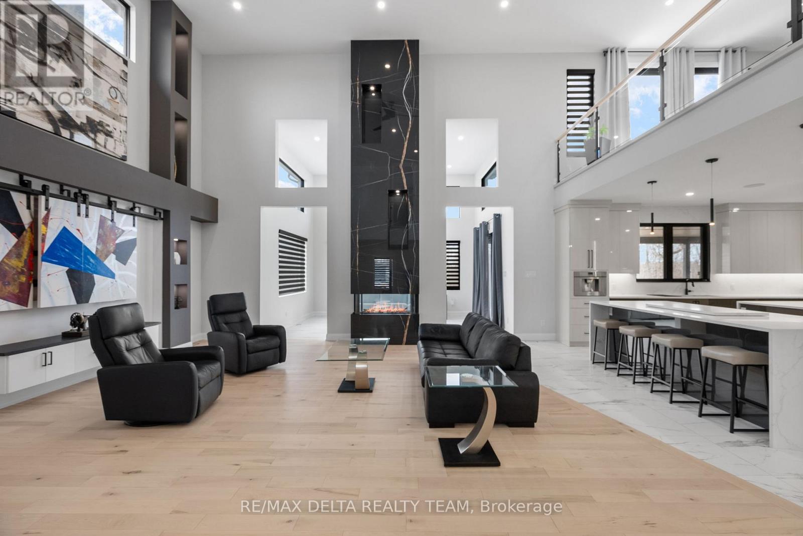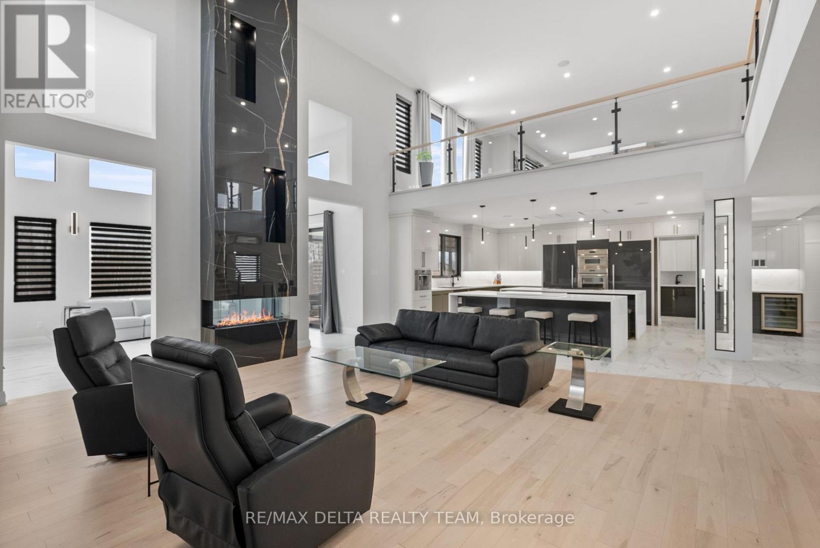 Tailored for the executive lifestyle, perfected for family living. Welcome to 663 Ballycastle Crescent a showstopping modern residence with commanding curb appeal, set on a quiet crescent lined with prestigious homes and backing onto peaceful open space. With over 5,700 sq. ft. of refined living space, this 5-bedroom, 6-bathroom home is a true architectural statement. The exterior offers bold, clean lines and grand scale, while inside, elegance meets innovation. Soaring 20-foot ceilings and a dramatic open-riser staircase set the tone in the main living area anchored by a double-sided porcelain-wrapped fireplace and lighted artwork niches. Maple and leather-finished porcelain floors run throughout the main level. The kitchen is both luxurious and functional, with dual waterfall quartz islands, Thermador appliances, a walk-in pantry, and a striking glass wine feature. A spacious main floor suite with walk-in closet and ensuite offers flexible comfort for guests or extended family. Upstairs, an 830 sq. ft. loft overlooks the great room, connecting two bedrooms each with private ensuites and walk-ins plus a bar area. The 540 sq. ft. primary suite offers a stunning gas fireplace, a dream walk-in closet with quartz island and a spa-inspired ensuite with freestanding tub, porcelain finishes, and custom-lit glass shower with rain heads and jets. The lower level features radiant-heated floors, a fireplace lounge, wet bar, theater, fifth bedroom and full bath, and a 900 sq. ft. commercial-grade gym with mirrors and glass dividers. Built-in media and smart systems run throughout. A 1,200 sq. ft. triple garage offers an oversized bay, loft storage, and backyard access. Two expansive decks add outdoor living space. Minutes from the new Hard Rock Casino and surrounded by luxury. This is a home that makes a statement. (id:64974)