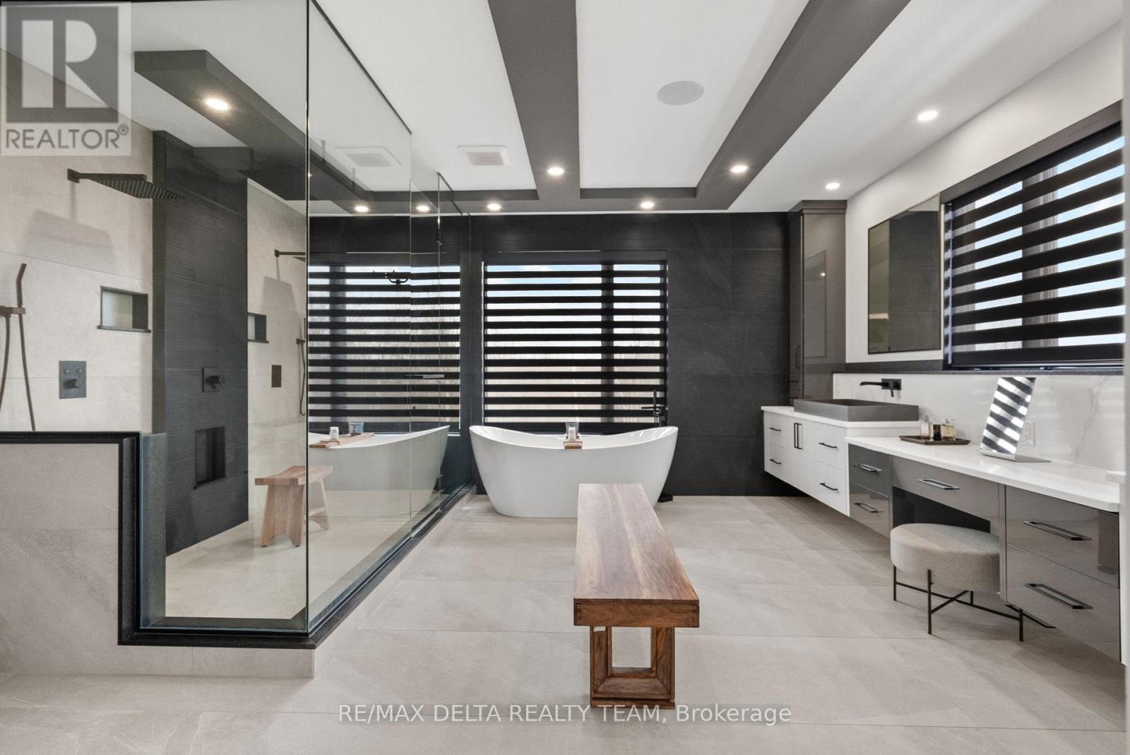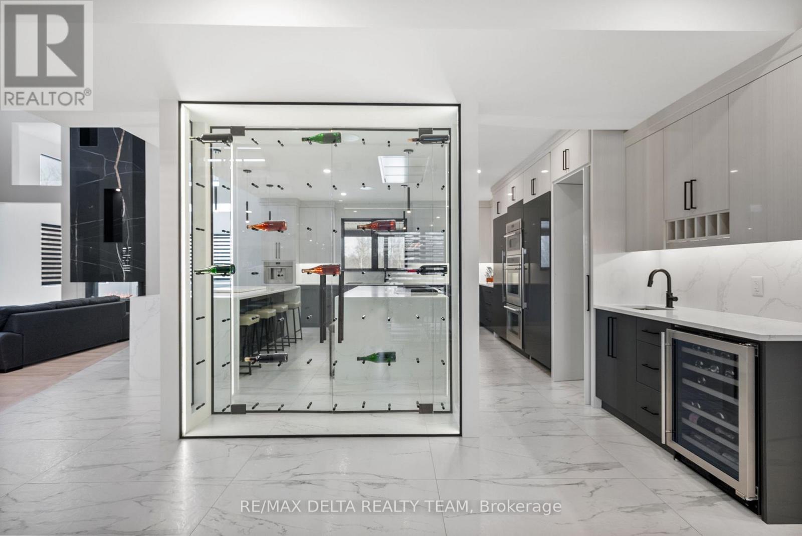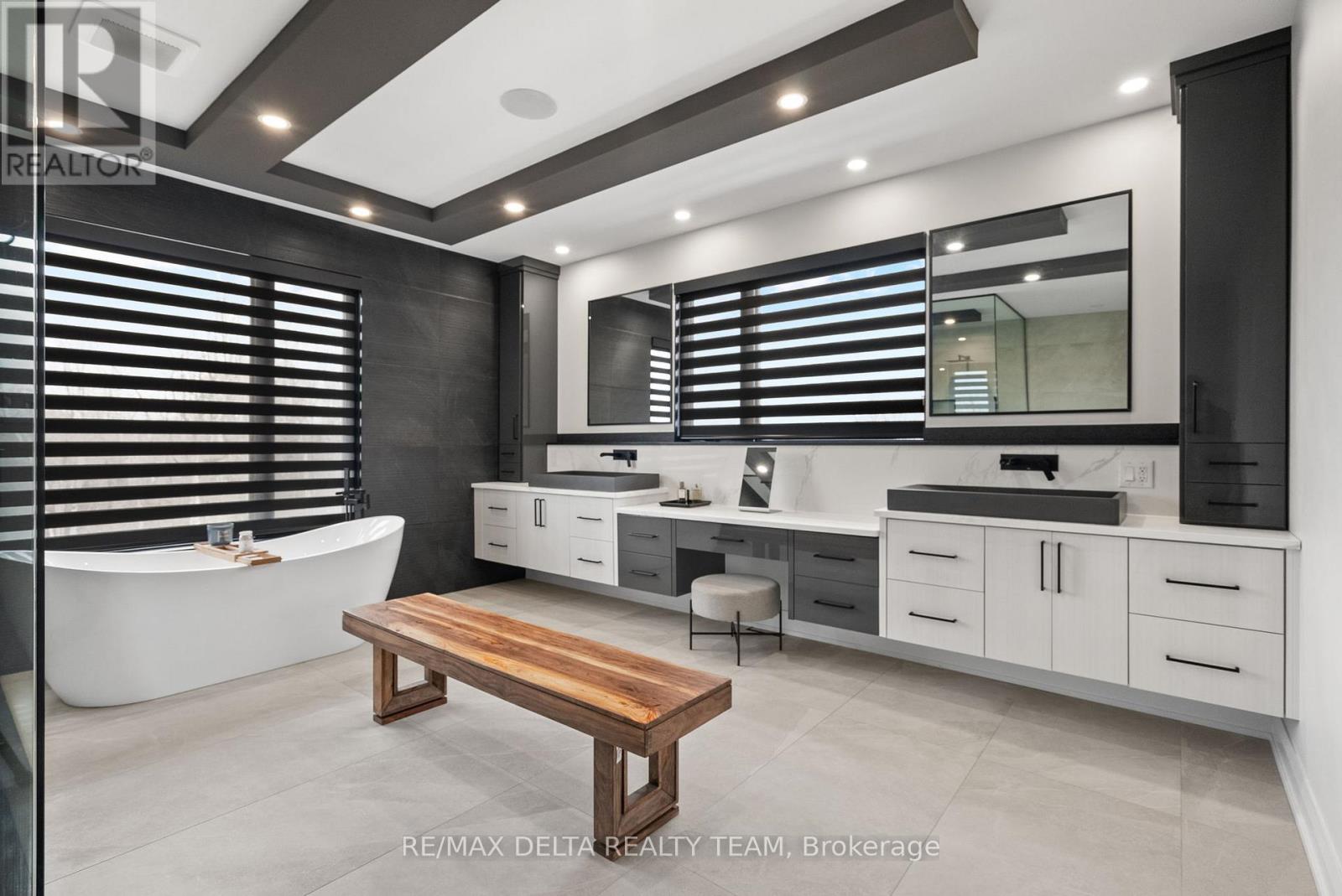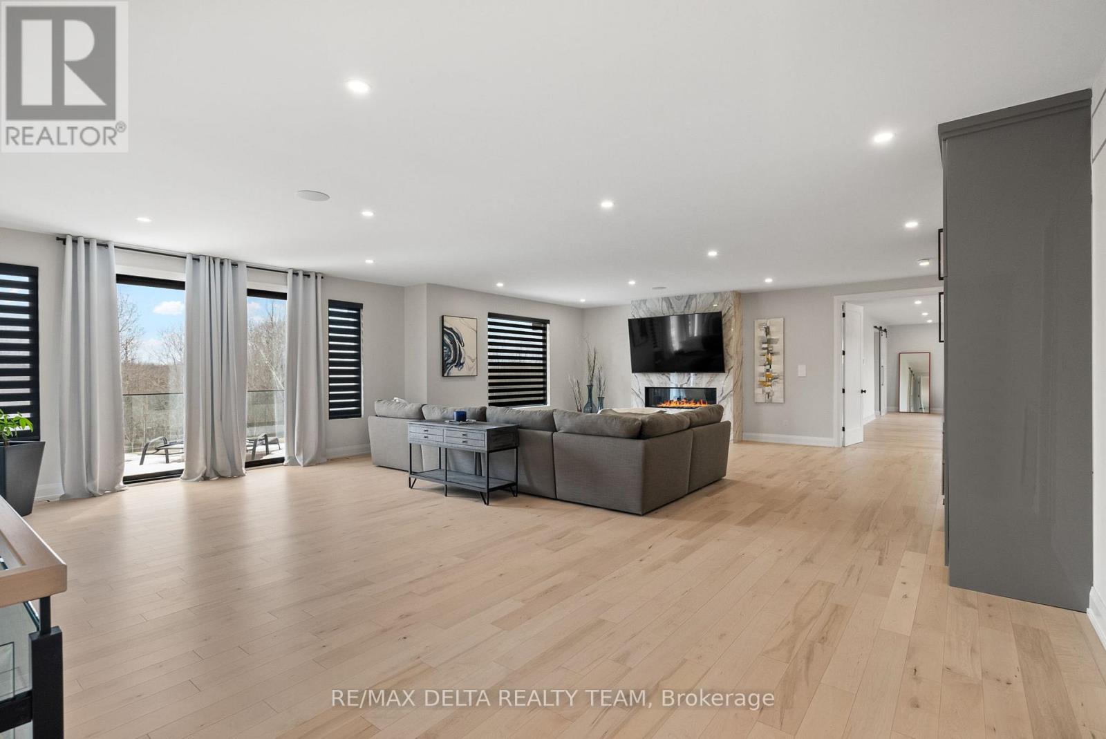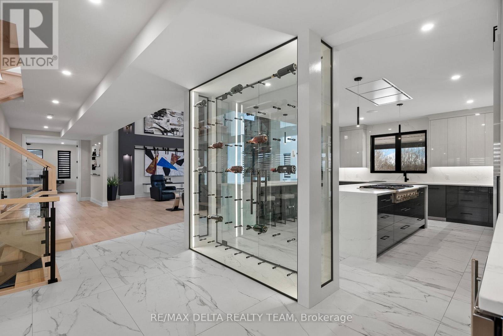 Tailored for the executive lifestyle, perfected for family living. Welcome to 663 Ballycastle Crescent a showstopping modern residence with commanding curb appeal, set on a quiet crescent lined with prestigious homes and backing onto peaceful open space. With over 5,700 sq. ft. of refined living space, this 5-bedroom, 6-bathroom home is a true architectural statement. The exterior offers bold, clean lines and grand scale, while inside, elegance meets innovation. Soaring 20-foot ceilings and a dramatic open-riser staircase set the tone in the main living area anchored by a double-sided porcelain-wrapped fireplace and lighted artwork niches. Maple and leather-finished porcelain floors run throughout the main level. The kitchen is both luxurious and functional, with dual waterfall quartz islands, Thermador appliances, a walk-in pantry, and a striking glass wine feature. A spacious main floor suite with walk-in closet and ensuite offers flexible comfort for guests or extended family. Upstairs, an 830 sq. ft. loft overlooks the great room, connecting two bedrooms each with private ensuites and walk-ins plus a bar area. The 540 sq. ft. primary suite offers a stunning gas fireplace, a dream walk-in closet with quartz island and a spa-inspired ensuite with freestanding tub, porcelain finishes, and custom-lit glass shower with rain heads and jets. The lower level features radiant-heated floors, a fireplace lounge, wet bar, theater, fifth bedroom and full bath, and a 900 sq. ft. commercial-grade gym with mirrors and glass dividers. Built-in media and smart systems run throughout. A 1,200 sq. ft. triple garage offers an oversized bay, loft storage, and backyard access. Two expansive decks add outdoor living space. Minutes from the new Hard Rock Casino and surrounded by luxury. This is a home that makes a statement. (id:64974)