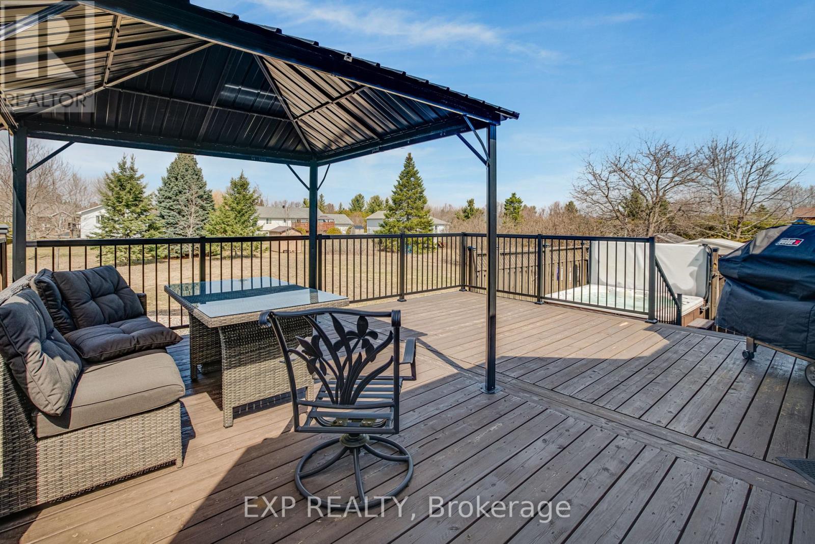 Welcome to this stunning luxury bungalow nestled in the highly sought-after community of Greely, where comfort, elegance, and space come together beautifully.From the moment you step inside, you're greeted by a grand, inviting foyer that sets the tone for the rest of the home. A versatile front living room with impressive architectural columns offers endless possibilities-perfect as a formal sitting area, home office, or even an easily convertible bedroom.The heart of the home features a warm and inviting family room with a natural gas fireplace and soaring cathedral ceilings that flow seamlessly into the dining area and kitchen. The gourmet kitchen is a dream for any home chef, offering abundant counter space, a reverse osmosis system on tap, ample storage, and a large pantry for ultimate convenience. Entertaining is effortless with easy access to the patio, BBQ area, and garage, complete with a practical mudroom and closet.Throughout the main floor, you'll find impeccable hardwood flooring, elegant crown molding, and California shutters, adding timeless sophistication to every space.The spacious primary suite is a true retreat, featuring two walk-in closets and a beautifully renovated ensuite bathroom. An additional bedroom and full bathroom complete the main level.Downstairs, the fully finished basement expands your living space with an extra bedroom, a convenient cheater ensuite, a stylish wet bar, and a massive storage/mechanical room-perfect for entertaining or hosting guests.Set on a nearly half-acre lot in a quiet, family-friendly neighborhood, the outdoor space is just as impressive. Enjoy relaxing evenings in the hot tub, unwind under the gazebo, and take advantage of the peaceful surroundings.Ideally located close to parks, schools, and amenities, and just 25 minutes from Ottawa, this exceptional property offers the perfect balance of tranquility and convenience.A rare opportunity you won't want to miss-come experience it for yourself. (id:64974)