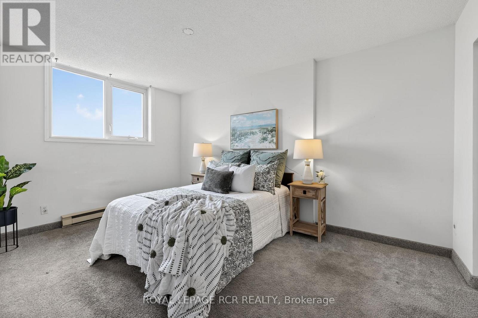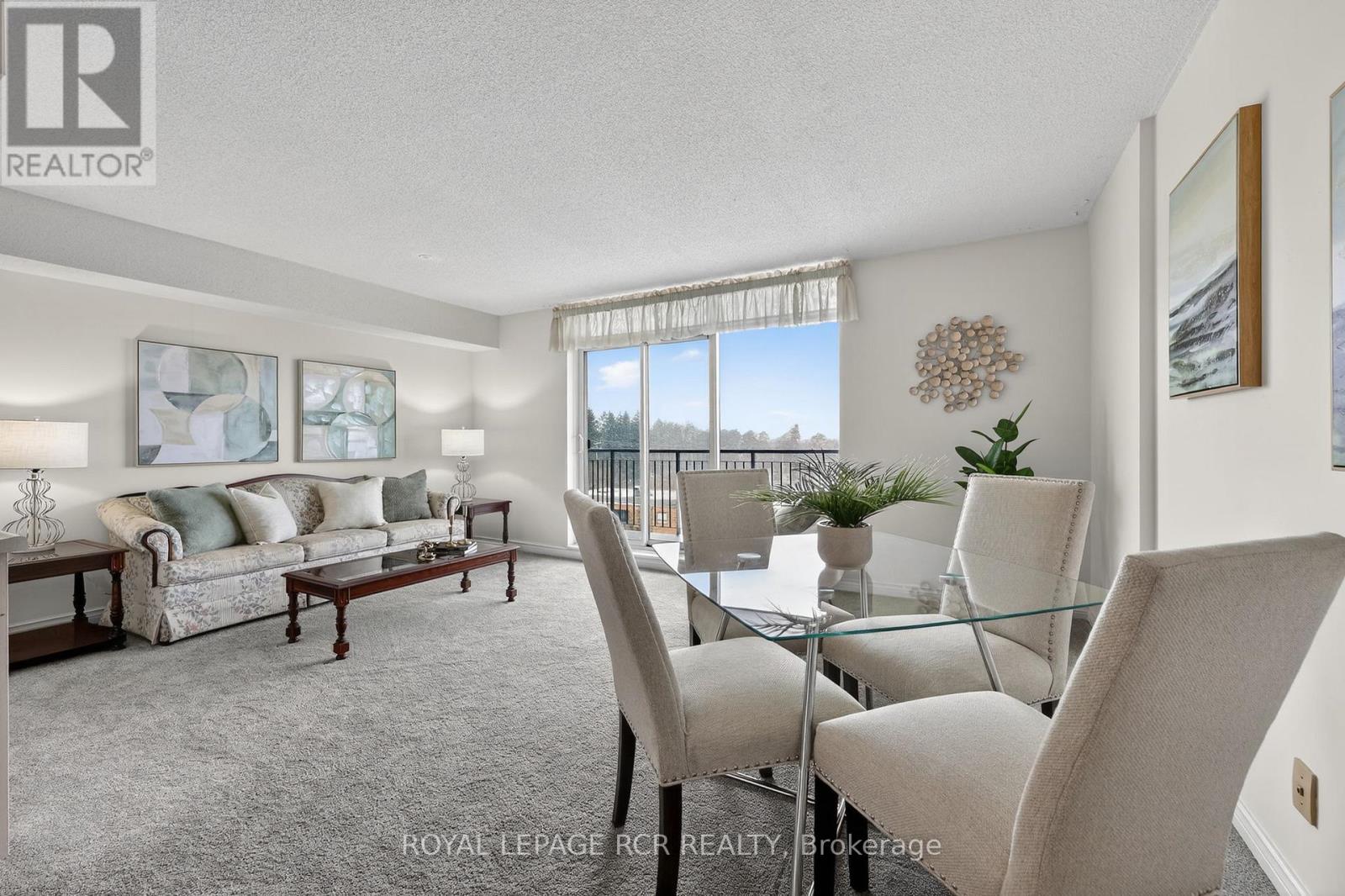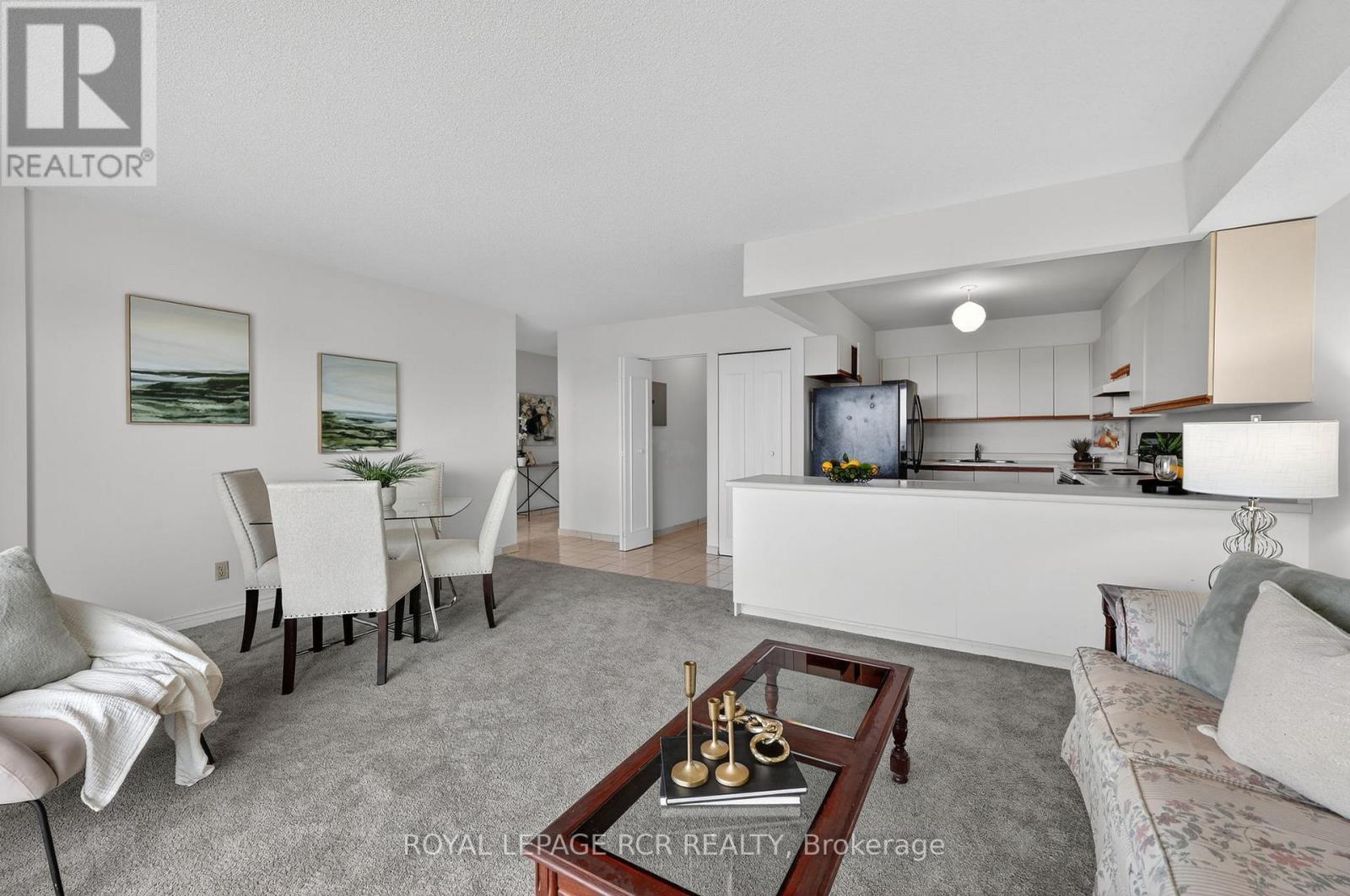 This inviting 2-bedroom condo offers a bright, open-concept layout and beautiful north-facing views of Island Lake from the sixth-floor balcony. As an end unit with no neighbours on one side, you'll appreciate the added privacy and quiet. The kitchen features generous counter space and ample cabinetry, overlooking the spacious living room-complete with broadloom flooring and a walkout to your private balcony, perfect for enjoying the fresh air and scenic views. The spacious primary bedroom includes broadloom, a large walk-in closet, and convenient semi-ensuite access to the 4-piece bathroom offers a vanity with a large sink, and plenty of shelving and storage. The second bedroom, currently used as a dining room, is versatile and features French doors, and a large window that fills the space with natural light. Built in shelving in hall can be reconverted to the bedroom closet. You'll also appreciate the in-suite laundry area with additional storage space, plus a handy pantry/linen closet. For added convenience, the locker (No. 67) is located on the same level-just steps down the hall. Ideally situated close to downtown, shops, restaurants, theatre, parks, and everyday amenities. Condo fees include Rogers Internet & Cable contract. Extra visitor parking is available onsite. (id:64974)