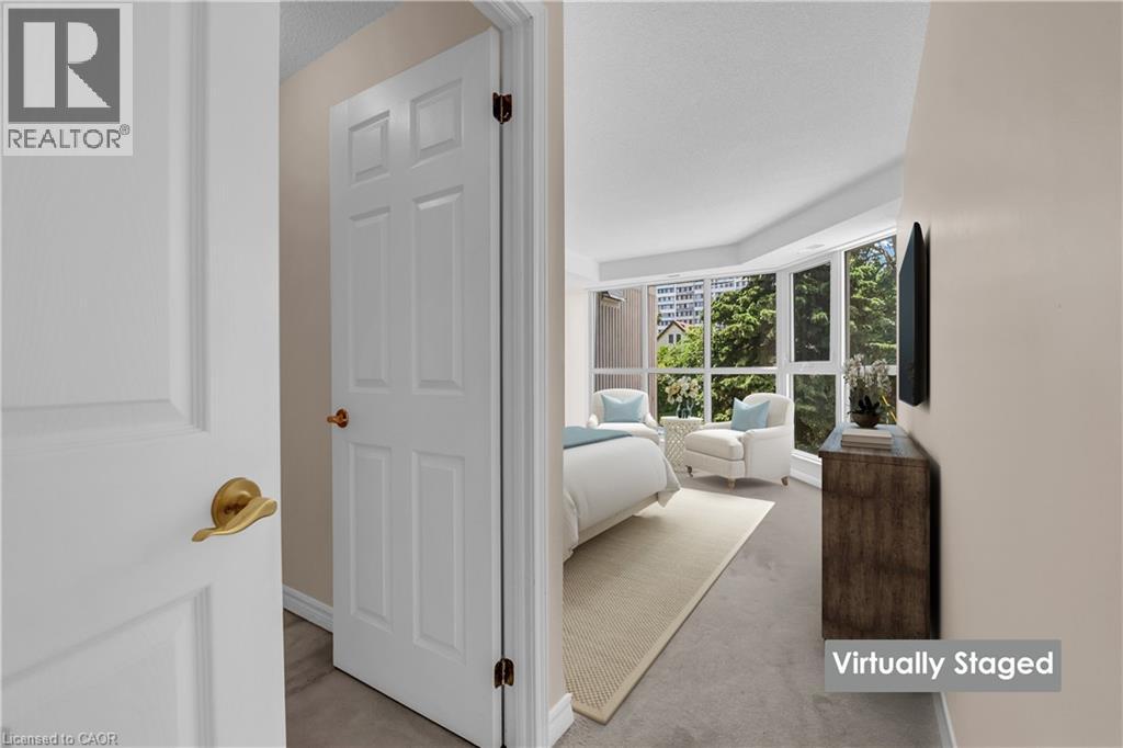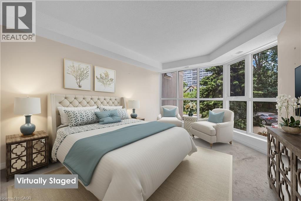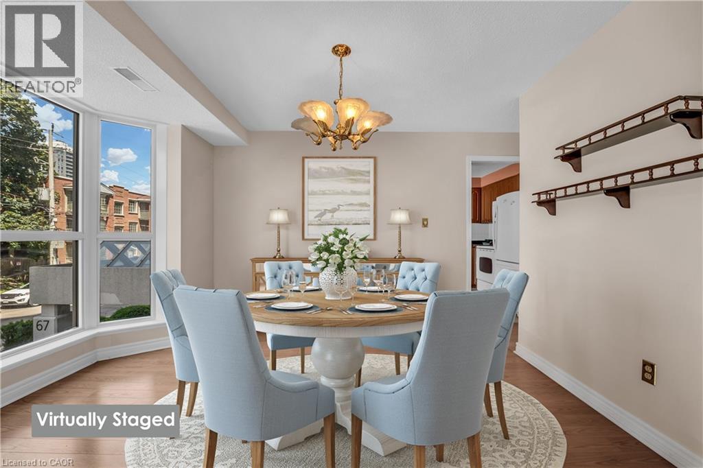 BRIGHT, SPACIOUS & STEPS TO EVERYTHING... Unit 203 at 67 Caroline Street South is a 1521 sq ft CORNER UNIT in Bentley Place, nestled in the heart of Hamilton's vibrant Durand North neighbourhood. This bright and beautifully laid-out suite offers the perfect blend of space, comfort, and unbeatable location. Step inside and be greeted by an OVERSIZED LIVING ROOM with expansive windows that flood the space with natural light plus WALK OUT to a private, WRAP-AROUND CORNER BALCONY. The living space flows seamlessly into a formal dining room with bay window and a spacious eat-in kitchen loaded with abundant cabinetry and an extended dining nook, perfect for everyday meals or entertaining guests. The primary suite is your own private haven, featuring a walk-in closet, 4-pc ensuite with soaker tub and separate shower, and a balconette walk-out for a touch of fresh air. A generous second bedroom with walk-in closet, a second full bath, and convenient in-suite laundry complete the layout. This unit includes TWO parking spaces (1 underground P2#4, 1 surface #14), and the building offers fantastic AMENITIES including an exercise room and party room with kitchen. Bonus: the building has all NEW THERMAL WINDOWS (2025), adding value and energy efficiency. Location is everything and this one delivers! Enjoy walkable access to nearby parks, Locke Street, and Hess Village, with boutique shopping, amazing restaurants, and the GO Station just minutes away. If you’re seeking a spacious and sun-filled condo in one of Hamilton’s most desirable neighbourhoods, this is it. (id:64974)