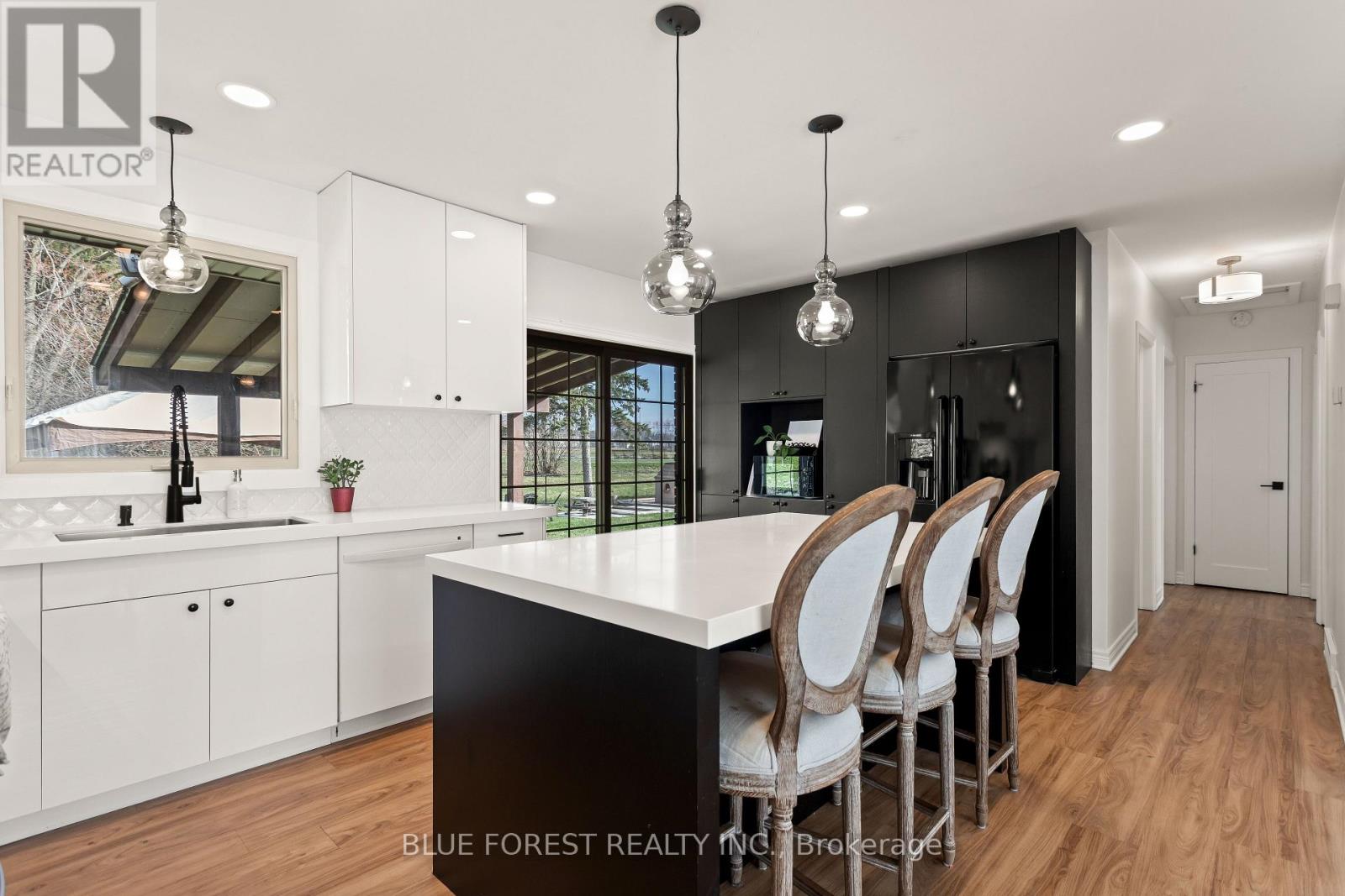 Welcome to this sprawling bungalow in the heart of Lambeth, perfectly set on an impressive double-wide lot with 110 ft of frontage. Just steps to Lambeth Public School and local shopping, this location offers everyday convenience in a charming community setting. Inside, you'll find an updated open-concept kitchen and living area, complete with sliding glass doors leading to a fully fenced backyard and patio-ideal for entertaining or relaxing. The main floor features three bedrooms and a beautifully updated spa-like 4-piece bath. The lower level adds even more living space with a large rec room with custom built-ins, oversized wet-bar and 3pc bathroom. This space offers flexibility for a play area, additional lounge, or home office. Outside, the groundwork for a future shed is already in place with electrical run to the concrete pad. Complete with a double-car garage and inside access, this home offers space, functionality, and great potential in a sought-after neighbourhood. AC unit (2020), Water Heater (2019) (id:64974)