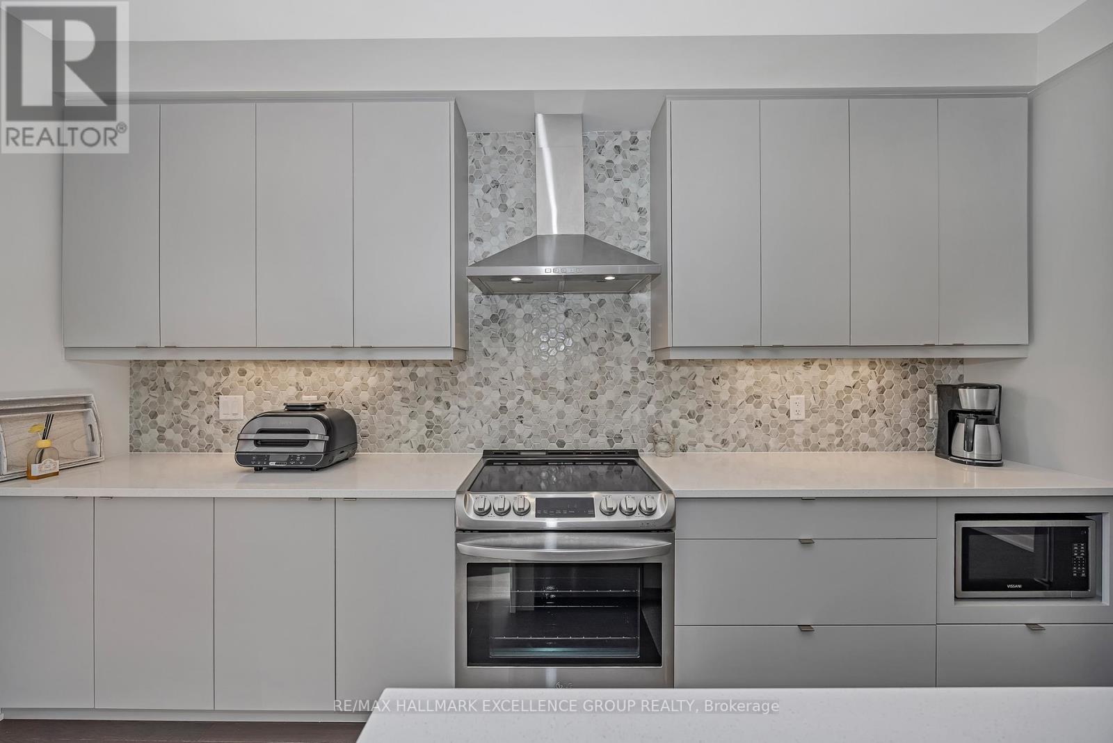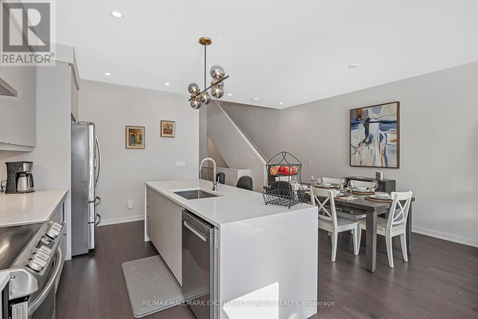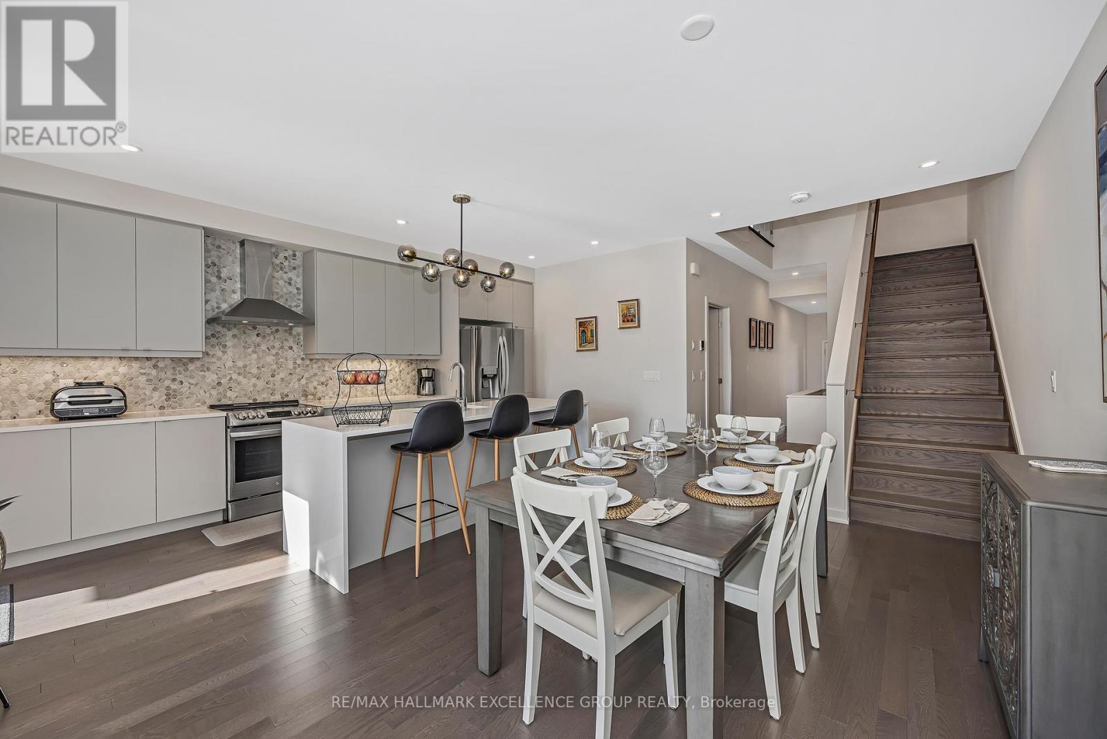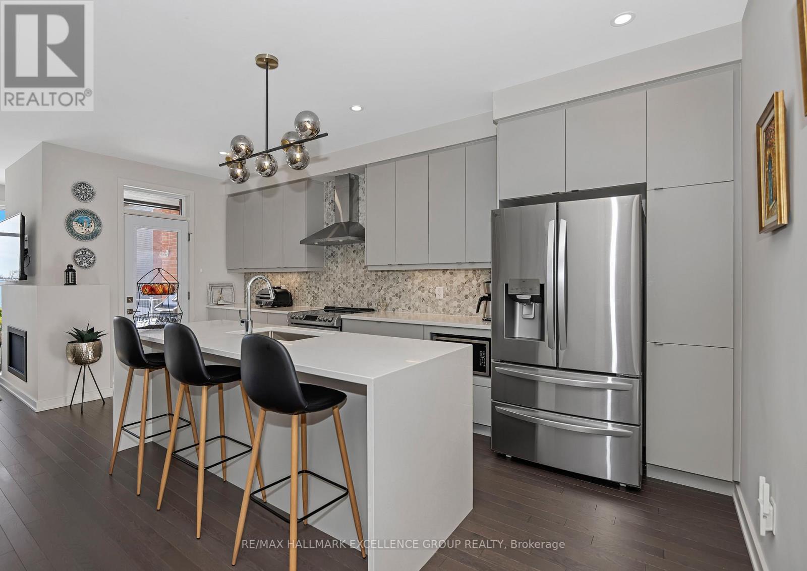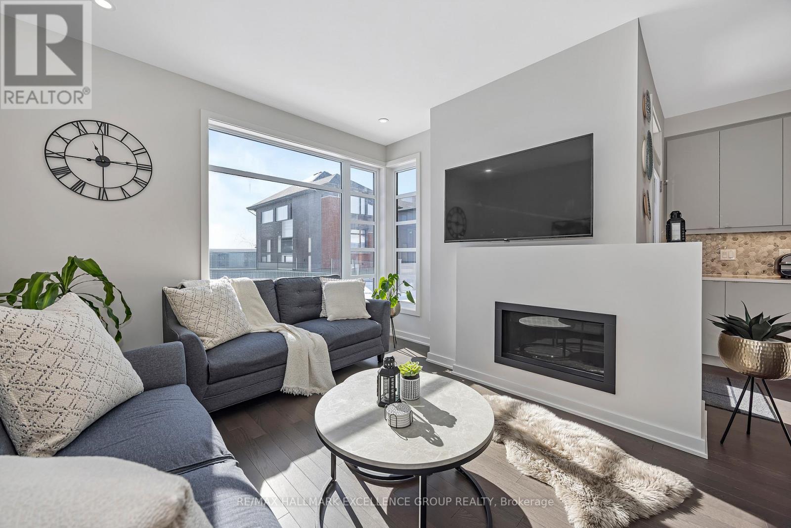 Quality built by award-winning HN Homes and sun-filled in Riverside South, this superior Weston executive townhome offers 2,112 sq ft of interior living space (as per builder) with an elegant, contemporary layout. A rare opportunity to own a near-new home in pristine condition, enhanced with premium upgrades & smart extras.The open-concept main level is awash in natural light, with oversized windows creating a bright, upscale ambiance throughout. Rich hardwood floors, 9'+ ceilings, steel & glass railings, & cozy gas fireplace add warmth and sophistication. The gourmet kitchen shines with ultra-resistant, eco-friendly PET (polyethylene terephthalate) cabinetry to the ceiling w/ soft-close doors/drawers, pantry, breakfast bar, stainless steel appliances, upgraded backsplash & oversized quartz counters with striking waterfall edge. Gas lines for the stove and BBQ plus water line for the fridge are in place, PET cabinetry continues in both bathrooms and the laundry room for a cohesive, modern look. Up the extra-wide hardwood staircase to three generous bedrooms, two full baths, an upgraded laundry room, and a versatile loft-ideal for a home office, lounge, or reading retreat. The primary suite is a sanctuary with coffered ceiling, large walk-in closet, and spa-like ensuite with double vanity and glass corner shower. The finished lower level expands the living space with a large family room, egress window, abundant storage, and rough-in for a future 3-piece bath. Enjoy southern rear exposure and a completed sodded yard. Outside, Solid brick and luxury Hardy Board siding adds lasting curb appeal, while the insulated garage keeps seasons comfortable. Additional highlights include whisper-quiet central A/C, eavestroughs with gutter guards, Wi-Fi thermostat, large mudroom, pre-rough in for EV charger, pre-wire for upstairs Wi-Fi extender and future solar panels, plus electrical/cable for wall-mounted TVs on all floors. Move-in ready .24 hours irrevocable on all offers. (id:64974)