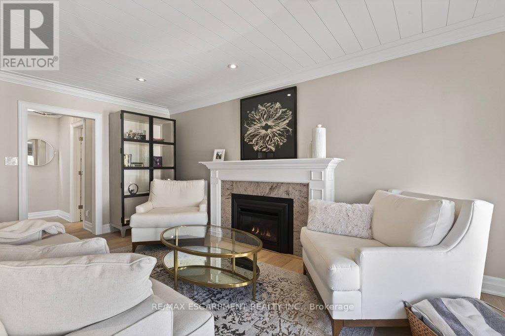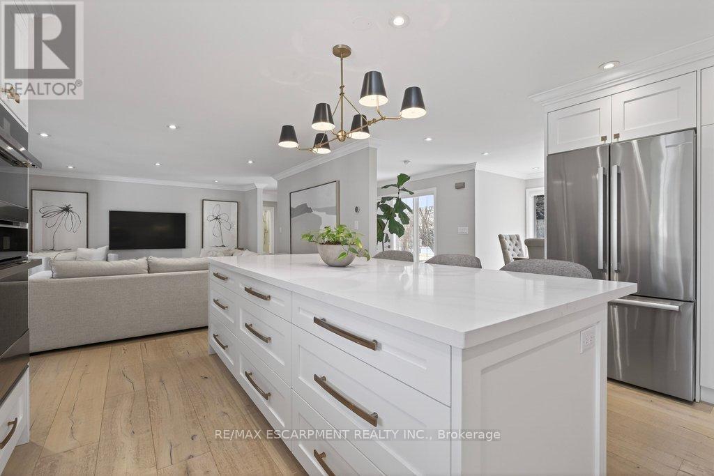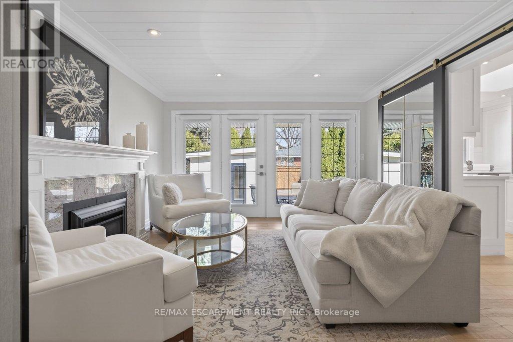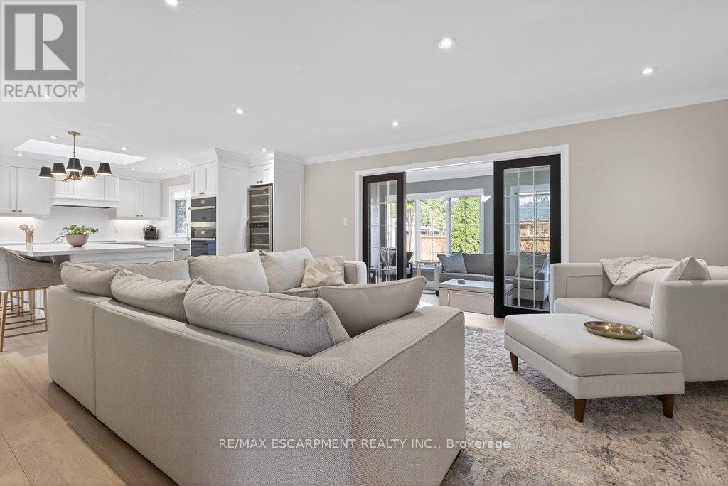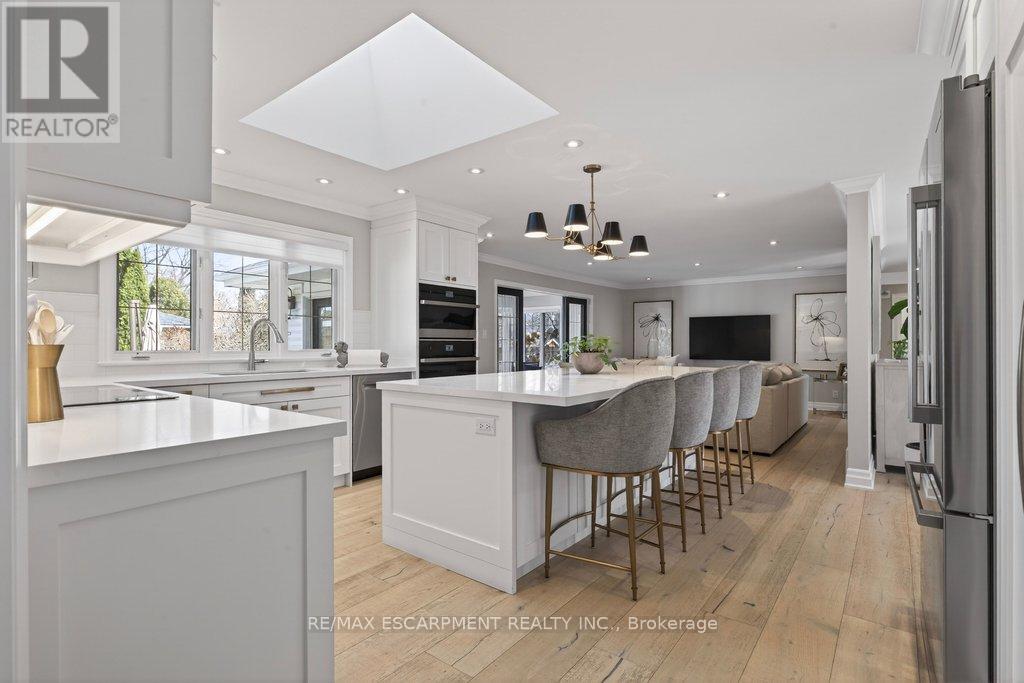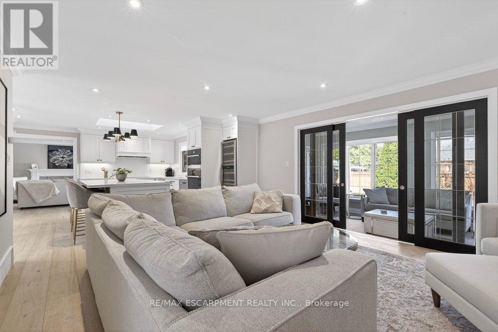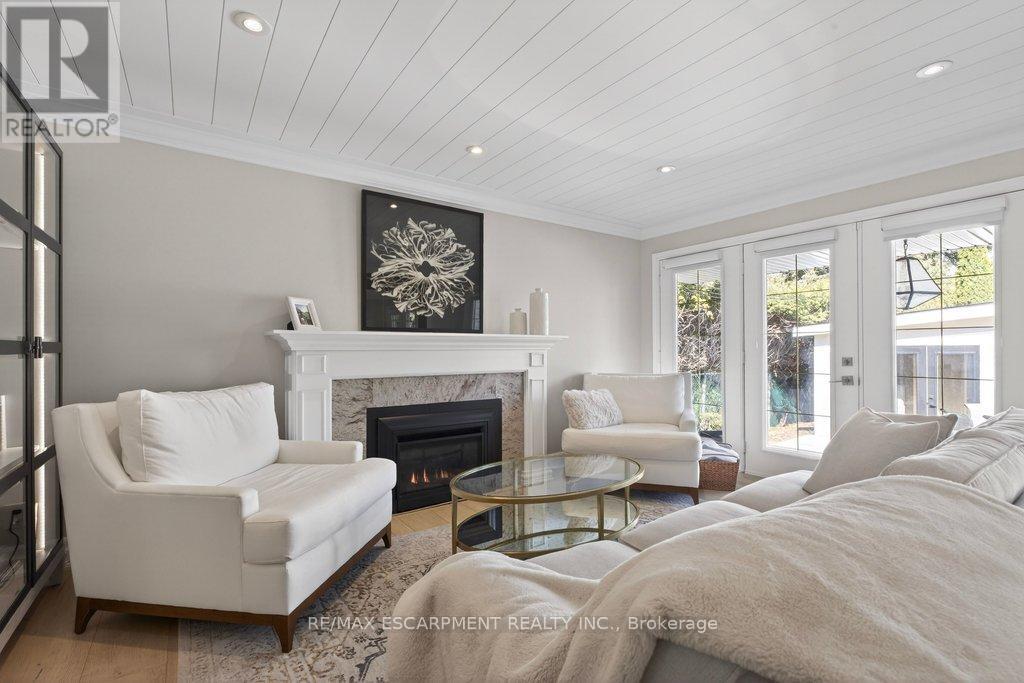 Stunning and absolutely beautiful ranch bungalow in sought-after Aldershot location! Steps to downtown, Burlington Golf & Country Club and LaSalle Park/Marina. 2,126 sq.ft. of open concept main level living space that features a custom kitchen with oversized island, quartz countertops, stainless steel appliances and wine fridge. Primary bedroom with custom built-ins, a 3-piece ensuite with heated floor, access to a walk-in closet/dressing room and a walkout to the 4-season sunroom. The main level also features a spacious family room, a second bedroom, a separate dining room and a living room with a gas fireplace and walkout to an incredible backyard oasis! The professionally designed and landscaped yard completed in 2025 features a heated fiberglass saltwater pool, cabana, gas fire pit, landscape lighting and a large stone patio with gas BBQ hookup. Additional features and finishes include engineered hardwood floors, crown moulding, pot lighting, multiple skylights and a professionally finished lower level with laundry, large crawl space for storage and an additional bedroom with access to a recent 4-piece bathroom (2024). Double garage with inside entry and epoxy floor and a recently updated circular driveway and front walkway (2025). 2+1 bedrooms and 3.5 bathrooms. (id:64974)