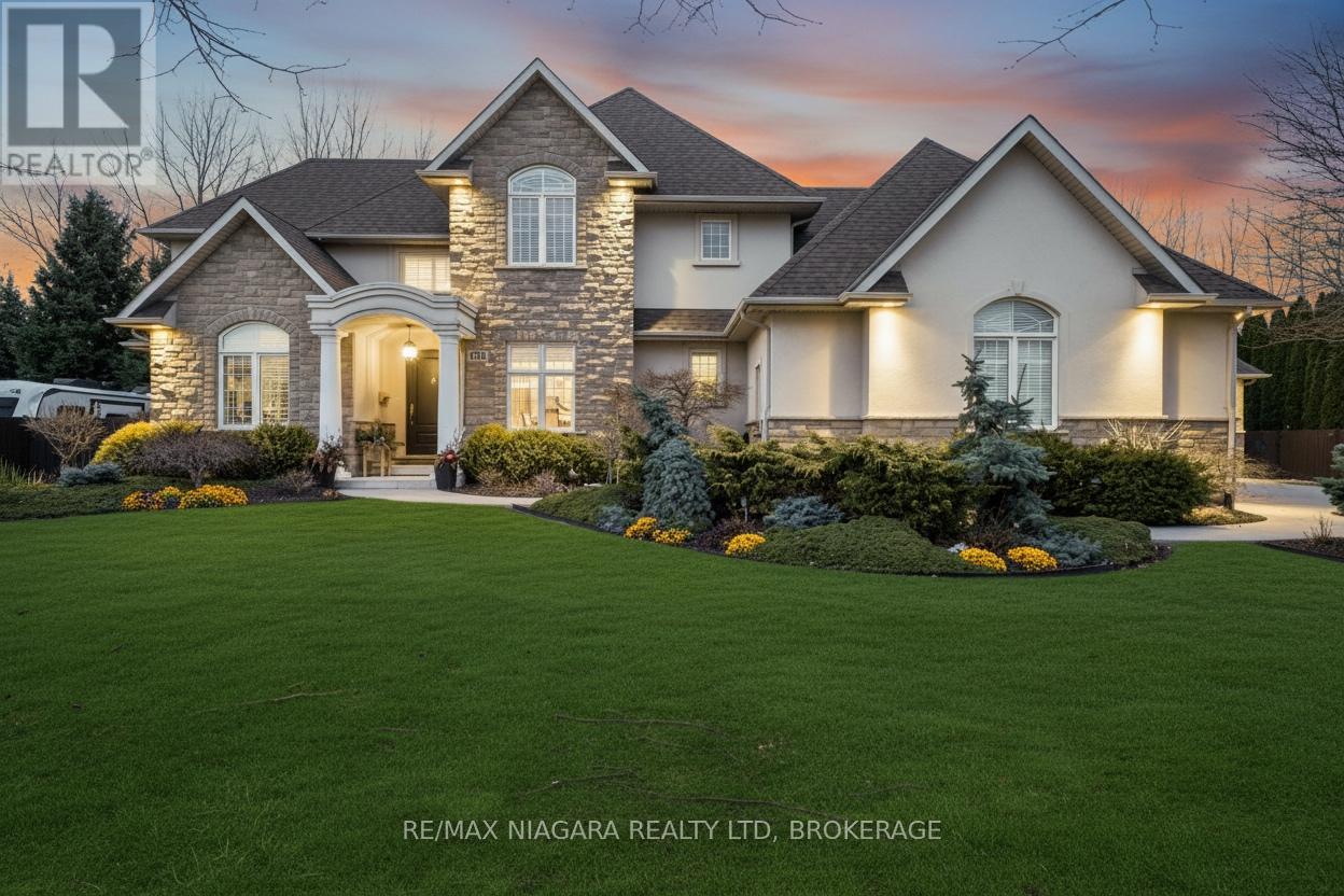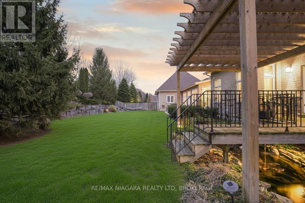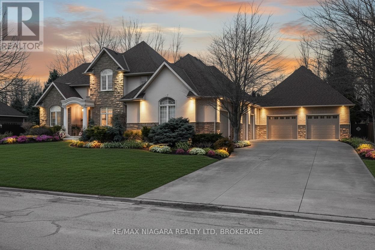 Welcome to an exceptional estate in Calaguiro Estates, widely regarded as the most prestigious neighbourhood in Niagara Falls. Situated in the desirable north end with quick access to the QEW and everyday amenities, this remarkable residence sits on an expansive 118 x 200 ft lot backing onto the escarpment with no rear neighbours, offering rare privacy. With over 6,000 sq ft of living space, soaring ceilings and expansive windows create a bright and sophisticated atmosphere throughout. The main level features a dramatic living room, formal dining area, private office, and a custom kitchen with French doors opening to a stunning backyard retreat. The main-floor primary suite offers a spa-inspired ensuite and custom walk-in closet, while the upper level features three spacious bedrooms with their own private and shared ensuites. The lower level includes a versatile in-law suite, ideal for extended family or guests. Completing the home is a rare five-car garage and a beautifully landscaped backyard with natural armour stone and a breathtaking escarpment backdrop. A rare opportunity to own an estate property in one of Niagara's most distinguished communities. Luxury Certified. (id:64974)