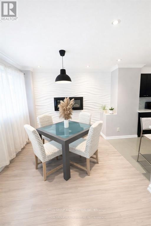 Welcome to this beautifully professionally renovated townhome located in a highly desirable neighbourhood. Spacious open-concept living and dining area with pot lights, ceiling speakers and large windows brining in natural light. Elegant hardwood flooring for a warm, contemporary look. Modern kitchen featuring dark cabinetry, quartz countertops, and an island with accent lighting - perfect for entertaining. Notable feature includes central vac system with convenient kick plate for easy clean-ups. Textured accent wall and built-in electric fireplace. Fully finished basement with pot lights and laminate flooring, laundry room with custom cabinetry and quartz countertops. The basement is ideal as a family room, recreation area, home office or guest suite. Upstairs, you'll find 3 spacious bedrooms with custom closet organizers and updated bathroom with integrated accent lighting. Enjoy outdoor living with a private backyard, perfect for relaxing or entertaining. Parking perks, enjoy the convenience of an attached single car garage plus a sought after two-car driveway providing generous parking space for residents and guests alike. This townhome is within walking distance to (MiWay & GO), schools, parks, grocery stores. Close to all major highways (403/401/QEW). Move-in ready - just unpack and enjoy modern living at its finest! High Speed INTERNET INCLUDED in maintenance. Some photos are virtually staged. (id:64974)