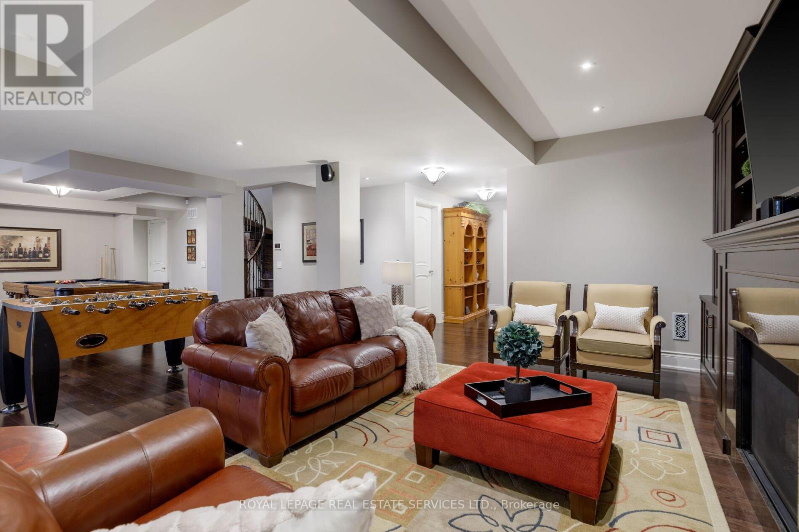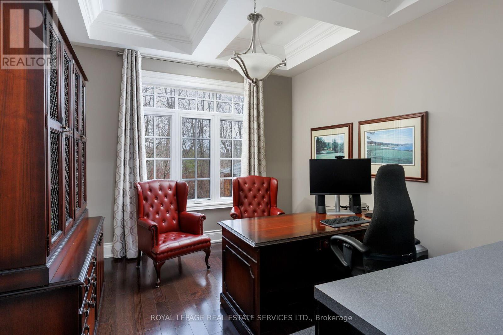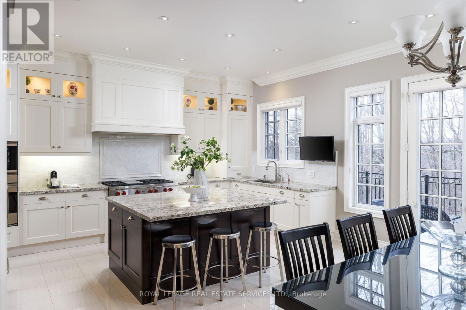 Welcome to Kleinburg Heritage Estates, Rosehaven Homes' exclusive Platinum community of just 44 estate homes on rare 60'-70' lots. This exceptional, like-new 5+1bedroom, 5.5-bath luxury home with a professionally finished walkout basement is seton a premium southwest-facing ravine lot overlooking the Humber River, offering remarkable privacy and breathtaking views. Located within walking distance to downtown Kleinburg and the McMichael Canadian Art Collection, and easy access toCopper Creek Golf Club, scenic trails, Hwy 427, Hwy 27, and the 407 ETR, this home delivers an unparalleled blend of luxury, nature, and convenience. Extensively upgraded with Rosehaven's Platinum and Signature finishes, highlights include soaring smooth ceilings with cathedral, tray, and coffered details, hardwood flooring on all levels, deep crown mouldings, pot lights, integrated Crestron audio system, custom Downsview and Barzotti cabinetry, and premium finishes and fixtures throughout. The chef-inspired Downsview kitchen features granite counters, an enlarged island with breakfast bar, Wolf and Sub-Zero appliances including 2 fridges, and a walkout to a cedar deck with stunning ravine and river views. The main level offers elegant living and dining spaces, a private office, and a family room with custom Barzotti cabinetry and a fireplace.Upstairs, 5 spacious bedrooms all enjoy ensuite access, including a luxurious primary retreat with a spa-inspired 5-piece ensuite. The walkout basement adds exceptional living space with a full kitchen, media room with fireplace, 6th bedroom or gym, and 4-piece bath-ideal for multi-generational living or entertaining. Professionally landscaped grounds with flagstone, stone patio and covered terrace, gazebo, irrigation system, landscape lighting and mature trees complete this extraordinary turnkey estate. (id:64974)