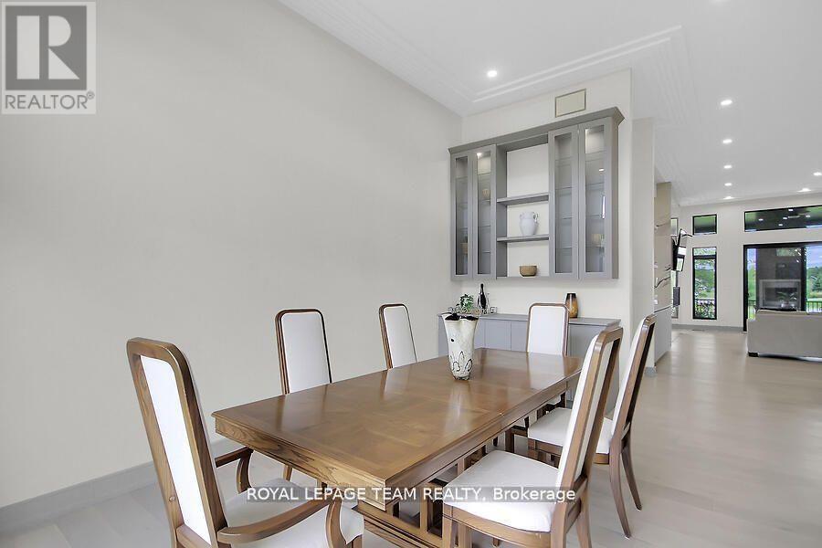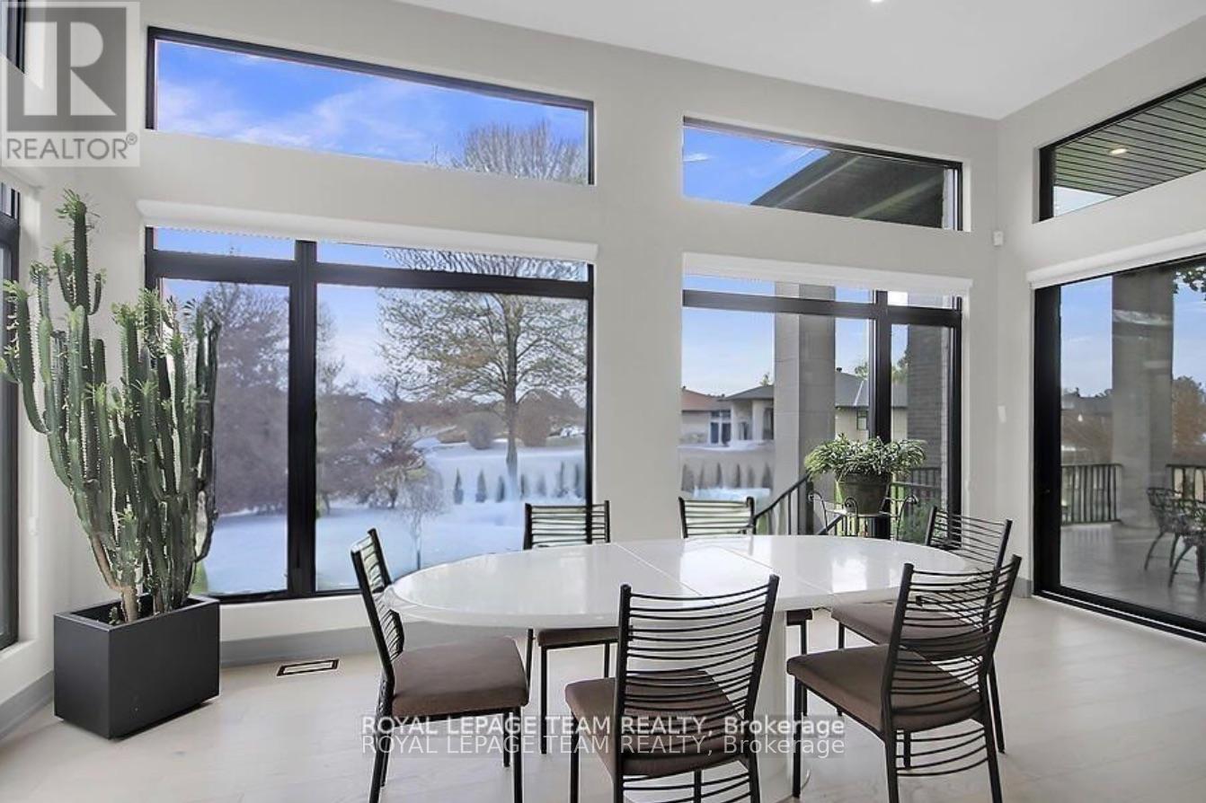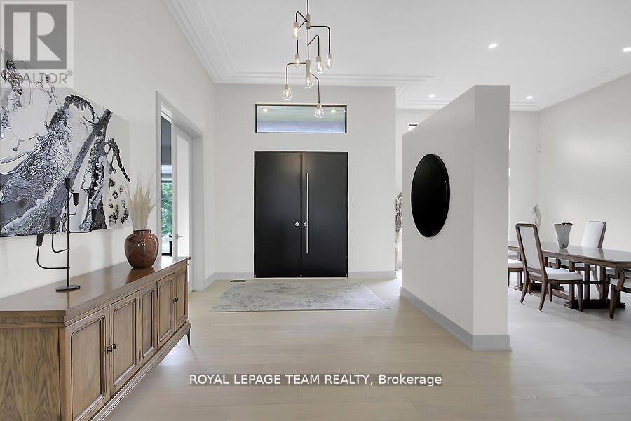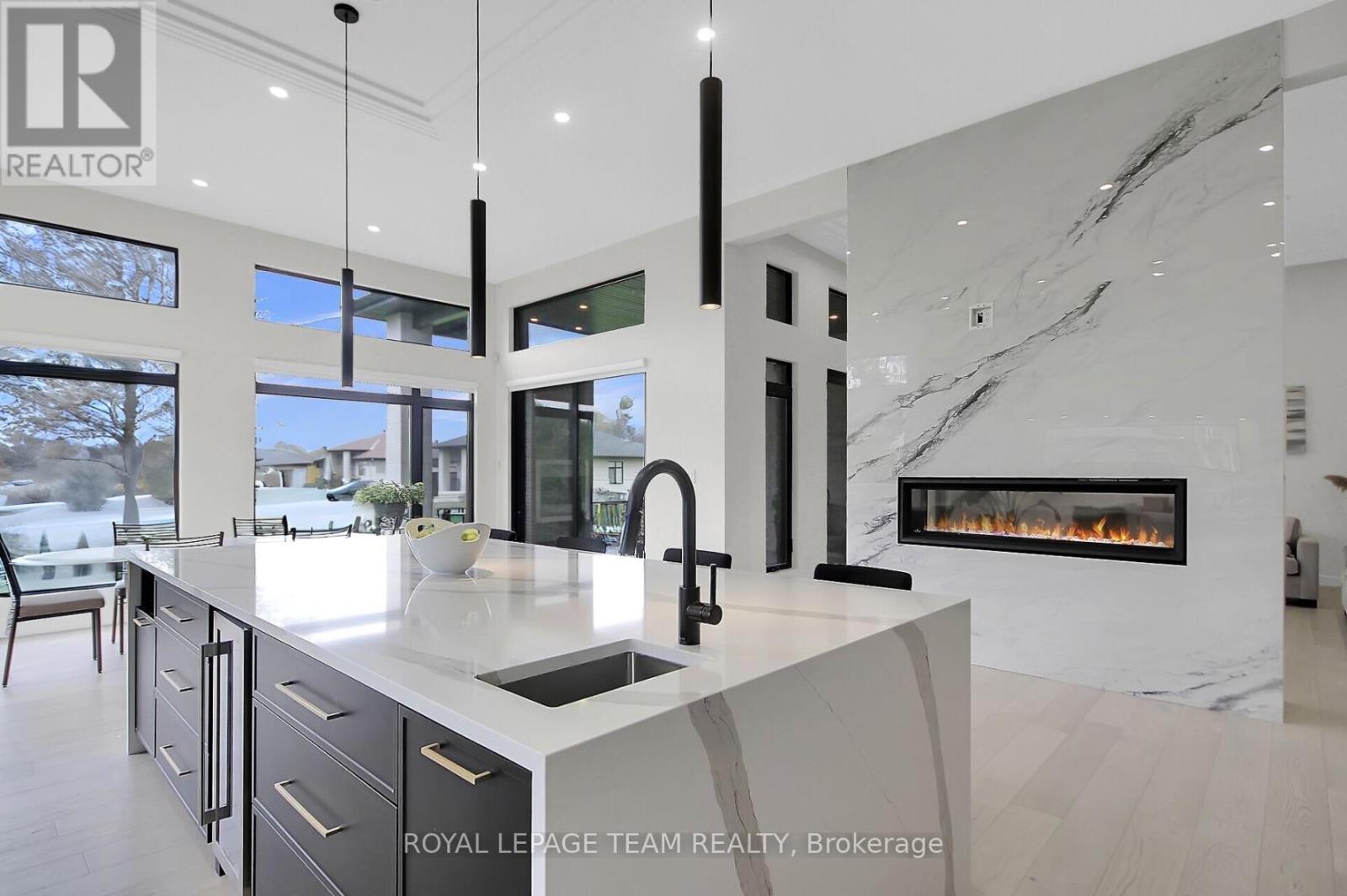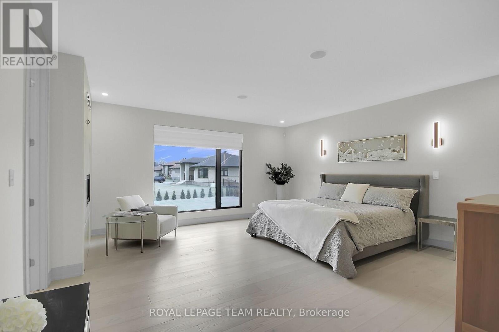 This expansive custom-built bungalow offers 6 bedrooms and 5 bathrooms, showcasing elegant wide plank oak hardwood flooring, oversized windows, and exquisite craftsmanship throughout. Designed with modern living in mind, the open-concept layout welcomes you through a stylish foyer into a grand living room that seamlessly extends to a covered veranda, complete with a cozy wood-burning fireplace. The chef-inspired kitchen is a true centrepiece, featuring a stunning waterfall quartz island with generous seating, quartz backsplash, gas cooktop, and a bright breakfast nook perfectly complemented by a separate formal dining room for more refined gatherings.The luxurious primary suite is a private retreat, boasting a spacious walk-in closet with custom vanity, a 5-piece ensuite with double sinks, a glass-enclosed shower, freestanding soaker tub, and a gas fireplace for added comfort. Three additional bedrooms are located on the main floor, two of which offer private en-suites. The fully finished lower level features heated floors throughout, three large bedrooms, a full bathroom, and a vast recreational space with endless potential for entertainment or relaxation. Additional highlights include a heated 3-car attached garage with soaring 20-ft ceilings and a fully integrated smart home system with wireless control and state-of-the-art 5-zone wireless speakers. Please note that lower level rooms have been virtually staged. (id:64974)