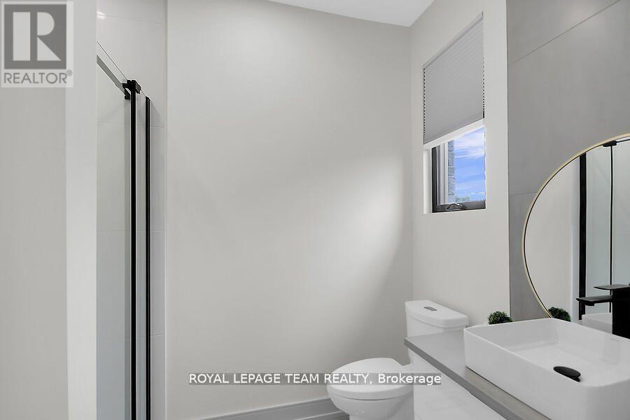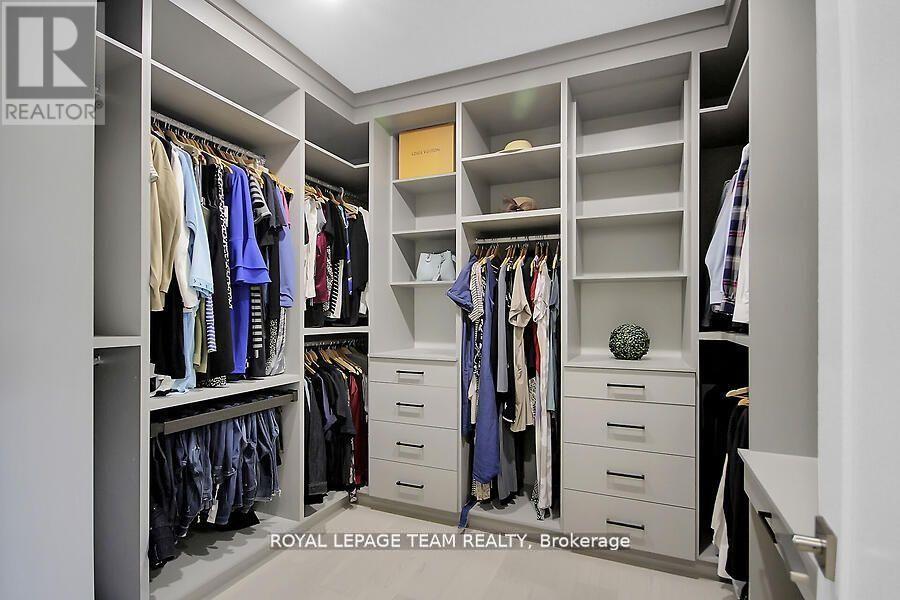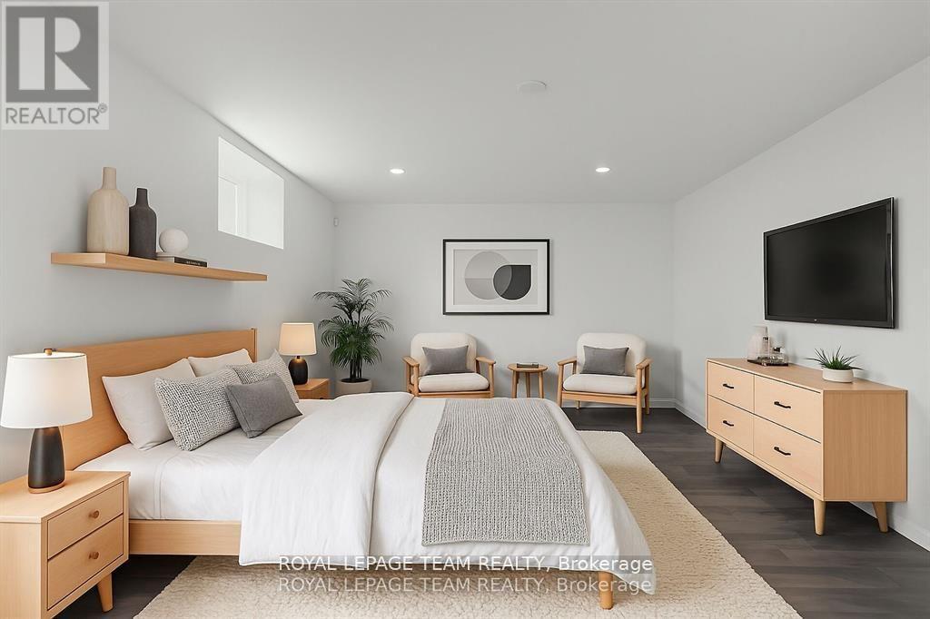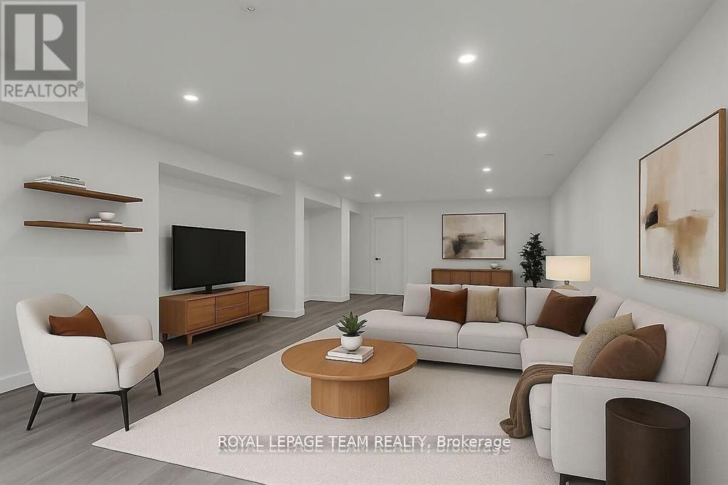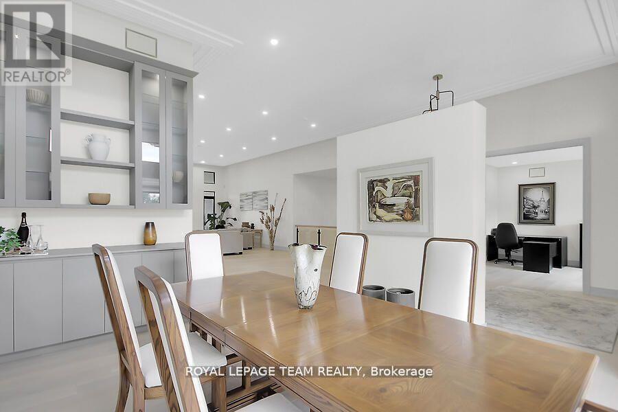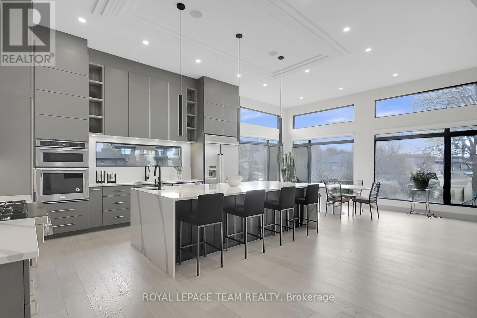 This expansive custom-built bungalow offers 6 bedrooms and 5 bathrooms, showcasing elegant wide plank oak hardwood flooring, oversized windows, and exquisite craftsmanship throughout. Designed with modern living in mind, the open-concept layout welcomes you through a stylish foyer into a grand living room that seamlessly extends to a covered veranda, complete with a cozy wood-burning fireplace. The chef-inspired kitchen is a true centrepiece, featuring a stunning waterfall quartz island with generous seating, quartz backsplash, gas cooktop, and a bright breakfast nook perfectly complemented by a separate formal dining room for more refined gatherings.The luxurious primary suite is a private retreat, boasting a spacious walk-in closet with custom vanity, a 5-piece ensuite with double sinks, a glass-enclosed shower, freestanding soaker tub, and a gas fireplace for added comfort. Three additional bedrooms are located on the main floor, two of which offer private en-suites. The fully finished lower level features heated floors throughout, three large bedrooms, a full bathroom, and a vast recreational space with endless potential for entertainment or relaxation. Additional highlights include a heated 3-car attached garage with soaring 20-ft ceilings and a fully integrated smart home system with wireless control and state-of-the-art 5-zone wireless speakers. Please note that lower level rooms have been virtually staged. (id:64974)
