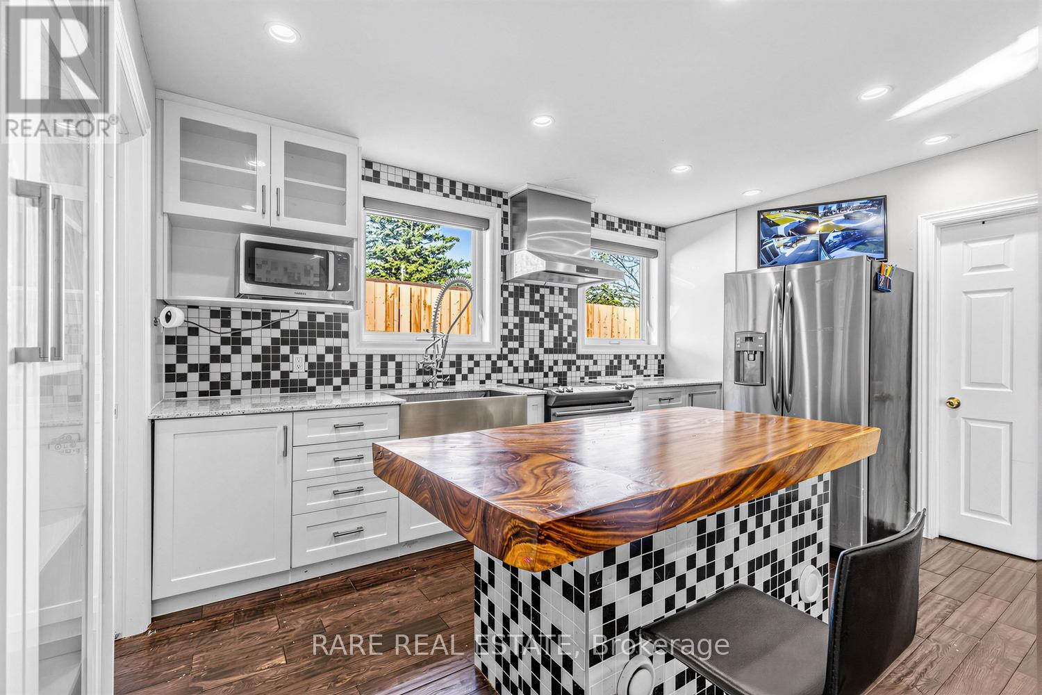 Welcome to 69 Fletcherdon Crescent, a beautifully updated detached backsplit home offering stylish finishes, functional living space, and an impressive lot in a family-friendly Toronto neighbourhood. This move-in-ready home combines modern upgrades with versatile layout options, ideal for families, end-users, or investors alike.The main level features a bright, open-concept living and dining area with pot lights, sleek flooring, and large windows that fill the space with natural light. The renovated kitchen is a standout, complete with contemporary cabinetry, stainless steel appliances, eye-catching mosaic backsplash, and a custom wood island that adds both character and functionality-perfect for entertaining or everyday living.Generous-sized bedrooms offer comfortable accommodations, including a vibrant and inviting space ideal for kids, guests, or a home office. The updated bathrooms showcase clean, modern finishes with quality tile work and double vanity in the main bath for added convenience.The fully finished lower level expands your living space significantly, featuring a large open recreation area, additional rooms, and a second kitchen setup-offering excellent in-law suite or income potential. Separate access enhances flexibility for multi-generational living or rental use.Step outside to a massive private backyard with extensive concrete work, providing low maintenance and endless possibilities-parking for multiple vehicles, outdoor entertaining, or even future additions. A detached structure and ample storage space complete the exterior.Located close to schools, parks, transit, and amenities, this property delivers both comfort and convenience. Whether you're looking to move in, invest, or generate rental income, this home checks all the boxes.A rare opportunity to own a turnkey property with income potential in a desirable location-don't miss it. (id:64974)