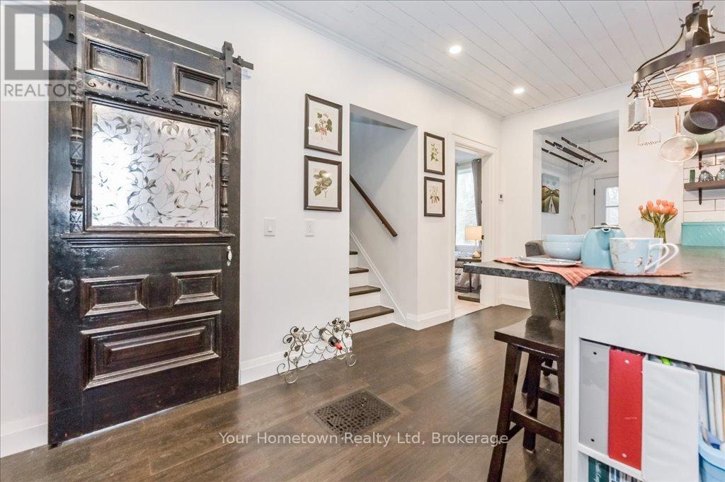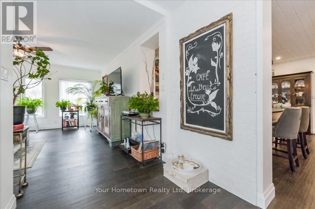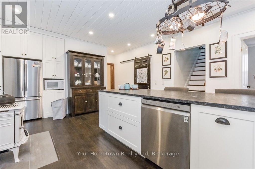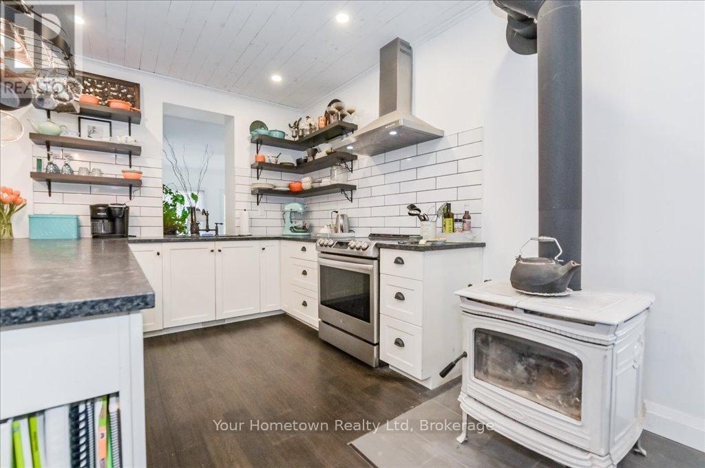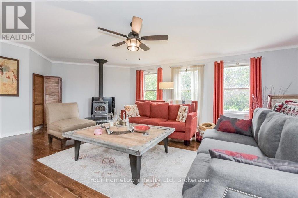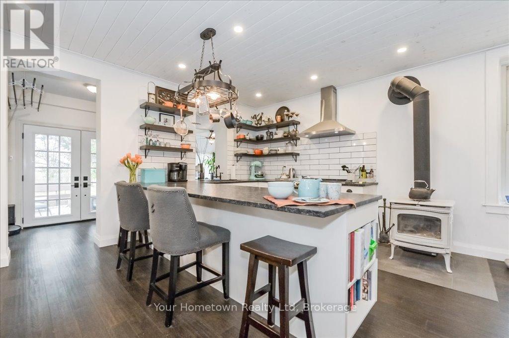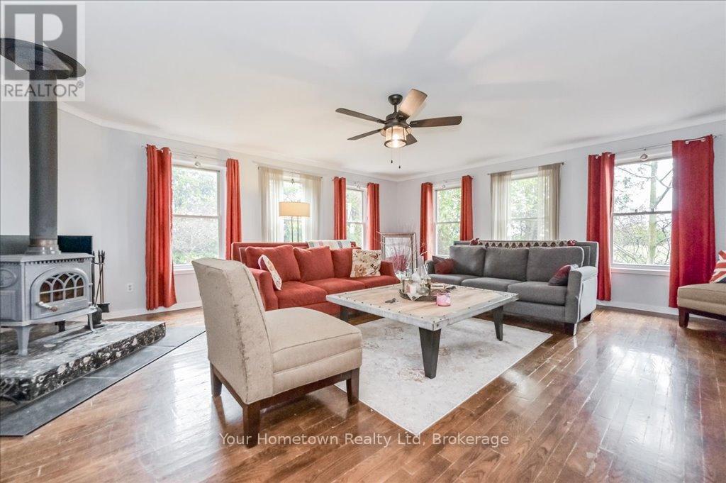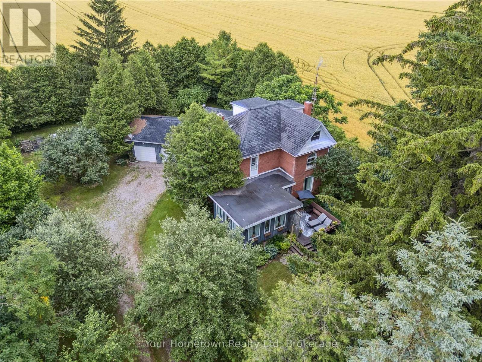 Secluded country living just minutes from town. This beautiful brick home is filled with character & timeless charm, board-and-batten additions, an attached two-car garage, and a private deck perfect for relaxing or entertaining. Set on 1.3 picturesque acres down a private drive, the property comes alive each spring with established perennials, mature trees, and your own fruit and nut trees - offering endless potential for expanded perennial or vegetable gardens. Surrounded by farmers' fields, enjoy peaceful views and exceptional privacy. Enter through the garage into a convenient mudroom or via the side entrance to a spacious, welcoming tiled foyer. The large yet cozy living room features a charming wood stove, creating the perfect gathering space. Just off the living room, a dedicated office/study with a built-in library provides an ideal work-from-home retreat with lovely views of the side yard. The main floor also offers a three-piece bath with glass shower, & a practical laundry/oversized pantry combination, and a main floor bedroom/bonus room. Opposite this space is the stunning, recently renovated custom kitchen, thoughtfully designed for both everyday living and entertaining. A bright passthrough leads to the sunroom, bathed in natural light from numerous windows and equally suited as a spectacular dining room. Upstairs, the spacious primary bedroom features a large cedar-lined closet & separate linen closet-exceptional storage for a nearly century home. A beautifully renovated five-piece bathroom includes walk-in tiled shower, soaker tub, & double sinks. A charming third bedroom sits adjacent to the bathrm. The third-floor loft offers a versatile fourth bedroom or bonus space, ideal for a teenager's retreat, guest room, or playroom. Enjoy the comfort and peace of mind that come with updated electrical and a new propane furnace - all just five minutes to Elora and two minutes to Ariss. Discover how sweet country living can be when you're close to everything. (id:64974)