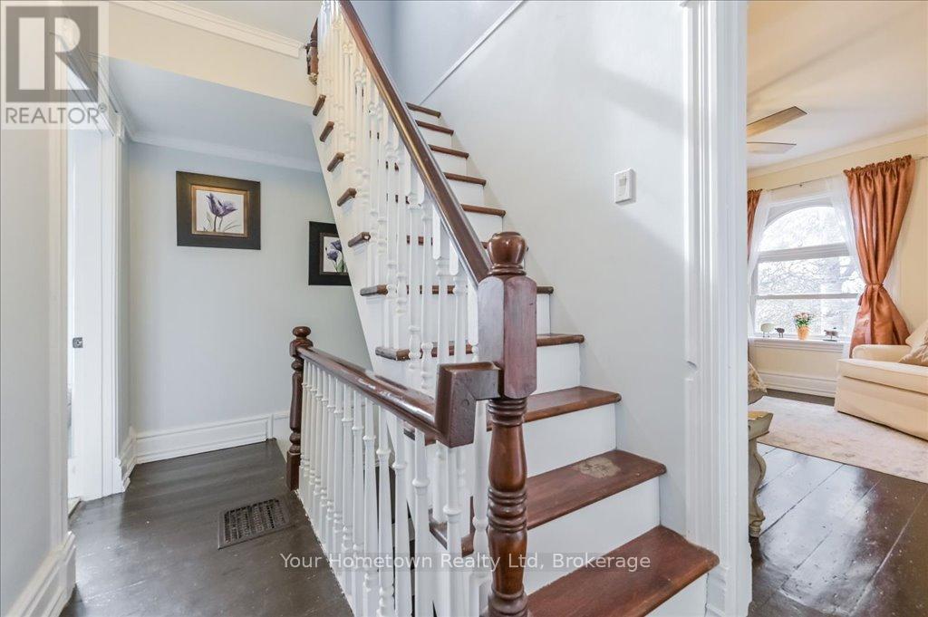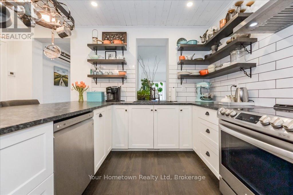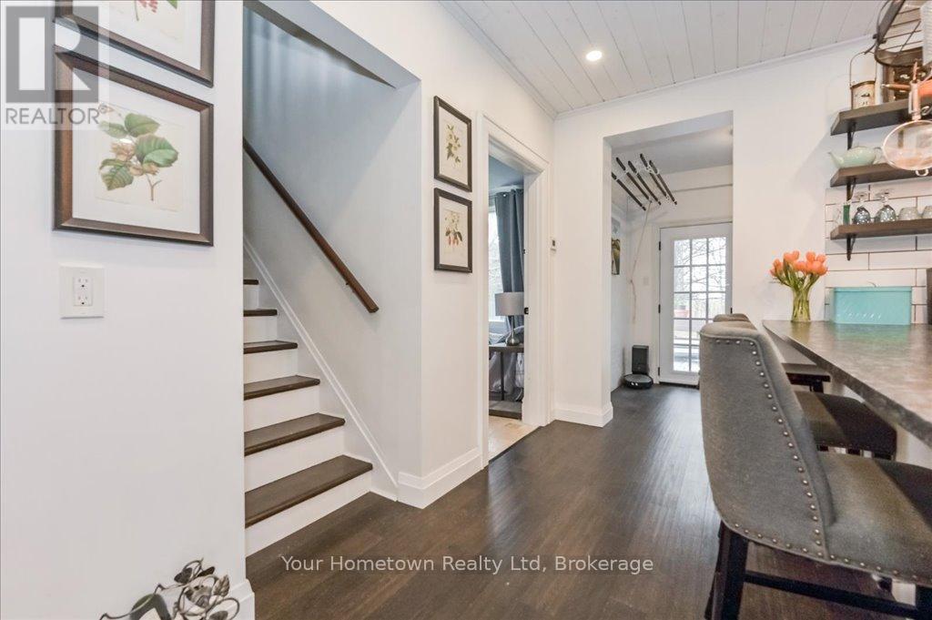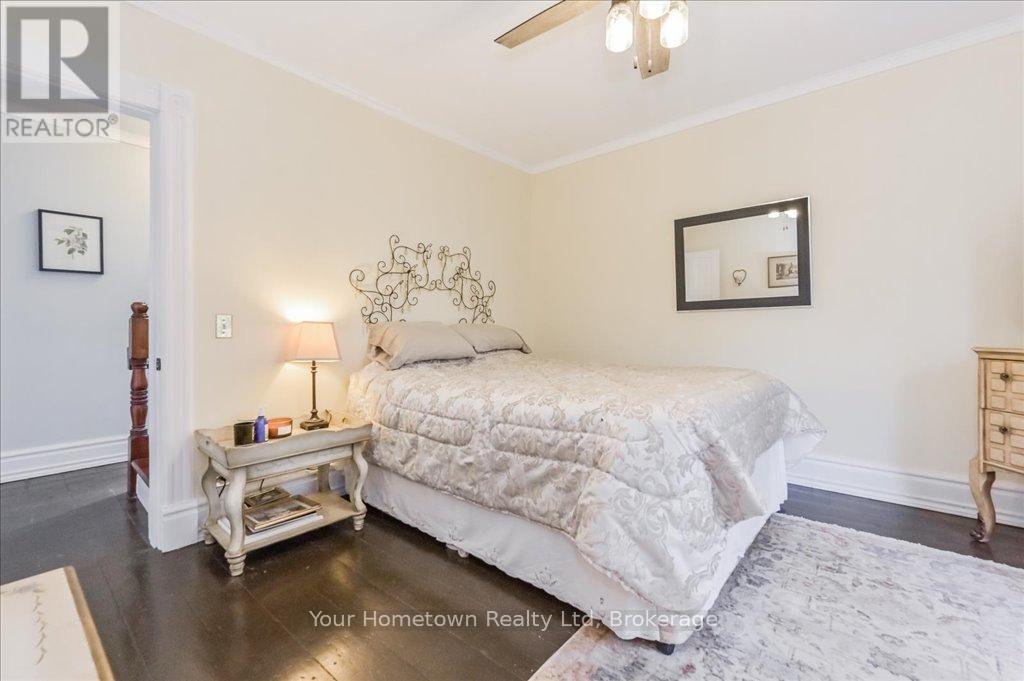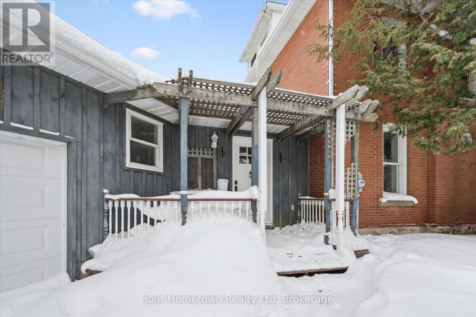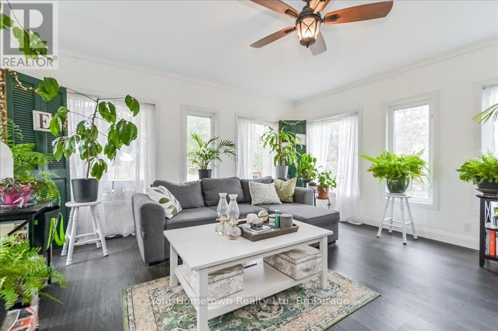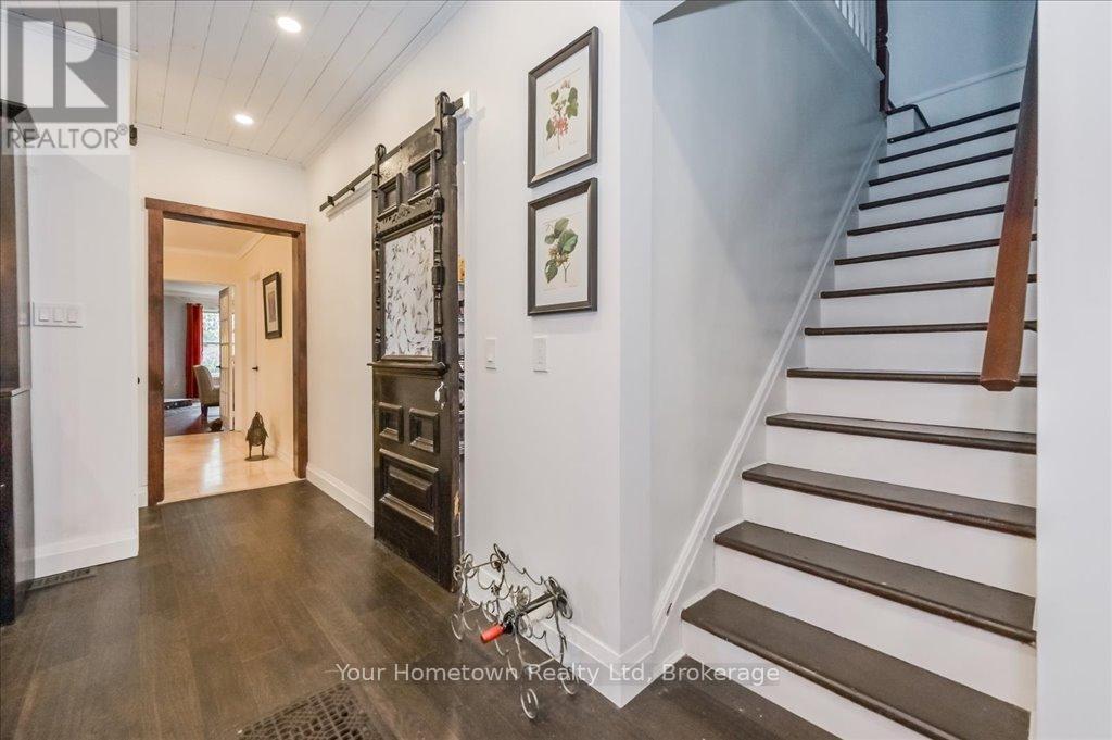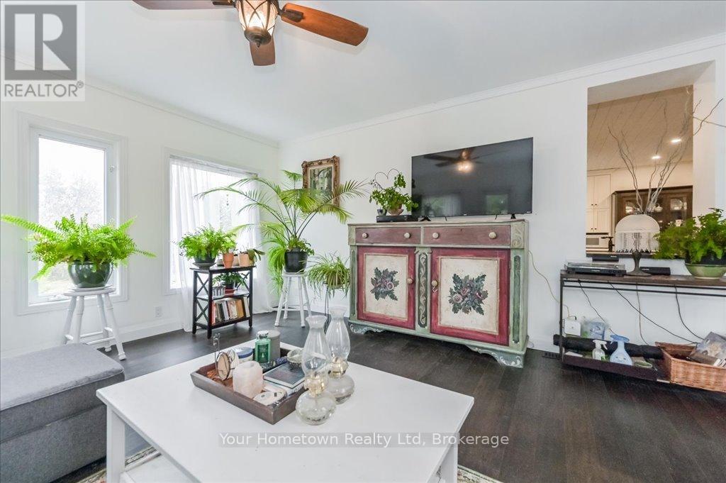 Secluded country living just minutes from town. This beautiful brick home is filled with character & timeless charm, board-and-batten additions, an attached two-car garage, and a private deck perfect for relaxing or entertaining. Set on 1.3 picturesque acres down a private drive, the property comes alive each spring with established perennials, mature trees, and your own fruit and nut trees - offering endless potential for expanded perennial or vegetable gardens. Surrounded by farmers' fields, enjoy peaceful views and exceptional privacy. Enter through the garage into a convenient mudroom or via the side entrance to a spacious, welcoming tiled foyer. The large yet cozy living room features a charming wood stove, creating the perfect gathering space. Just off the living room, a dedicated office/study with a built-in library provides an ideal work-from-home retreat with lovely views of the side yard. The main floor also offers a three-piece bath with glass shower, & a practical laundry/oversized pantry combination, and a main floor bedroom/bonus room. Opposite this space is the stunning, recently renovated custom kitchen, thoughtfully designed for both everyday living and entertaining. A bright passthrough leads to the sunroom, bathed in natural light from numerous windows and equally suited as a spectacular dining room. Upstairs, the spacious primary bedroom features a large cedar-lined closet & separate linen closet-exceptional storage for a nearly century home. A beautifully renovated five-piece bathroom includes walk-in tiled shower, soaker tub, & double sinks. A charming third bedroom sits adjacent to the bathrm. The third-floor loft offers a versatile fourth bedroom or bonus space, ideal for a teenager's retreat, guest room, or playroom. Enjoy the comfort and peace of mind that come with updated electrical and a new propane furnace - all just five minutes to Elora and two minutes to Ariss. Discover how sweet country living can be when you're close to everything. (id:64974)