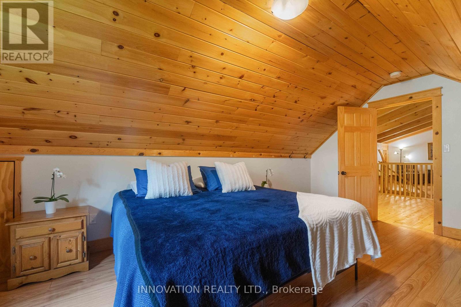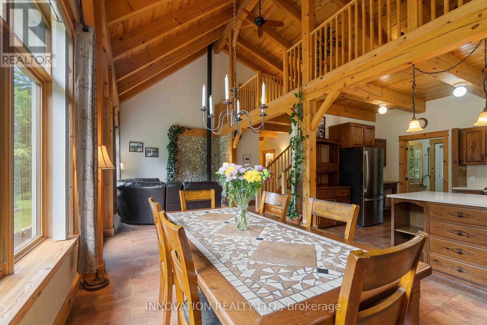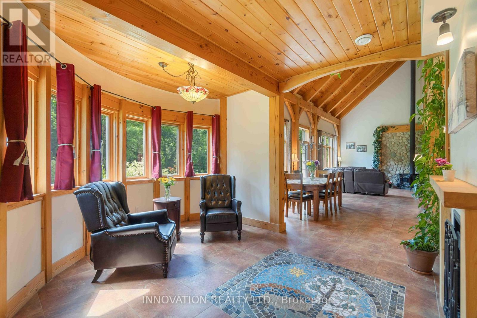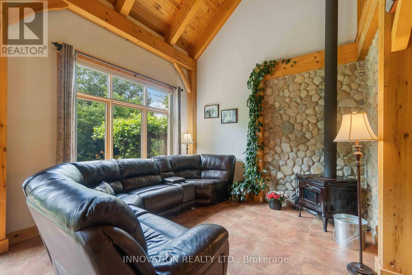 Discover your Urban Oasis! This custom-designed, ecologically sustainable post-and-beam home sits on a serene peninsula in Pembroke, with 2.8 acres of lush forest. Enjoy privacy and natural beauty while having all amenities at your doorstep. The open-concept main level boasts 23-ft ceilings and features a newly renovated kitchen with custom pine cupboards, quartz countertops, and modern appliances. Relax in the curved sitting area with a gas fireplace or by the wood stove in the living room. The main level includes an office, two full bathrooms, and three bedrooms, including the primary suite with a walk-in closet and sliding doors leading to a patio with river views. The upper level offers bonus rooms, a large storage area, and a fourth bedroom overlooking the garden. Updates include paved driveway with a gate 2023, new washer & dryer 2022, infrared sauna 2023, new owned hot water heater 2025. Additional features include two outdoor sheds, a hot tub, and solar panels providing passive income. Book your showing today! (id:64974)