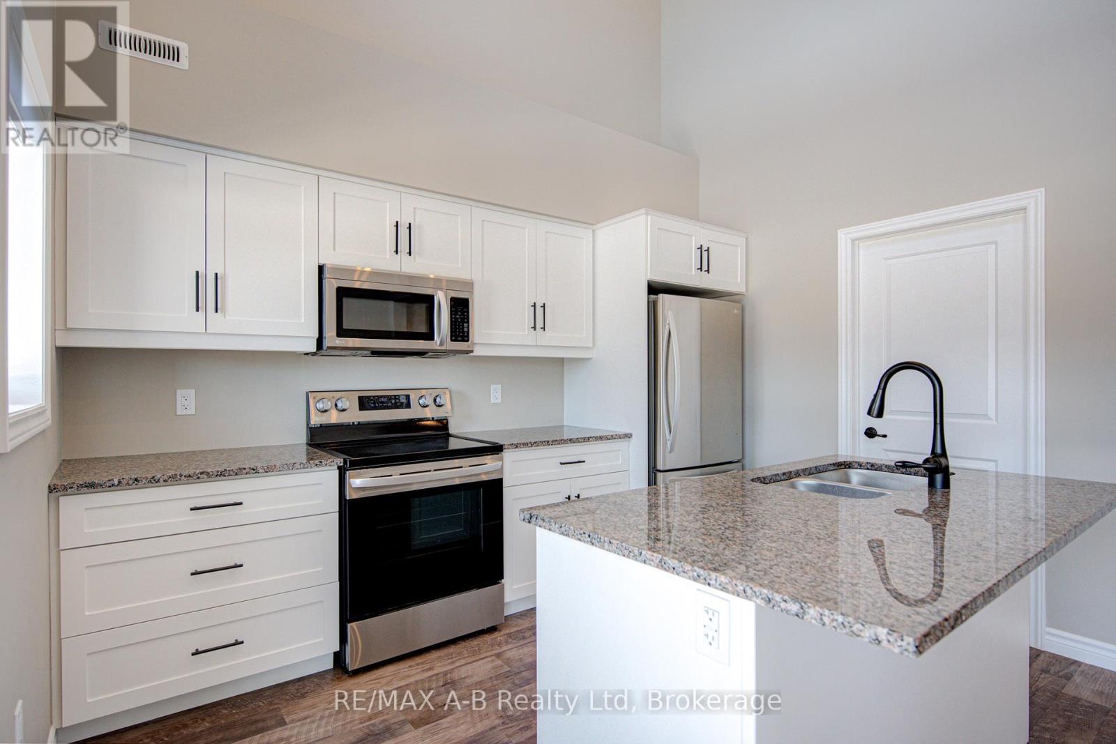 This easy-living 2-bedroom, 2-bathroom, two-storey loft-style condo offers stylish upgrades and modern comfort throughout. The bright, open-concept main floor features 16-foot ceilings and large windows that fill the space with natural light. Upgrades include stainless steel appliances, a kitchen island, in-suite laundry with a full-size stackable washer and dryer, central air conditioning, and an energy-efficient tankless hot water heater. This unit also includes a 6' x 12' storage locker and TWO dedicated parking spaces conveniently located right outside your door.Relax with your morning coffee on the cozy balcony. Ideally located close to shopping, parks, the Stratford Country Club, and offering easy highway access, this property is also a fantastic investment opportunity. Don't miss your chance to own this beautiful home - book your showing today! (id:64974)