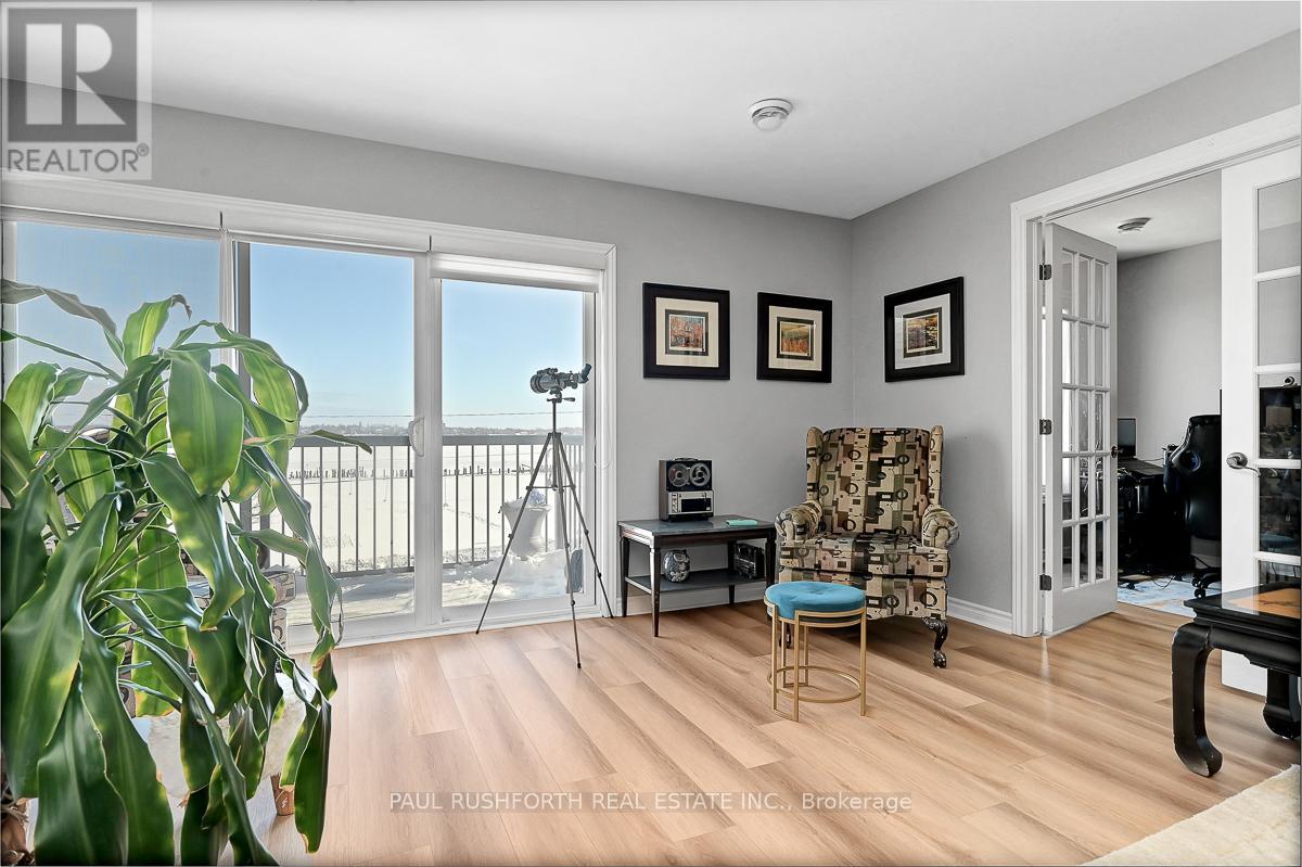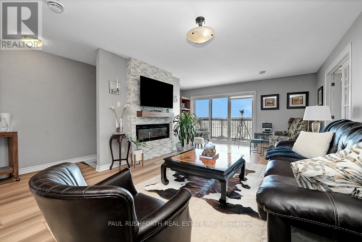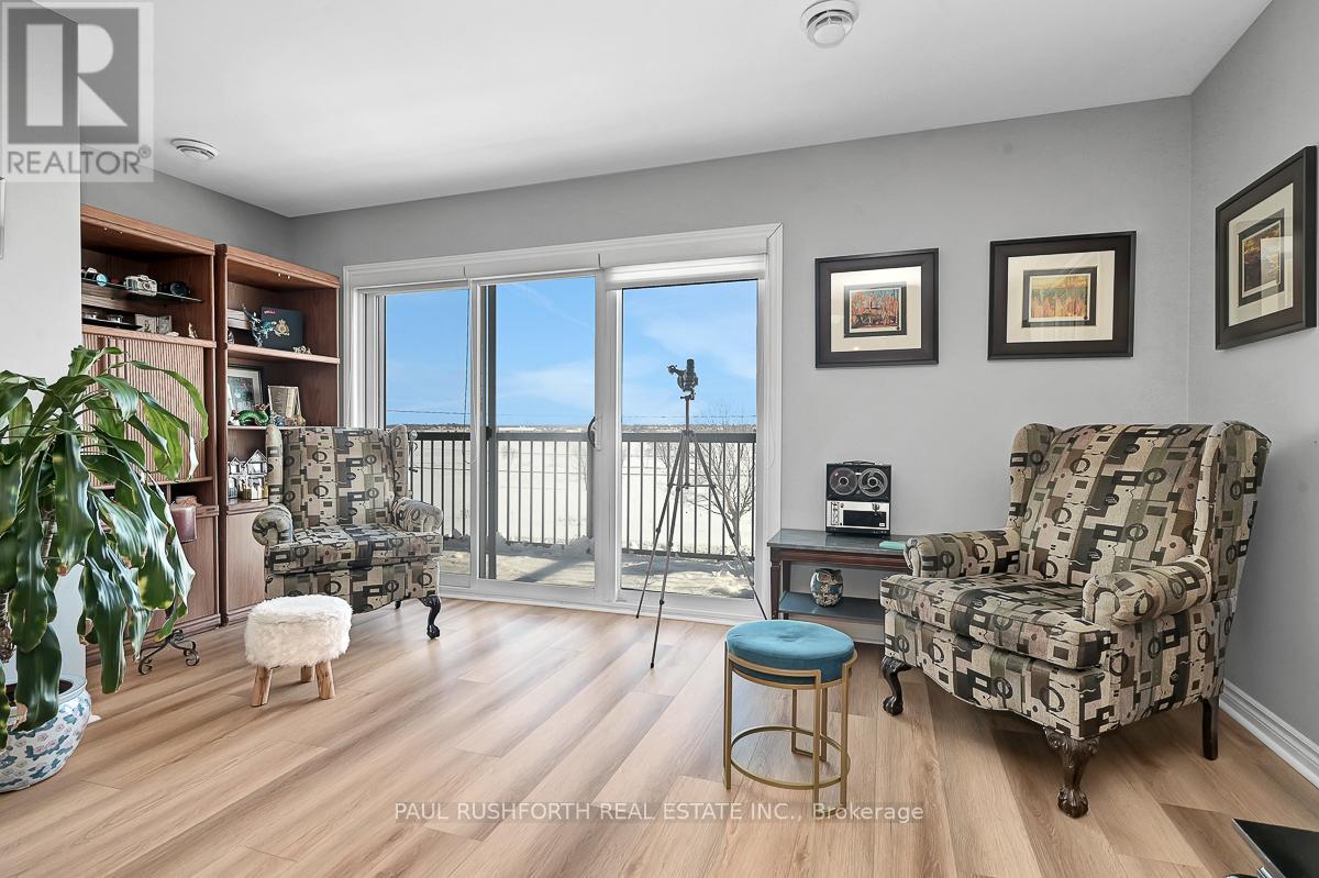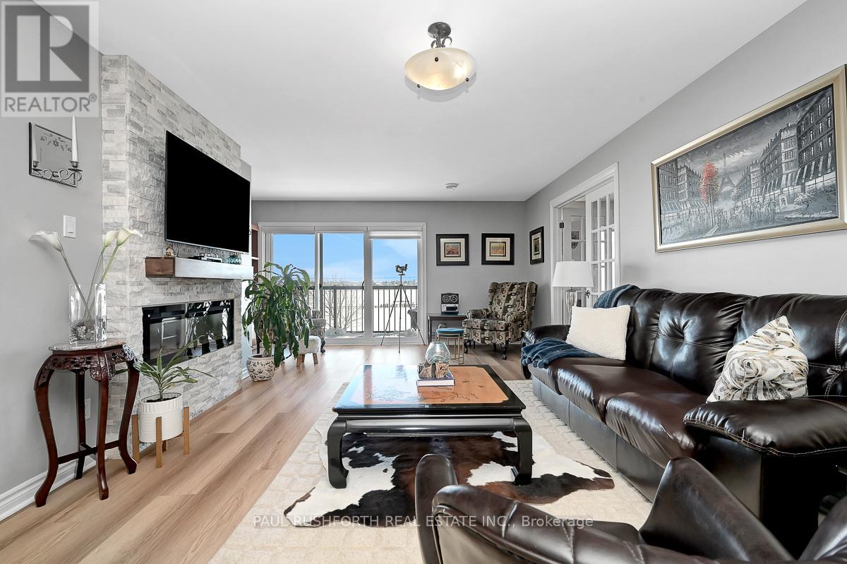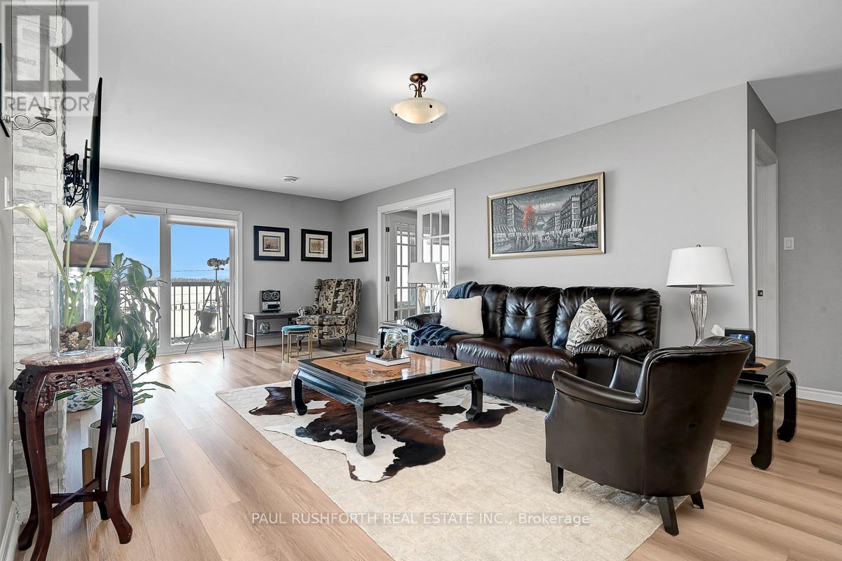 If you are looking for maintenance free living with killer views of the St Lawrence River, this is the perfect spot for you. Located in the lovely town of Prescott, this 2nd floor condo has over 1000SF of space including 2 bedrooms, a 4pc bath and in-suite laundry. Amazing unobstructed views of the river and perfect walkability to the downtown and it's amenities. Close to Prescott Golf Club, Highways 401 & 416, bridge to the US and so much more. 1 hour to downtown Ottawa. Inside you will find open living space with plenty of light and new high end vinyl flooring. Beautiful stone accent wall in the living room with electric fire place adds warmth to the space. Two spacious bedrooms with new custom closet in the primary. Condo fees include: property maintenance, snow removal, grass cutting, reserve fund allocation. This unit currently has one parking space, but another is available for just $15/month. Perfect place to come and go or enjoy small town living with all it's perks. (id:64974)