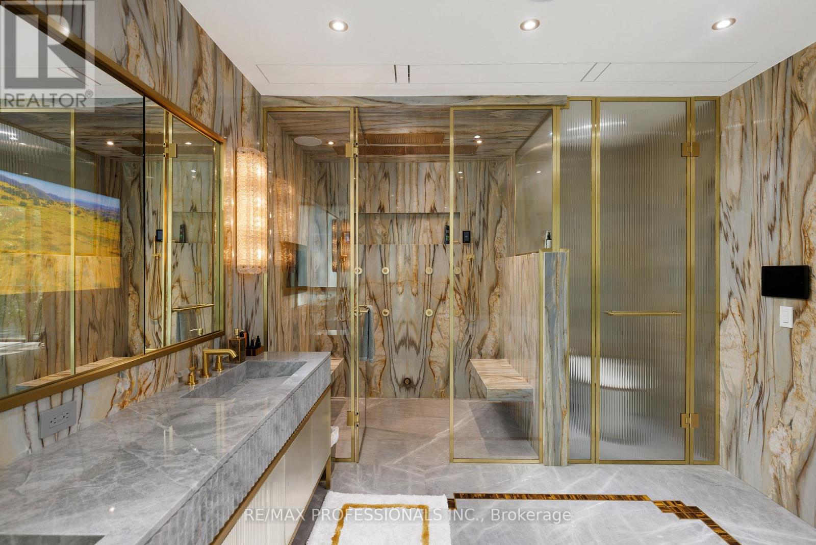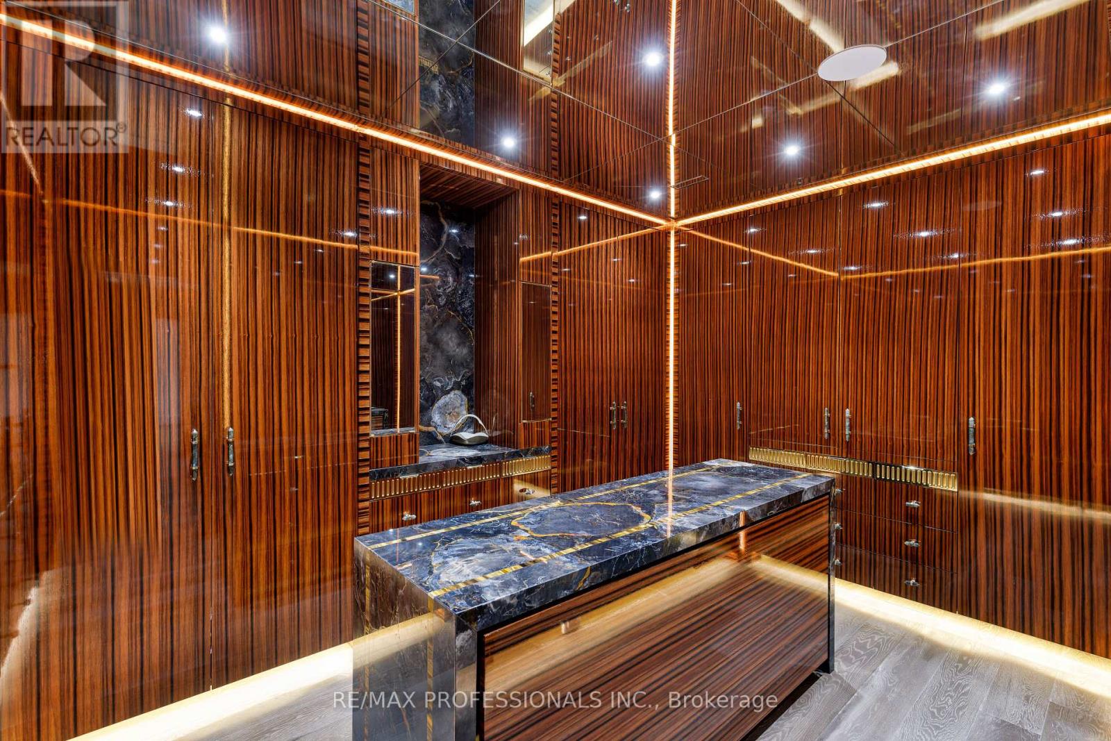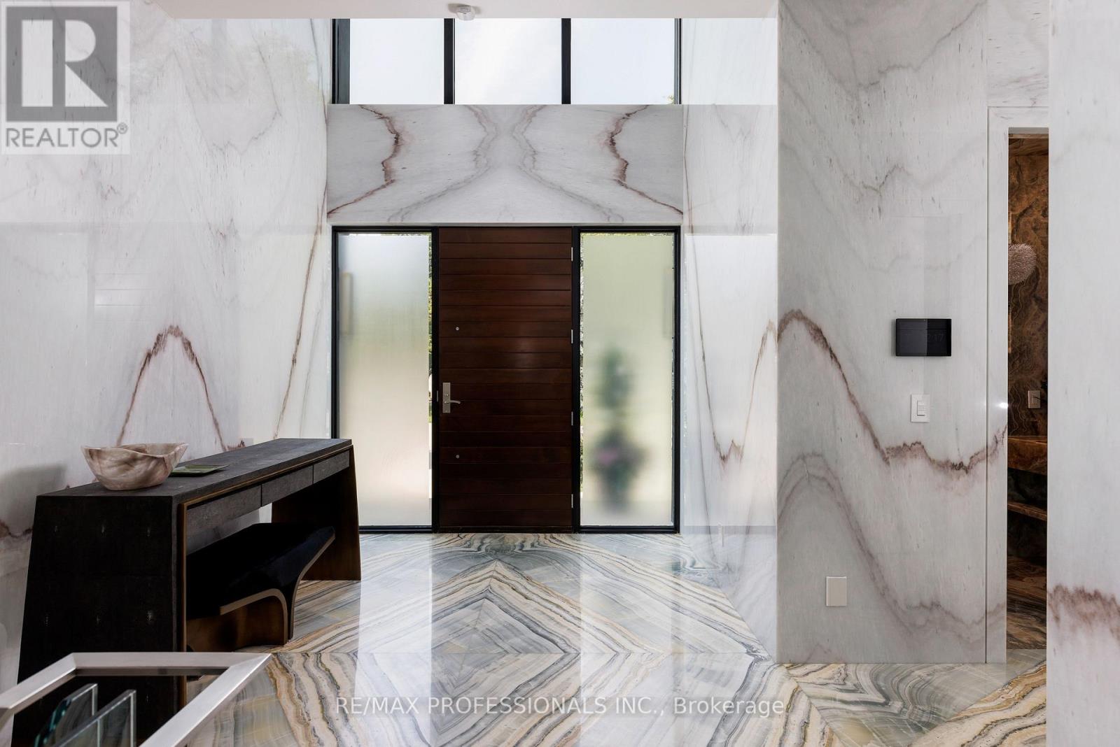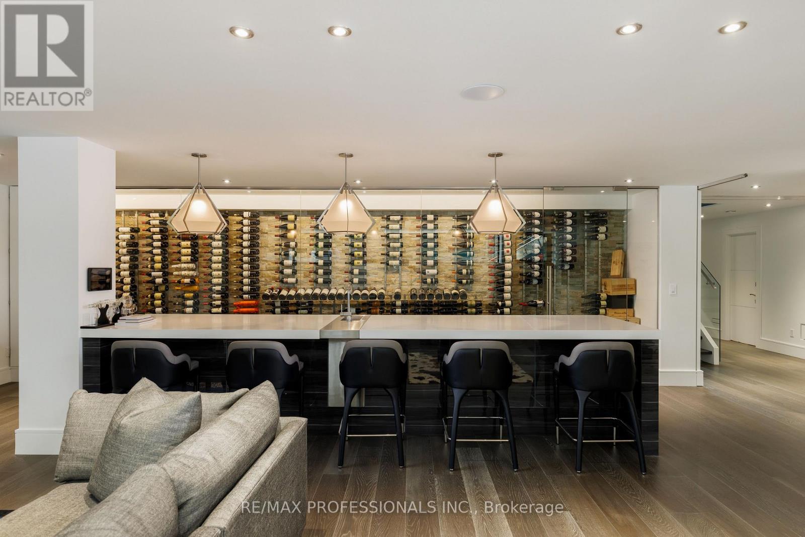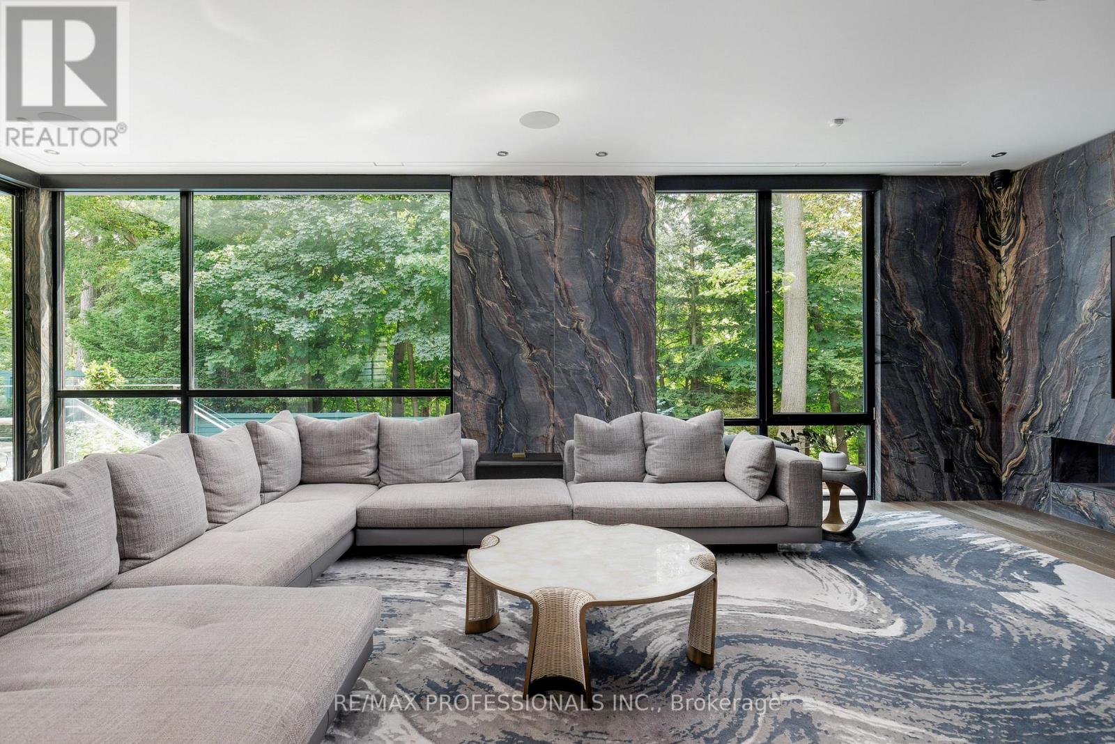 Spectacular Custom home on Lambton Wood Ravine in prestigious Edenbridge Humber Valley. Idyllic private setting with secluded oasis complete with pool and east facing garden backing onto the wooded ravine. Enter inside a masterpiece of custom stonework throughout with floor to ceiling marble and endless upgrades and luxury appointments. 7000+ square feet of living space offers residents top of the line Gaggenau appliances and furnishings that overlook the backyard living and dining areas. The second floor offers 4 fully furnished bedrooms each with private ensuite baths. The primary bedroom is amongst the finest with ravine views and built in TVs and a 5 piece ensuite and walk in closets like no other. Lower level offers a full bar & temperature controlled wine cellar with sprawling lower living space complete with professional gym & spa/cold plunge & sauna. Not to be missed, the garage includes a two car lift. Truly a lifestyle experience and unequivocally the finest in finishes throughout nestled on one of the quietest streets in the area. Steps to Humber town plaza, Bloor, and close to all major highways. Short commute downtown & top school district. (id:64974)