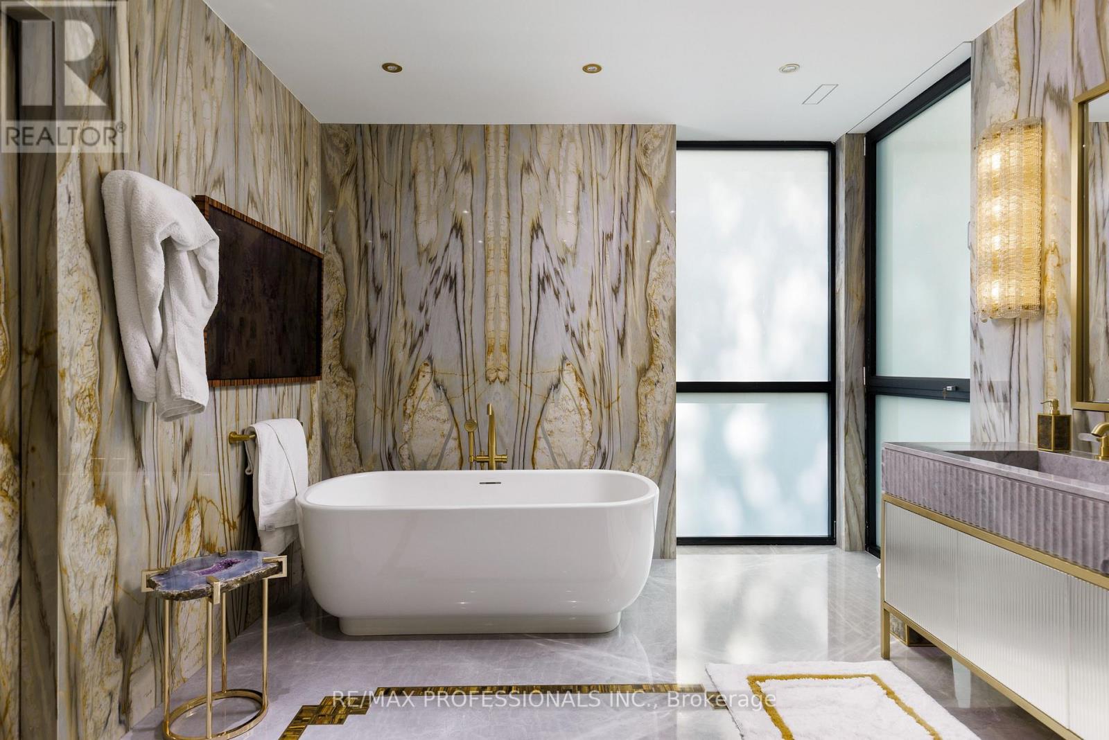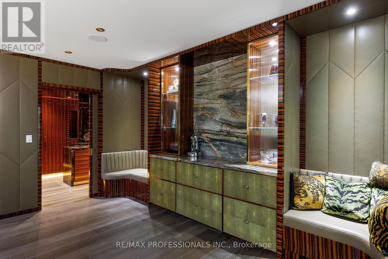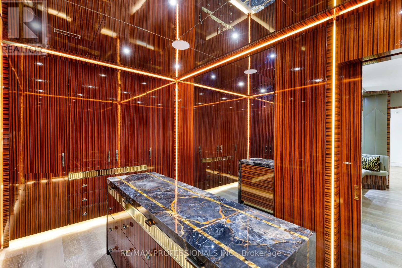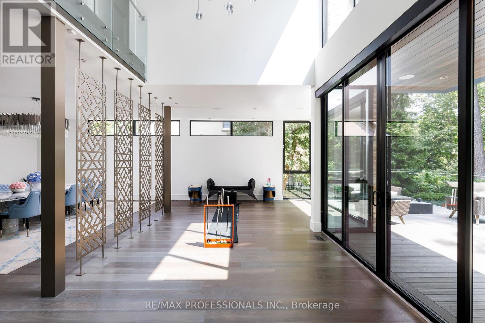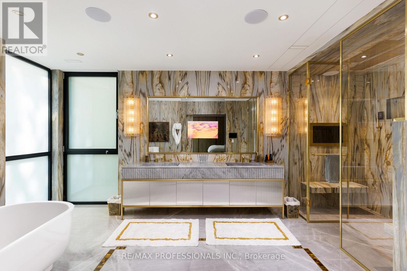 Spectacular Custom home on Lambton Wood Ravine in prestigious Edenbridge Humber Valley. Idyllic private setting with secluded oasis complete with pool and east facing garden backing onto the wooded ravine. Enter inside a masterpiece of custom stonework throughout with floor to ceiling marble and endless upgrades and luxury appointments. 7000+ square feet of living space offers residents top of the line Gaggenau appliances and furnishings that overlook the backyard living and dining areas. The second floor offers 4 fully furnished bedrooms each with private ensuite baths. The primary bedroom is amongst the finest with ravine views and built in TVs and a 5 piece ensuite and walk in closets like no other. Lower level offers a full bar & temperature controlled wine cellar with sprawling lower living space complete with professional gym & spa/cold plunge & sauna. Not to be missed, the garage includes a two car lift. Truly a lifestyle experience and unequivocally the finest in finishes throughout nestled on one of the quietest streets in the area. Steps to Humber town plaza, Bloor, and close to all major highways. Short commute downtown & top school district. (id:64974)