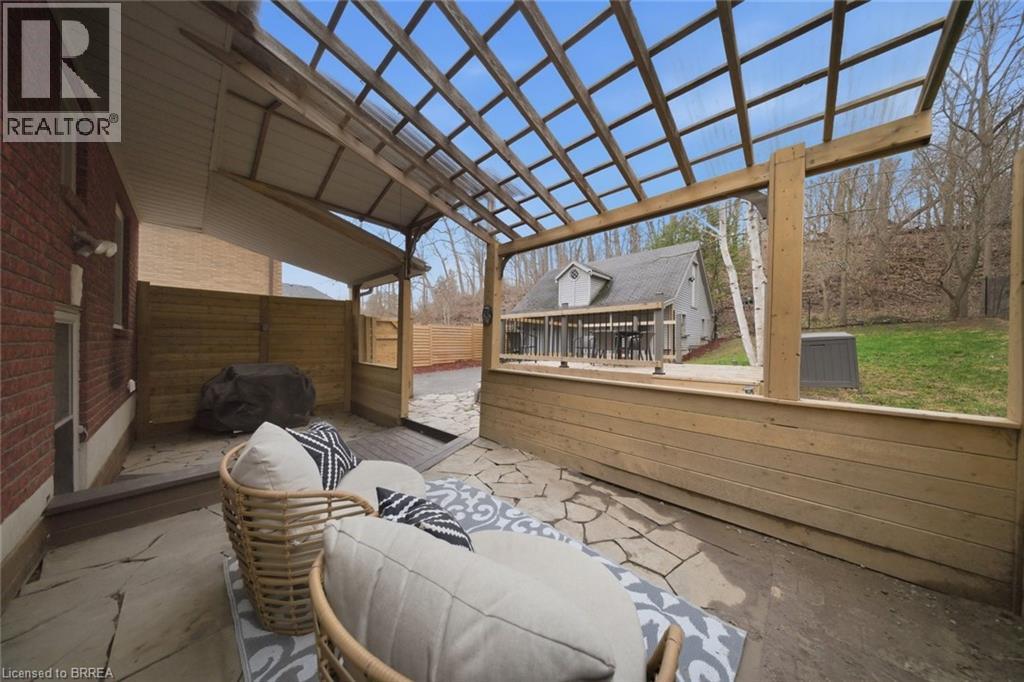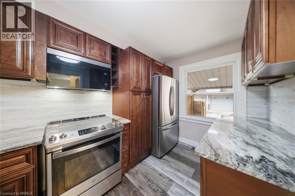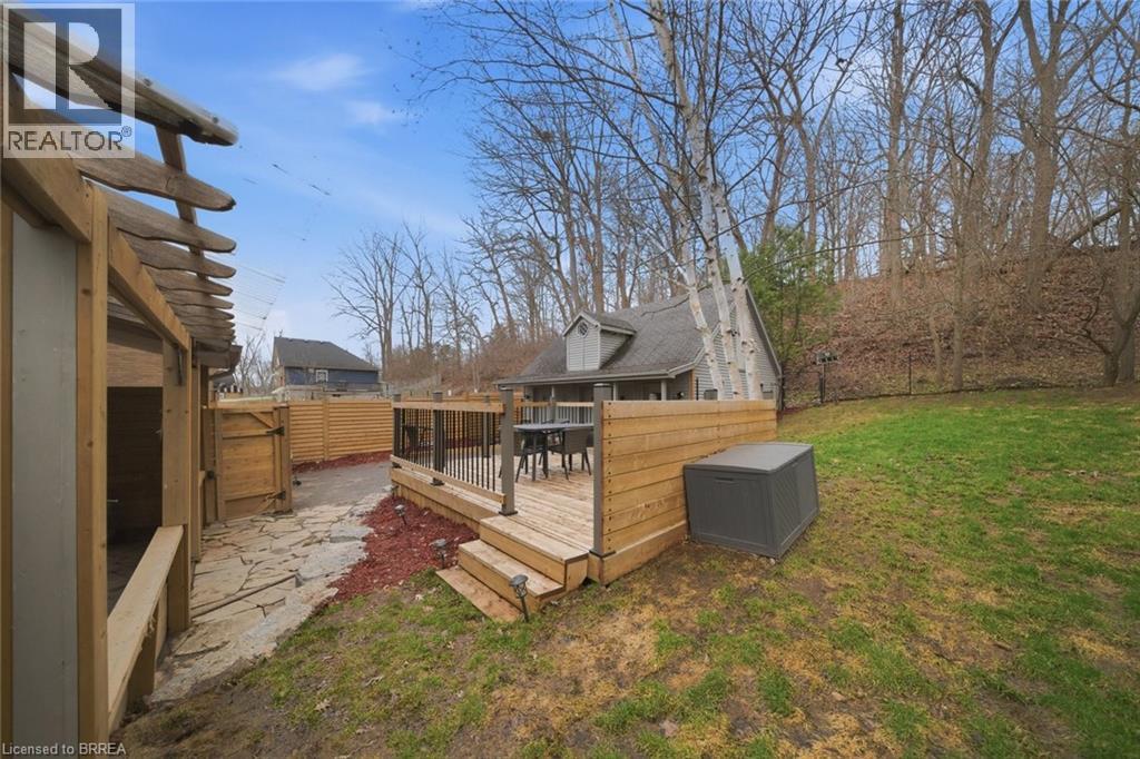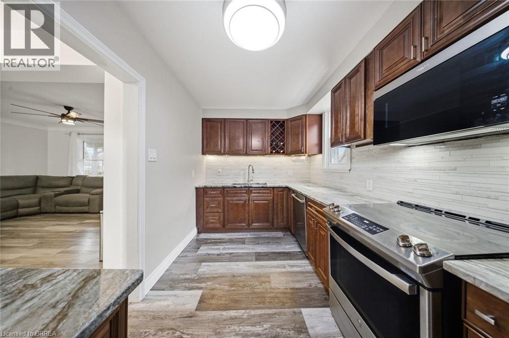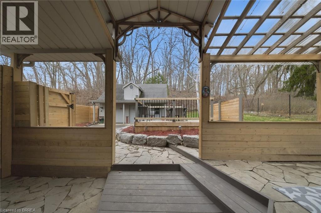 Welcome to 7 Barry Drive, a beautifully maintained and updated home nestled in a quiet cul-de-sac in the highly sought-after Old West Brant neighborhood. Backing onto a peaceful forested area, this charming property offers exceptional privacy and a serene natural setting. Inside, you'll find a warm inviting layout featuring stylish luxury flooring throughout the main level. The bright living room is enhanced with crown molding, high baseboards, and an open concept dining space. A gorgeous, updated kitchen is filled with natural light and showcases granite countertops, stainless steel appliances, loads of updated cabinetry and, tile backsplash, Upstairs offers two spacious bedrooms, a linen closet, and a beautifully finished 4-piece bathroom with vaulted ceilings, wood accents, and a tub/shower combo. The finished basement provides a generous recreation room along with a 3-piece updated bath with walk in shower and separate laundry area Outside, the deep, lush backyard is a private retreat with no rear yard neighbors and is complete with a two-tier covered flagstone patio newer deck and is fully fenced. A standout feature is the massive detached 2-car garage with a full walk-up attic, is fully insulated and heated offering incredible potential for a workshop, studio, or additional storage. Located close to excellent schools, parks, and everyday amenities, this home perfectly blends comfort, character, and convenience. (id:64974)