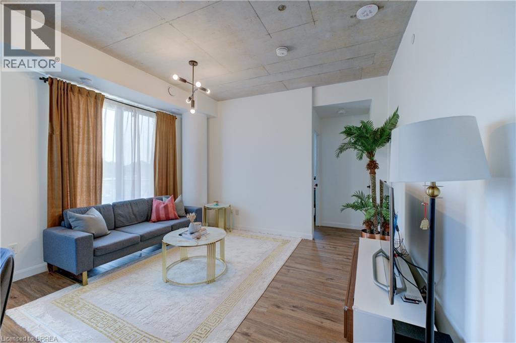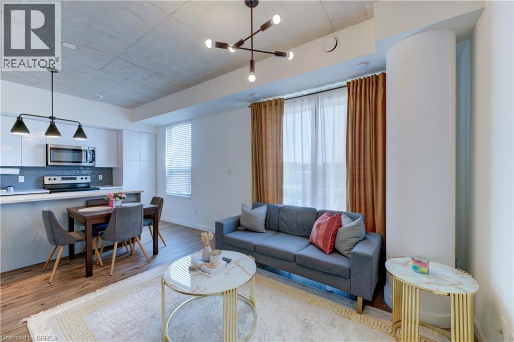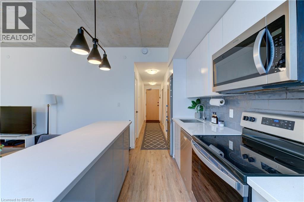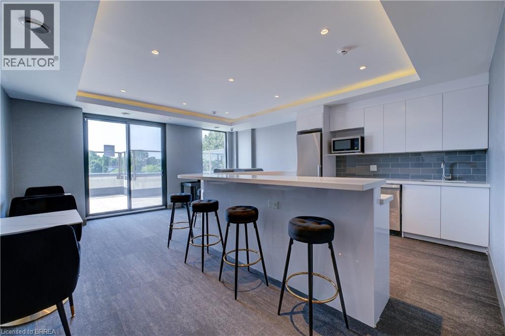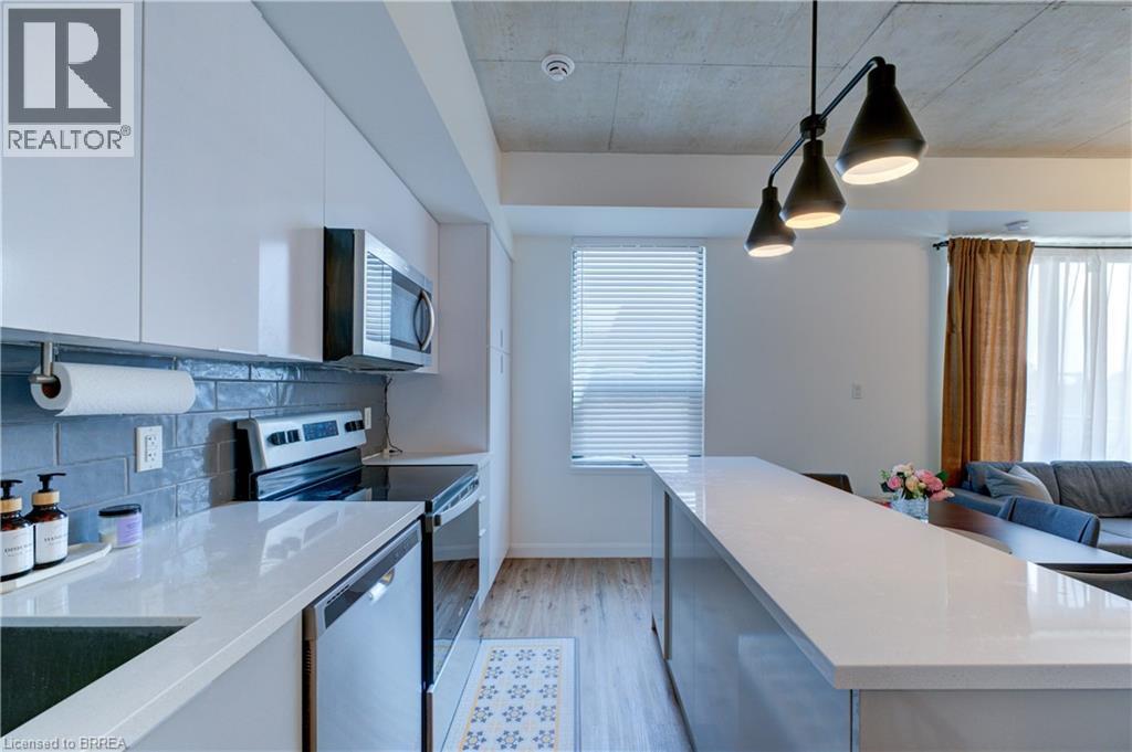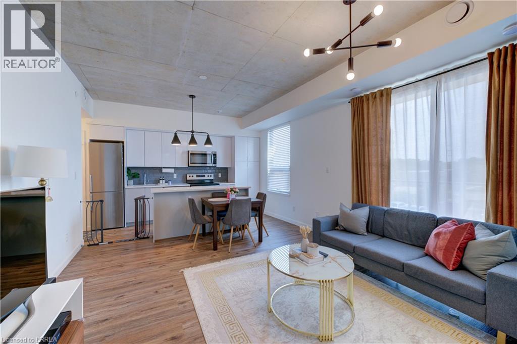 Indulge in sophisticated living with this stunning 2 bedroom, 2 bathroom carpet-free condo. Located in a very modern building, secure double-door entry leads to a welcoming lobby. Enjoy direct access to exceptional amenities. Inside the unit, discover 9-foot ceilings, sleek European-style cabinetry, premium finishes, durable engineered plank flooring, elegant porcelain tiles and luxurious stone countertops. Stainless steel appliances and in-suite laundry add to the convenience. This unit is perfectly situated on the same floor as the fitness centre, expansive & versatile party/meeting room, exclusive executive lounge and a breathtaking rooftop terrace with BBQ facilities. Enjoy your own private balcony, your own highly-valued designated parking spot and a main floor locker in the massive locker room with exterior access for handy bicycle storage & easy retrieval with the Grand River trail system as your play ground! This wonderful condo experience offers both luxury and lifestyle. Easy to show – experience it today! (id:64974)