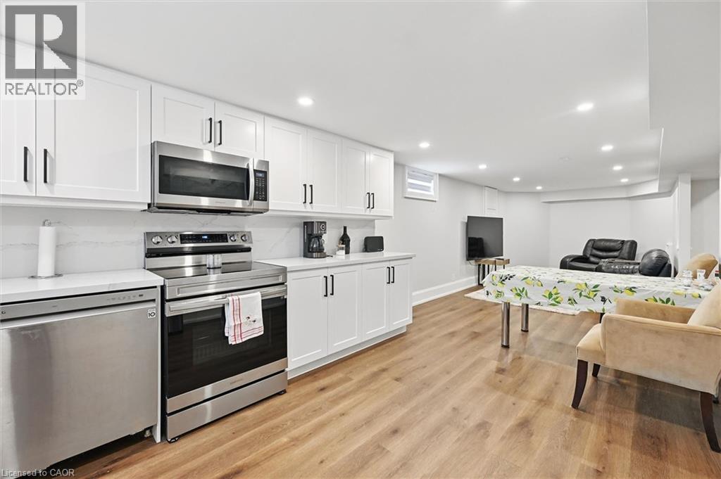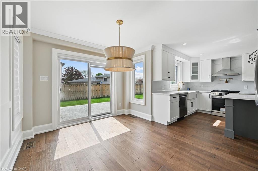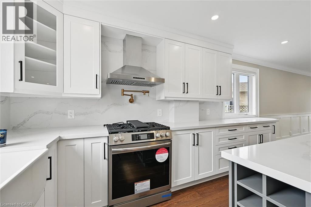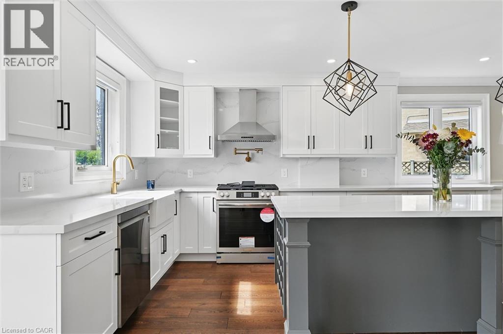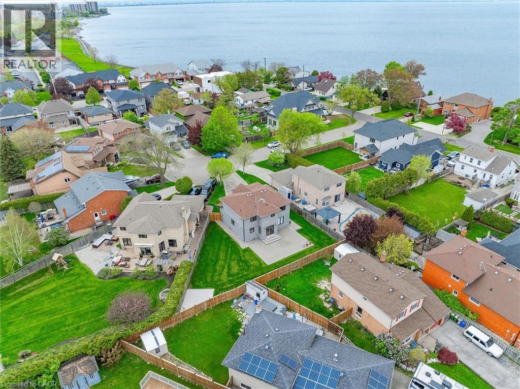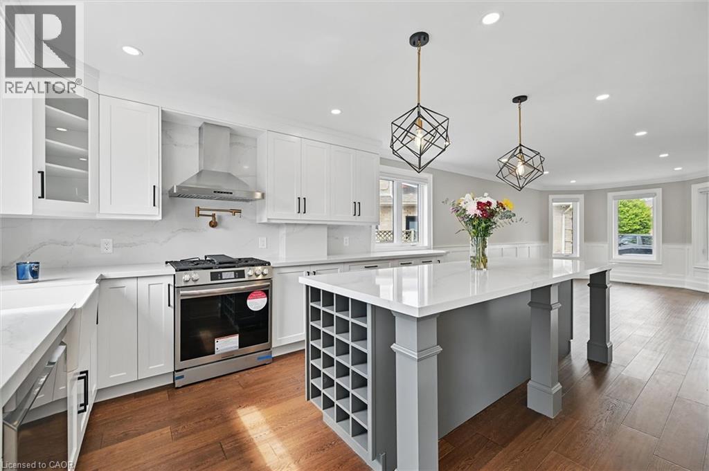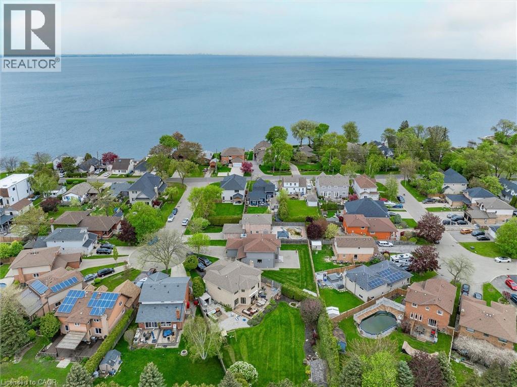 Welcome to 7 Grandview Avenue! Nestled in one of Stoney Creek’s sought-after lakefront beach communities, just steps to Lake Ontario and minutes to shopping, dining, schools, and quick QEW access. Situated on a quiet, family-friendly court, this home was meticulously renovated in 2023 with exceptional quality from top to bottom. A bright, open foyer with soaring ceilings, elegant staircase, and classic wall paneling creates a warm first impression. The main level features a formal living room and a stunning open-concept kitchen with modern soft-close cabinetry, under-cabinet lighting, quartz counters and backsplash, oversized island with built-in wine display, bar fridge and microwave, natural gas range with pot filler, and porcelain apron sink. There is a large dining room with patio doors to rear yard and an inviting family room offers a gas fireplace with custom built-ins, plus a 2 pc bath and large laundry room to complete this level. Upstairs offers three spacious bedrooms, including a primary retreat with walk-in closet and a 4-piece ensuite with double sinks, make-up station and glass shower. A 5-piece main bath features double sinks, deep soaker tub. The lower level includes a fully self-contained in-law suite with separate walk-up entrance, featuring a living room, kitchen with quartz counters and backsplash, stainless steel appliances, bedroom, 3-piece bath, laundry, and ample storage. The fully fenced pie-shaped yard boasts a huge exposed aggregate patio, concrete pad for future shed, and plenty of space to entertain or for kids to play. Extensive upgrades include trim and wainscoting, 5” engineered hardwood flooring, solid interior doors, 7” baseboards, crown molding, pot lights throughout, custom closets, and modern iron railings. Exposed aggregate driveway, walkways, and patios with stamped concrete borders. Double attached garage and double-wide driveway for up to 8 cars. 13 appliances included. Nothing to do but move in! (id:64974)