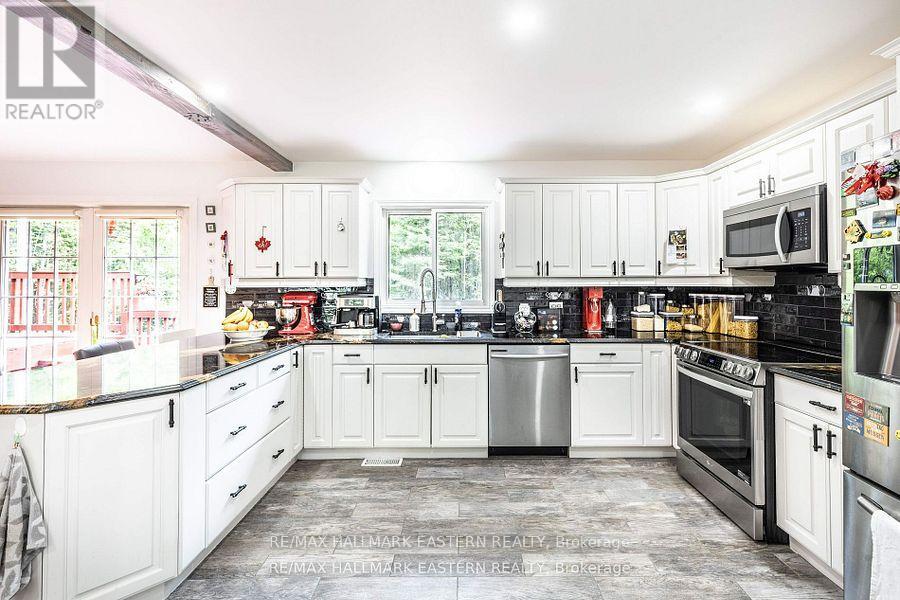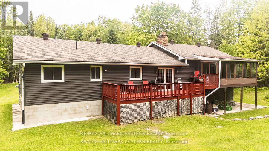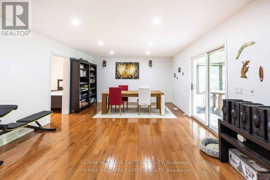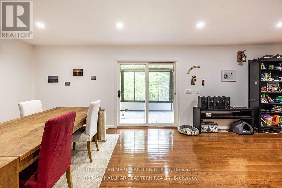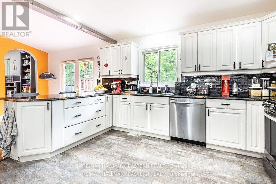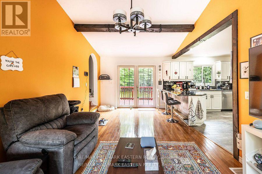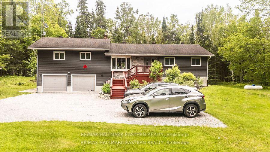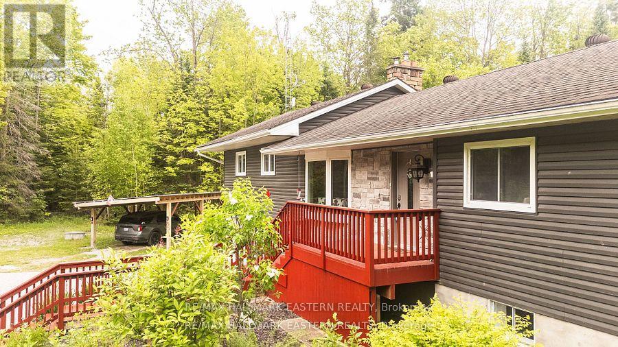Private 1.85-Acre Retreat with In-Law Potential. Tucked away on a quiet, secluded lane and surrounded by mature trees, trails, and nearby lakes, this beautifully maintained bungalow offers the perfect blend of privacy and comfort. Featuring 4+1 spacious bedrooms and 3bathrooms, this home is ideal for a large or blended family. A separate entrance through the double car garage provides excellent potential for an in-law suite or multi-generational living. The inviting family room showcases a stunning stone fireplace, while the open-concept dining area walks out to a large rear deck, perfect for entertaining or relaxing in nature. The modern kitchen offers granite countertops and hardwood flooring throughout the main level. Major updates include a new carport (2023), paved driveway (2022), owned hot water heater(2023), water purification system (2022), garage door opener (2023), updated sump pumps(2022-2025), generator(2023), and a current WETT certificate (2024). Move-in ready and set in a peaceful, natural setting, this is country living at its finest! (id:64974)