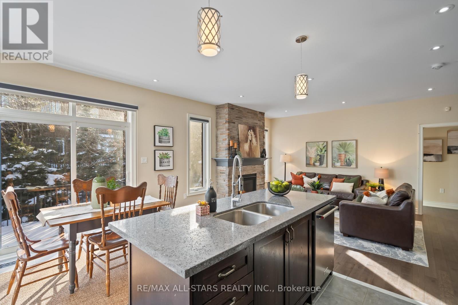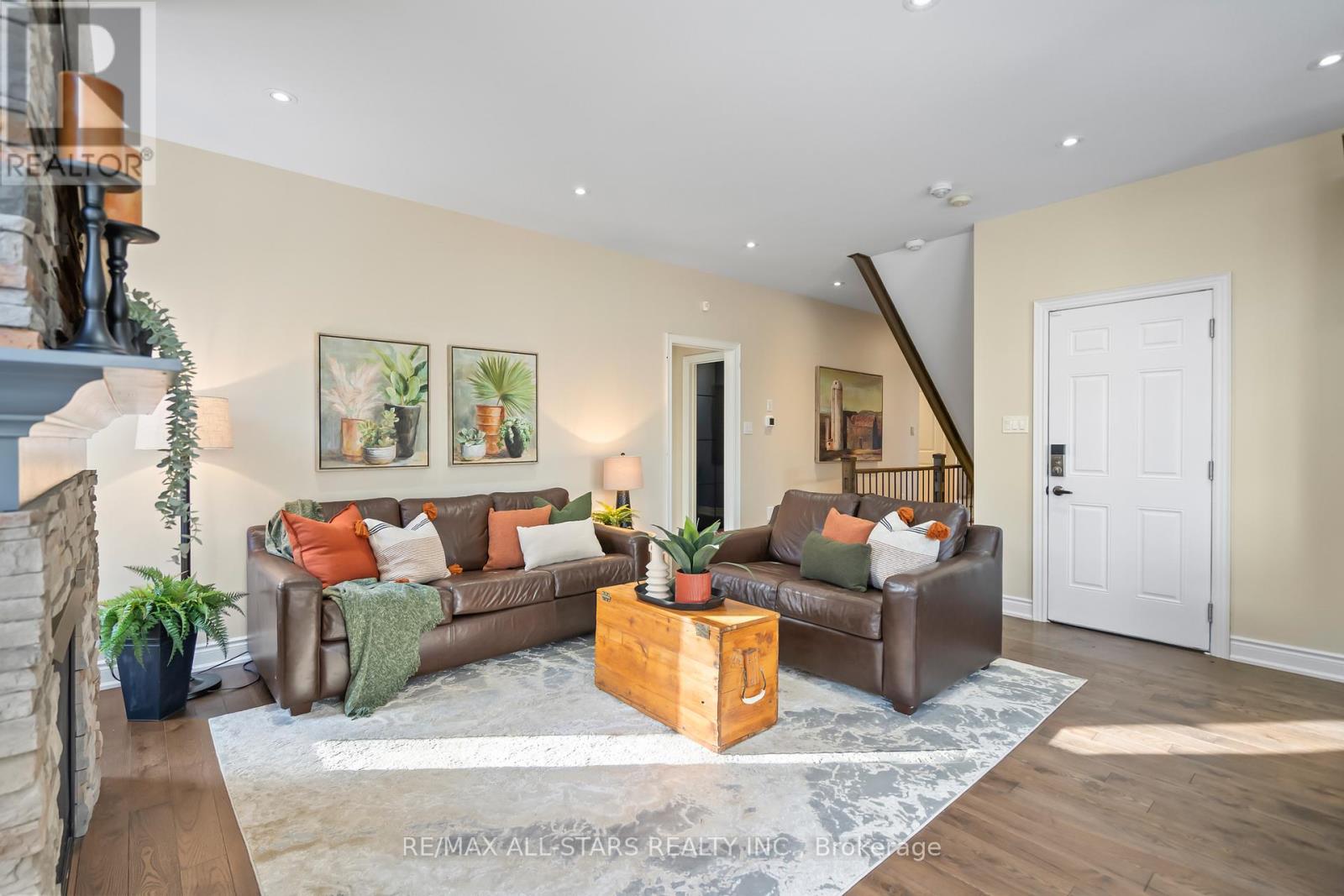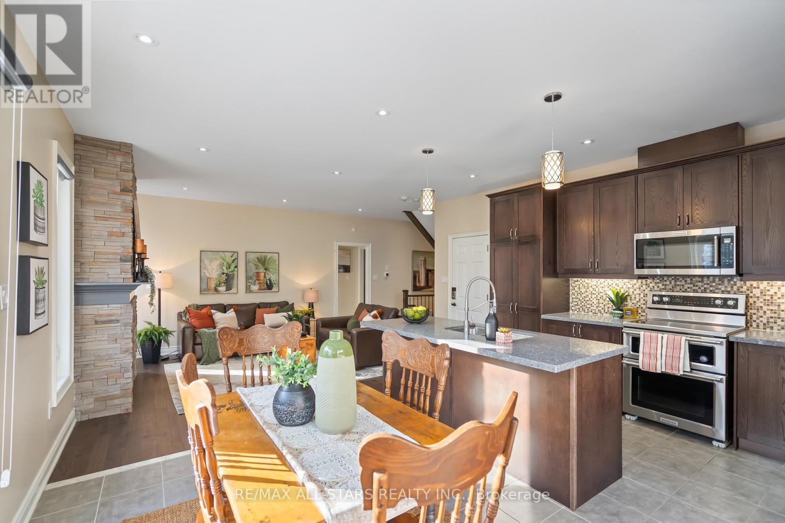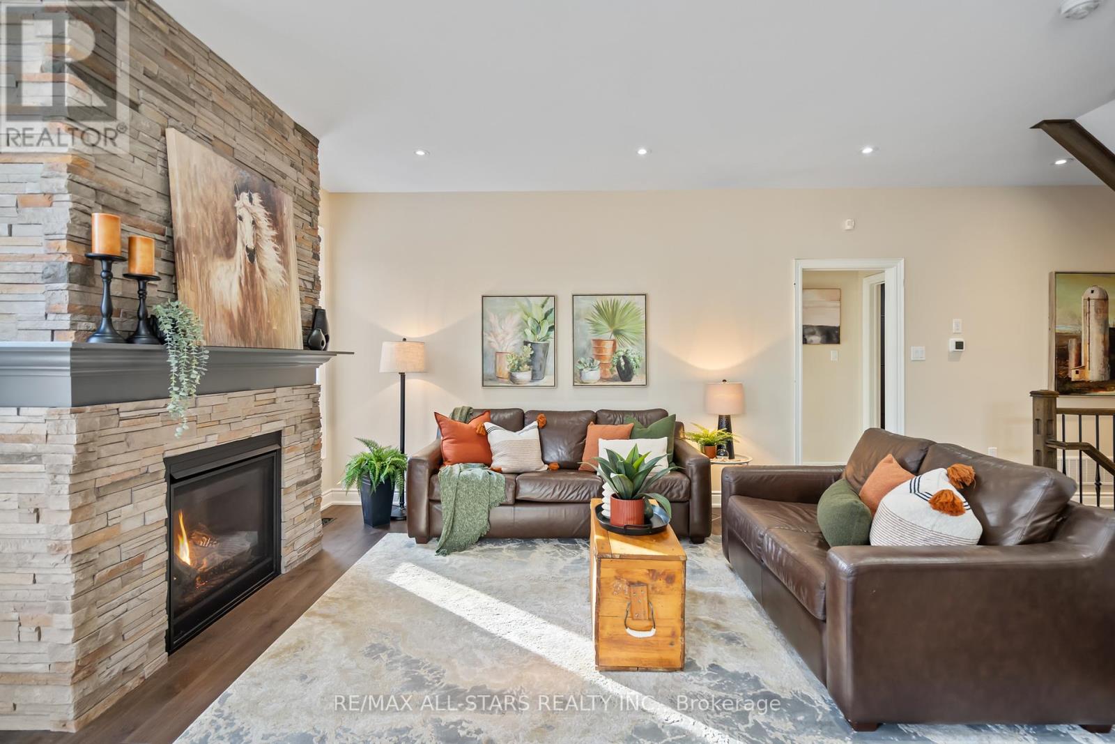 Curb appeal is the first thing you notice with this beautiful 4 bedroom bungaloft on prestigious Os James Hunt Court. With rich red brick and a neutral stone facade, interlock walkway and natural stone steps you are welcomed with immediate warmth. Entering the home you'll appreciate the open concept layout across the back of the house including the living room with gas fireplace featuring cultured stone veneer and framed within 2 large windows, the spacious kitchen with stainless steel appliances and quartz countertops and the dining area which walks out to the deck through the patio slider. The principal suite includes a 5 pc ensuite with built in soaker tub and glass shower enclosure and a spacious walk-in closet with wardrobe. The 2nd Bedroom overlooks the front with a gorgeous arched window and has semi-ensuite access to the 4pc main bathroom. Laundry is conveniently located on the main floor while two additional closets provide ample storage for linens and jackets near the foyer. The upper level features two additional large bedrooms with closet organizers and a third full bathroom. The lower level is unfinished, you can visualize the potential with the wide open space and above-grade windows, and includes a rough-in for an additional bathroom. The landscaped backyard features a raised composite deck (permitted 2017 per MPAC) and interlock patio seating area which continues to wrap around to the gate and walkway to the front of the house. **EXTRAS** POTL $286.94.57 includes street snow removal and garbage/recycle/compost waste removal - full inclusions to be confirmed with the Status Certificate. (id:64974)
