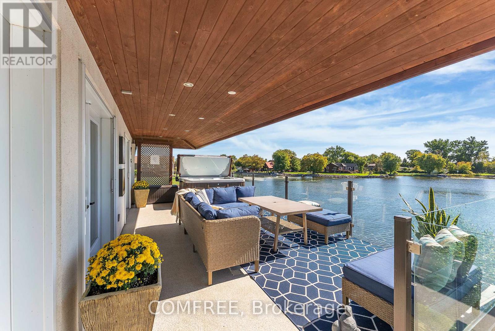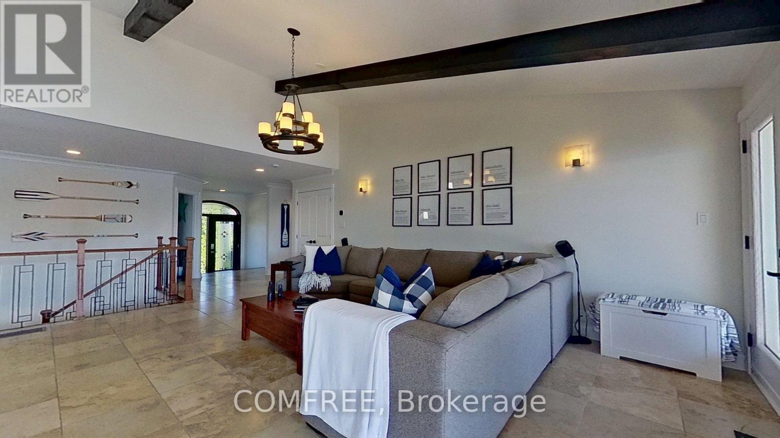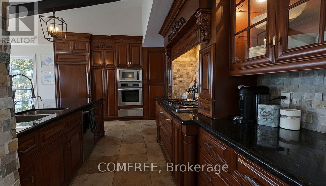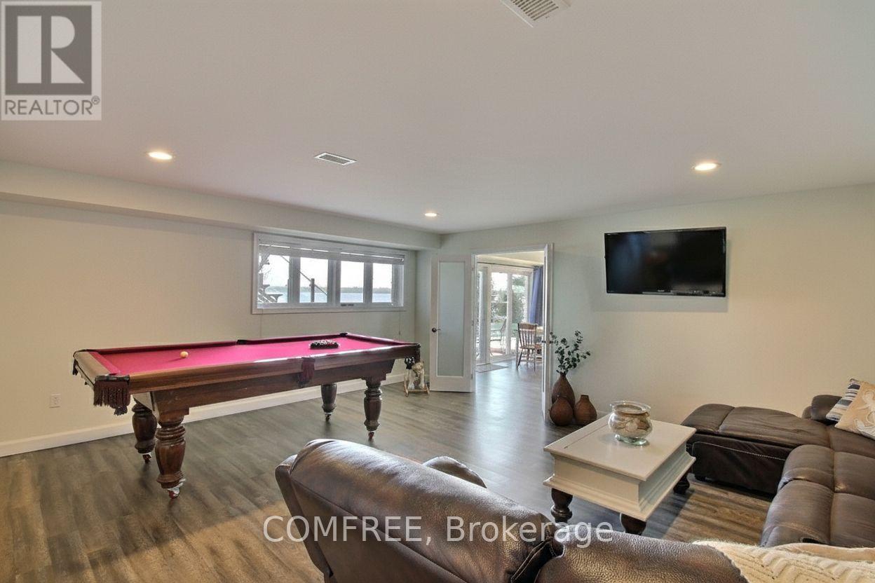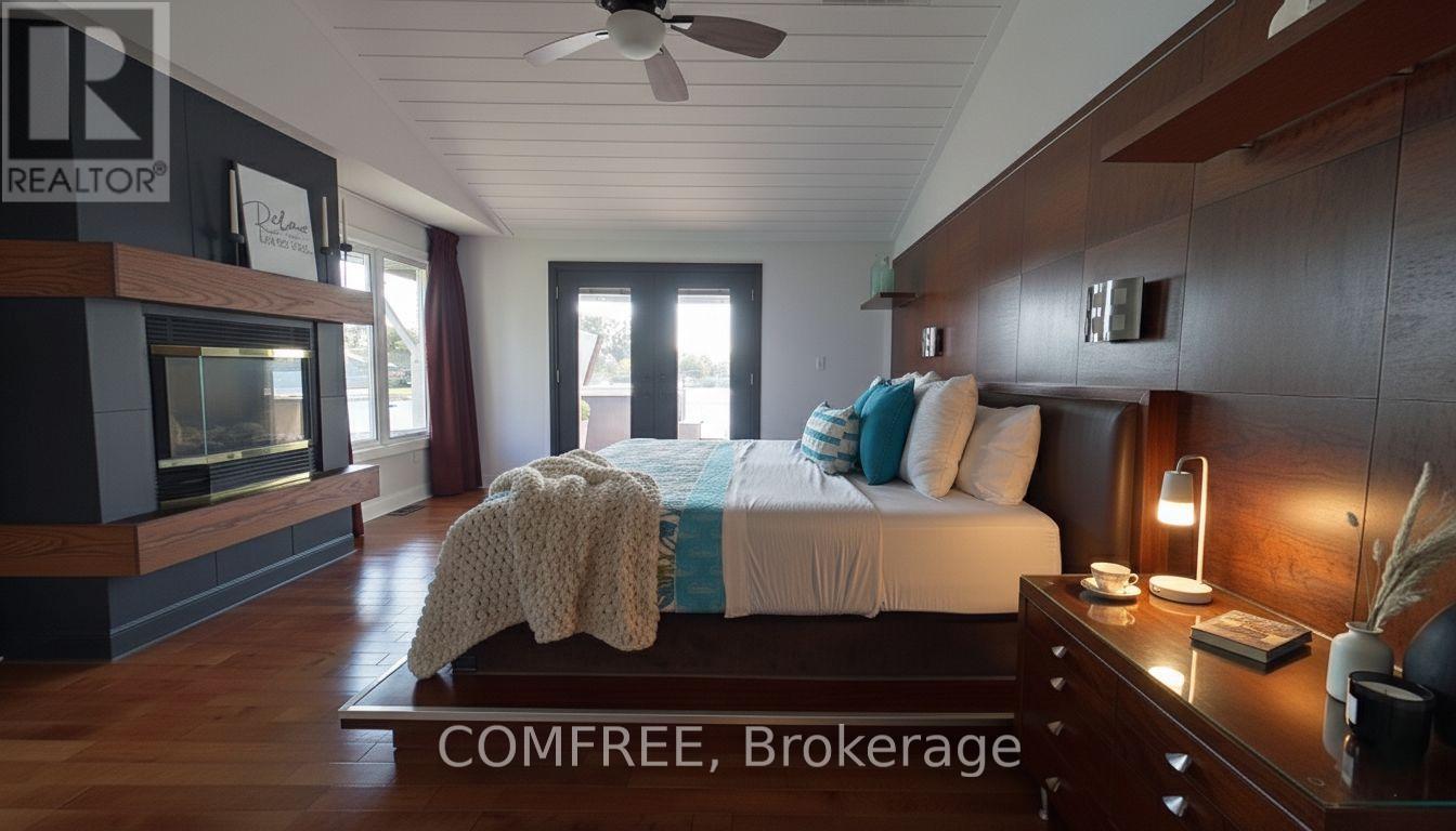 Welcome to your lakeside escape with this stunning southern exposure waterfront home that sits at the end of a quiet cul-de-sac in the town of Brighton, on a protective cove of Presquille Bay with an incredible 175 ft of waterfront. This property is a rare opportunity of both sheltered waters for docking and kayaking, complete with a Seadoo/kayak lift, as well as the open-water adventures awaiting nearby on Lake Ontario. With the benefit of Brightons charming downtown a mere 5 minutes away and full municipal services, this waterfront location is rare. Wall to wall french doors along the entire length of the home provides natural light and sweeping breathtaking views of Presquille Bay. The home features vaulted beamed ceilings, a main floor open-concept layout, a 50 ft covered deck complete with hot tub, a gourmet kitchen that boasts granite counters, a 9-ft island, gas cooktop, heated floors and Sub-Zero fridge. Centered between the dining space and great room and kitchen is a magnificent floor -to-ceiling stone fireplace. The luxe primary suite offers a fireplace, walk-in closet with laundry, and walkout to the hot tub. A study or 2nd bedroom is located off the front foyer. The bright finished walkout basement offers excellent potential for an in-law suite or separate apartment, with its large windows also overlooking the Bay. The lower level has a 4 pc bath, rec room, two bedrooms, and a hobby room/gym with plumbing and patio doors to a second outdoor bricked patio area. The property offers plenty of storage options with an attic above the garage and an expansive enclosed shed under the main deck. The driveway accommodates up to 6 vehicles plus an RV/boat pad. No worries about power outages as there is a hard wired natural gas generator. (id:64974)