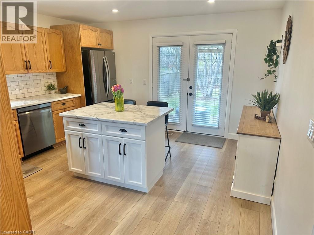 Welcome to this beautifully updated 3-bedroom bungalow in Port Dover! The main floor showcases new high-end scratch-resistant flooring, fresh trim and baseboards, a stylish 4-piece bathroom, and flat ceilings with pot lights. The kitchen features newer stainless steel appliances with a gas range, plus new countertops and sink, and walks out to a private patio—perfect for entertaining or enjoying your morning coffee. A versatile small bedroom on the main floor also offers excellent potential to be converted into a convenient main floor laundry room. The carpet-free basement includes a cozy recreation room, spare room, and 3-piece bath, offering great additional living space. Outside, the fully fenced and landscaped yard also includes a charming storage shed. Added peace of mind with HVAC (2022) and owned hot water heater (2023). Experience the best of Port Dover living with wineries, walking and biking trails, and the beach, downtown shops, and restaurants just minutes away. (id:64974)