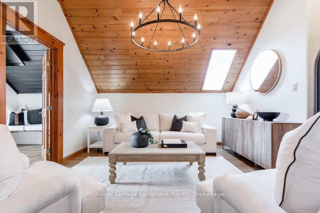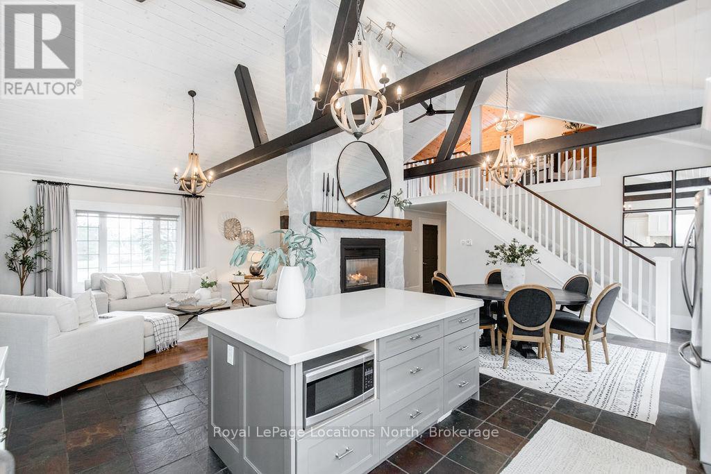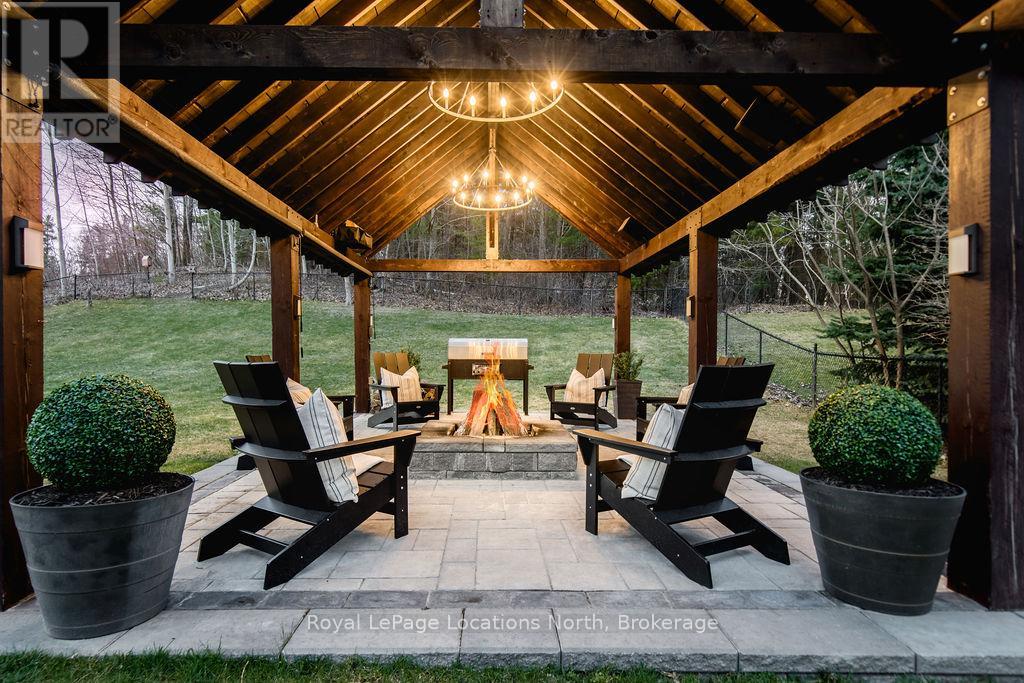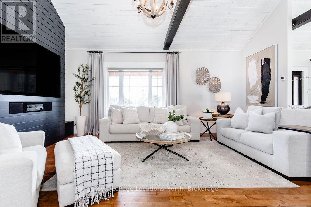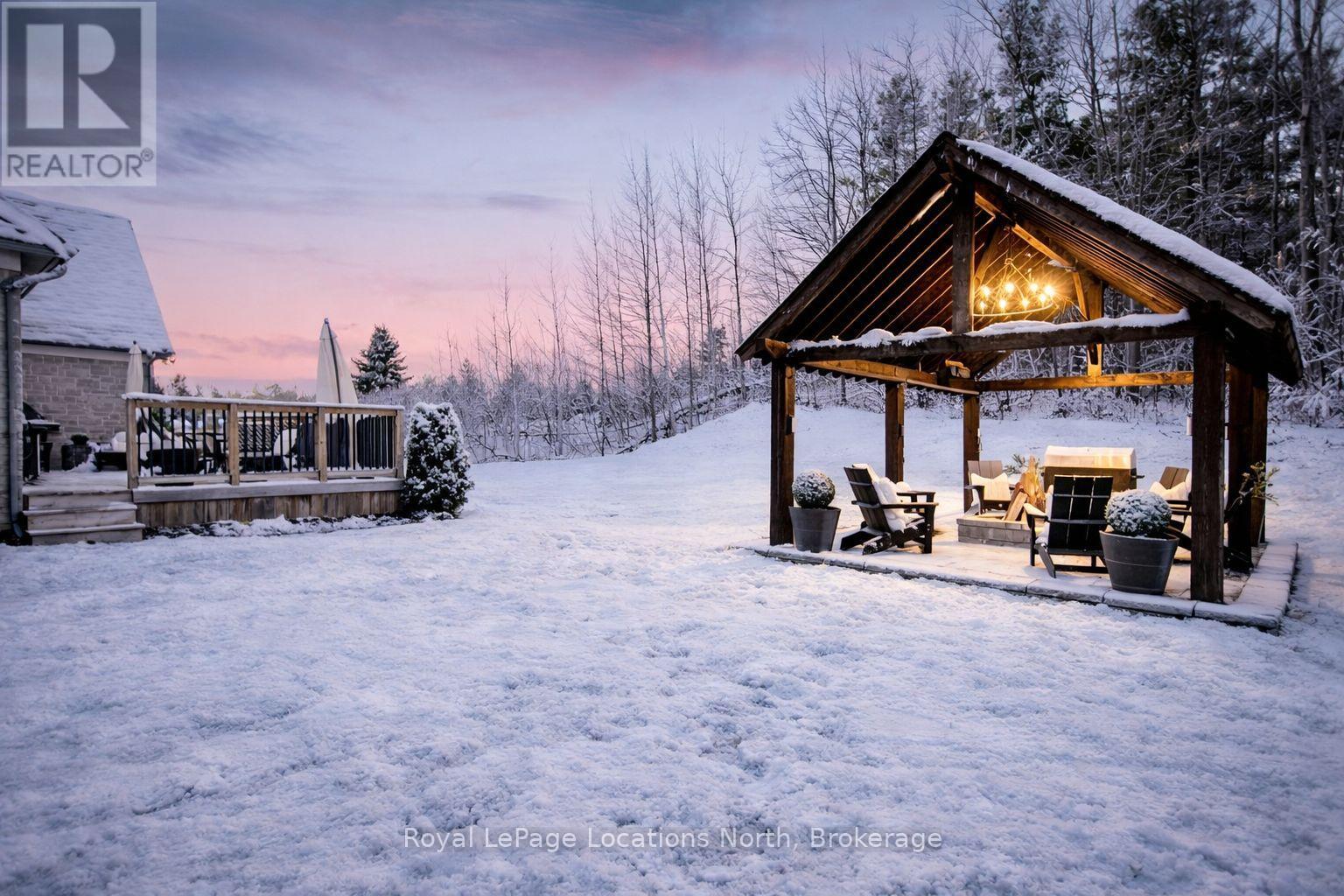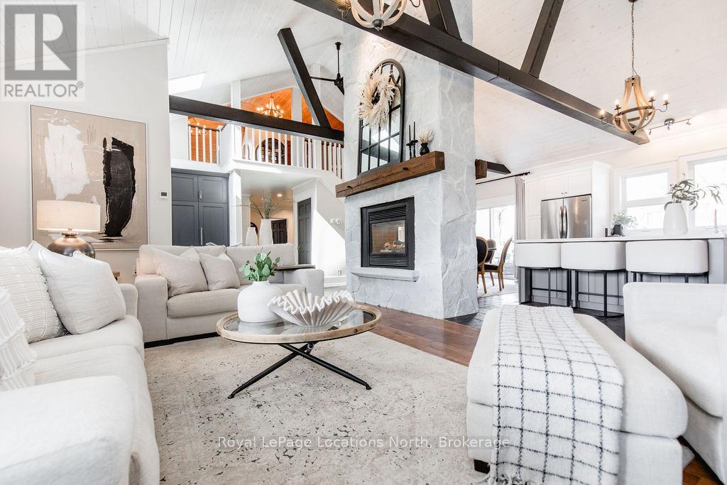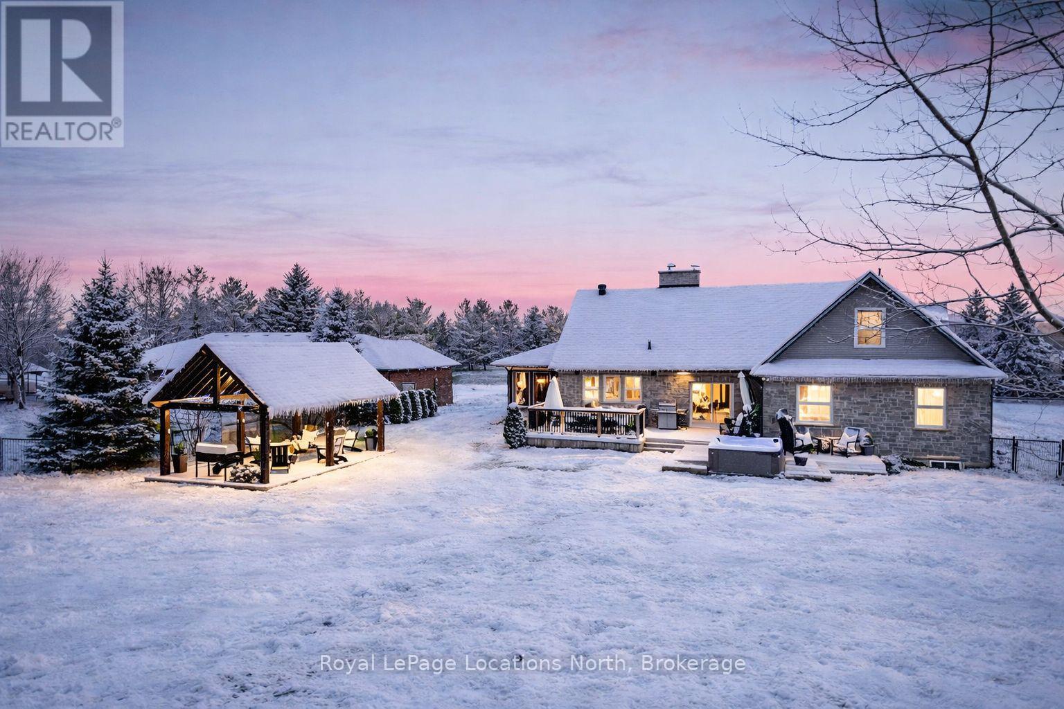Set on a large, mature estate lot backing onto trees in the popular Wasaga Sands estate area, this custom-built modern rustic home offers privacy and warmth. Summer evenings invite you into the backyard where the timber-frame gazebo glows under custom lighting, the fire pit crackles and the treed backdrop creates a peaceful, resort-like setting. In winter, the snow-covered trees provide a serene view, perfect for unwinding by the fireplace after a day of skiing or snowshoeing. Inside, the home showcases vaulted ceilings with classic chandeliers, rich hardwood flooring throughout, and a stunning floor-to-ceiling stone fireplace that is the center piece to the open-concept family room and kitchen. The custom kitchen is ideal for entertaining, featuring a bright white palette, quartz countertops, custom backsplash and a spacious 9-foot island. Steps from the kitchen is a beautifully finished 3-season room, offering a comfortable retreat to enjoy the outdoors. Wide hallways lead to a built-in office nook and main-floor laundry. The primary bedroom is on the main floor, offering a retreat with a walk-in closet and a spa-inspired ensuite. Highlights include a floating soaker tub under a chandelier, a black-framed glass walk-in shower and quartz countertops. A second main-floor 4PC bathroom features a multi-head steam shower for a spa experience. Upstairs, the timber-frame loft creates a cozy second living area, complemented by two bedrooms with vaulted ceilings and an additional 4PC bathroom. The lower level features a custom dry bar, space for movies, ping pong, and poker nights. Sports lovers will appreciate the dedicated hockey shooting room, or turn it into a fitness room that supports an active lifestyle. Additional unfinished space offers future potential for two more bedrooms, a wine cellar. Outside, the deck provides room for outdoor dining and leads to a private hot tub. Double-car garage, fully drywalled and insulated with inside entry, plus parking for 4-6. (id:64974)