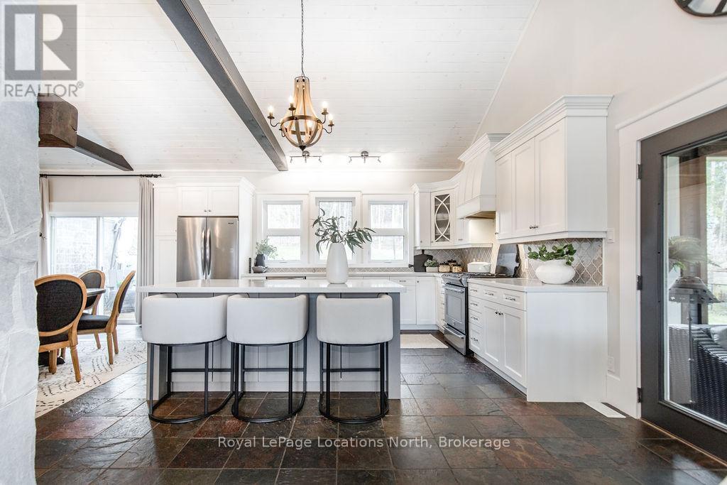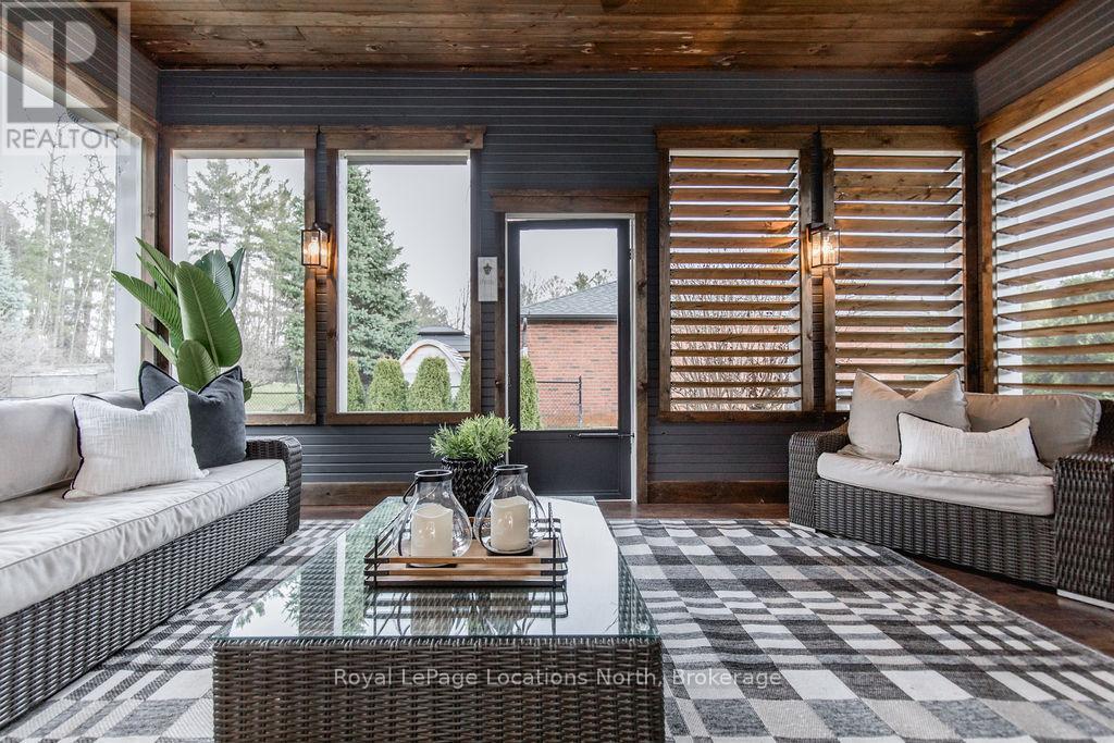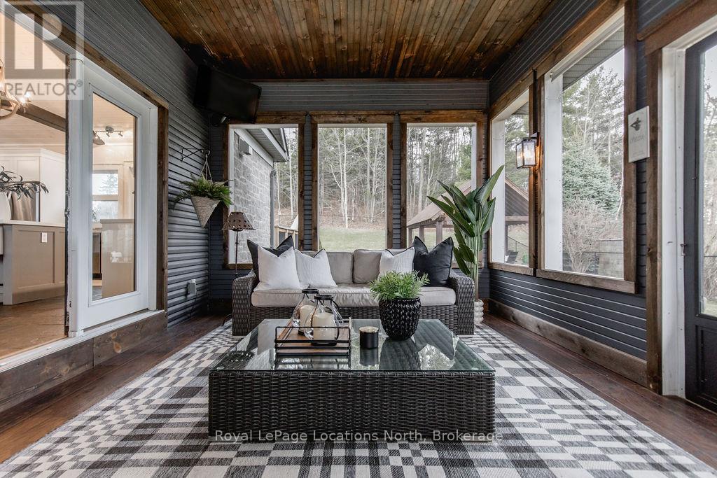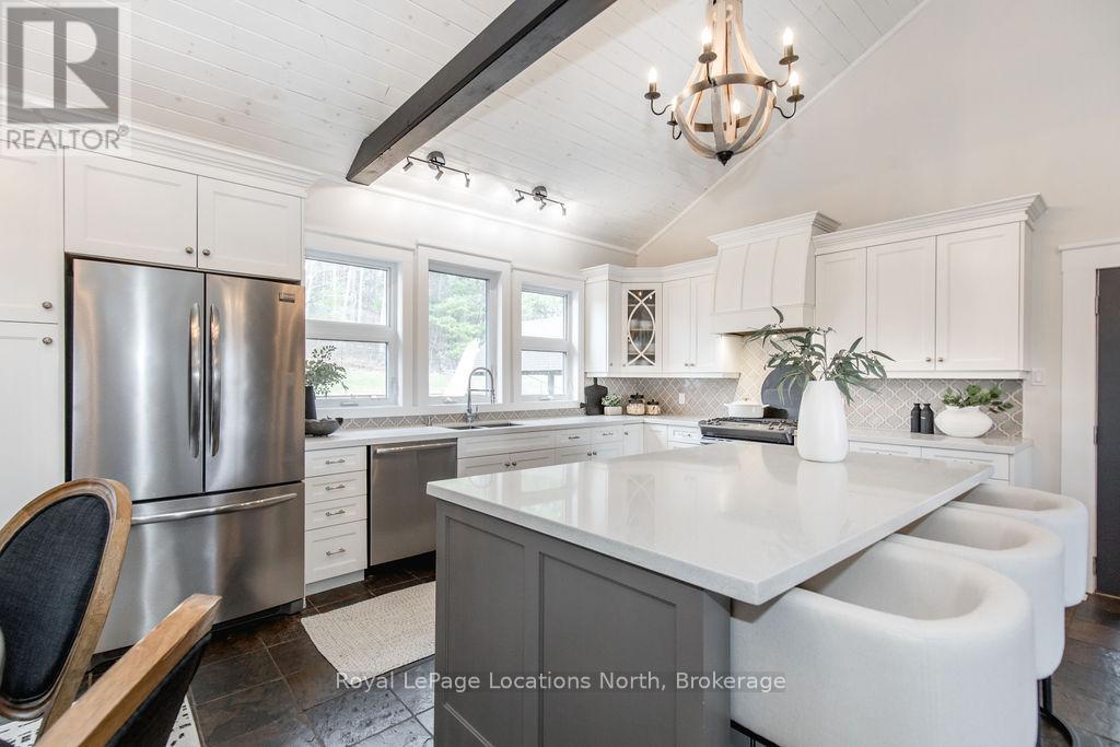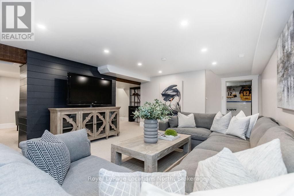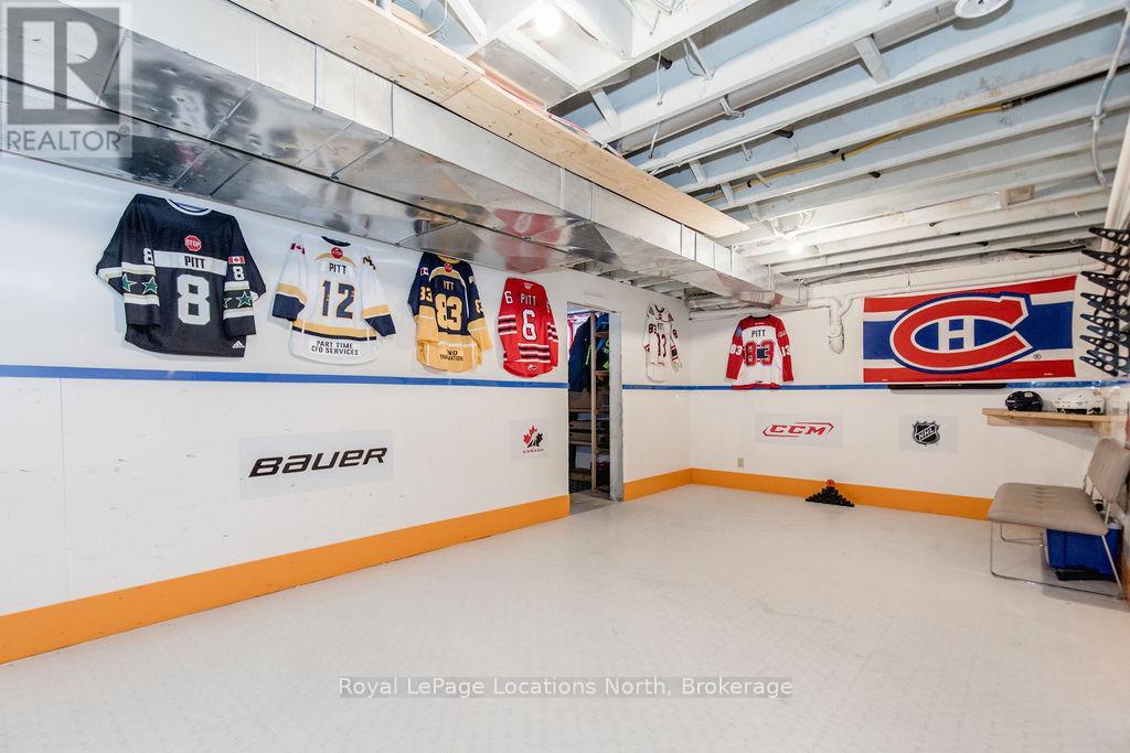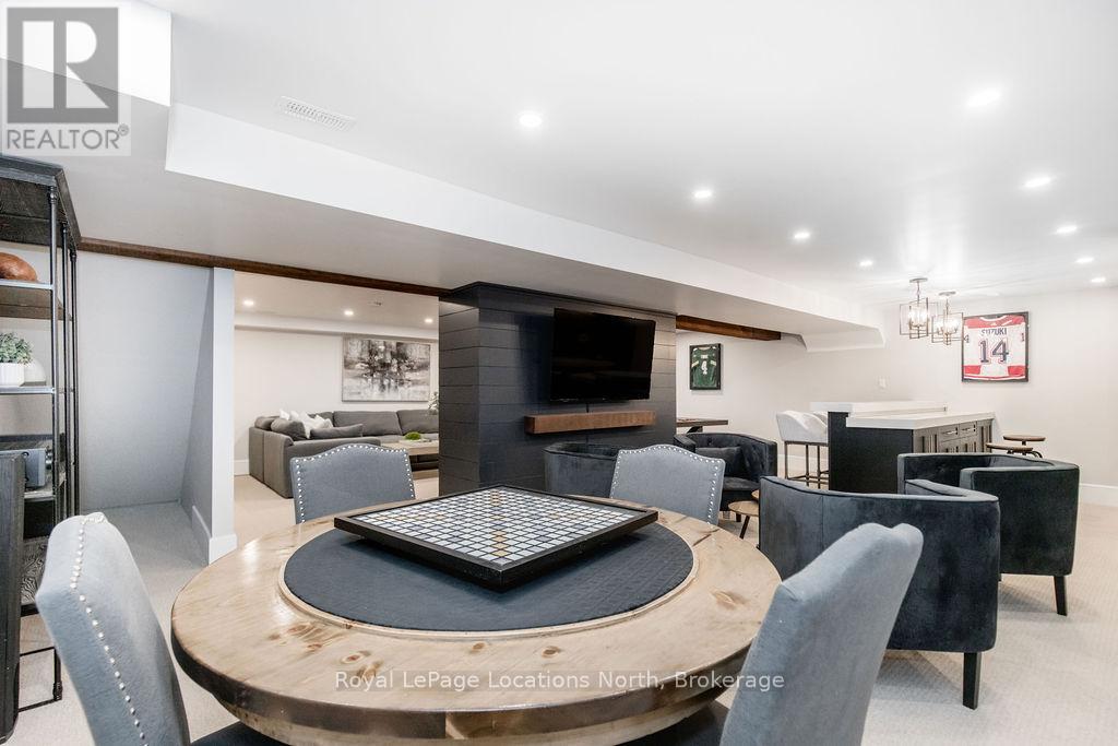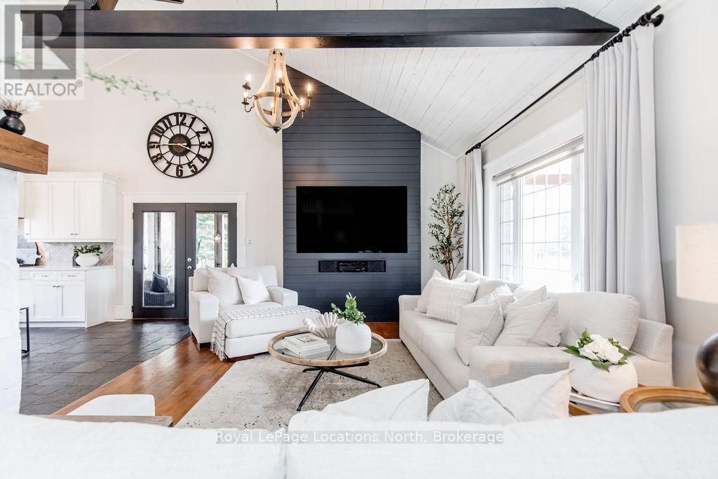 Set on a large, mature estate lot backing onto trees in the popular Wasaga Sands estate area, this custom-built modern rustic home offers privacy and warmth. Summer evenings invite you into the backyard where the timber-frame gazebo glows under custom lighting, the fire pit crackles and the treed backdrop creates a peaceful, resort-like setting. In winter, the snow-covered trees provide a serene view, perfect for unwinding by the fireplace after a day of skiing or snowshoeing. Inside, the home showcases vaulted ceilings with classic chandeliers, rich hardwood flooring throughout, and a stunning floor-to-ceiling stone fireplace that is the center piece to the open-concept family room and kitchen. The custom kitchen is ideal for entertaining, featuring a bright white palette, quartz countertops, custom backsplash and a spacious 9-foot island. Steps from the kitchen is a beautifully finished 3-season room, offering a comfortable retreat to enjoy the outdoors. Wide hallways lead to a built-in office nook and main-floor laundry. The primary bedroom is on the main floor, offering a retreat with a walk-in closet and a spa-inspired ensuite. Highlights include a floating soaker tub under a chandelier, a black-framed glass walk-in shower and quartz countertops. A second main-floor 4PC bathroom features a multi-head steam shower for a spa experience. Upstairs, the timber-frame loft creates a cozy second living area, complemented by two bedrooms with vaulted ceilings and an additional 4PC bathroom. The lower level features a custom dry bar, space for movies, ping pong, and poker nights. Sports lovers will appreciate the dedicated hockey shooting room, or turn it into a fitness room that supports an active lifestyle. Additional unfinished space offers future potential for two more bedrooms, a wine cellar. Outside, the deck provides room for outdoor dining and leads to a private hot tub. Double-car garage, fully drywalled and insulated with inside entry, plus parking for 4-6. (id:64974)
