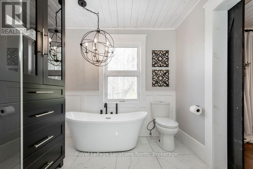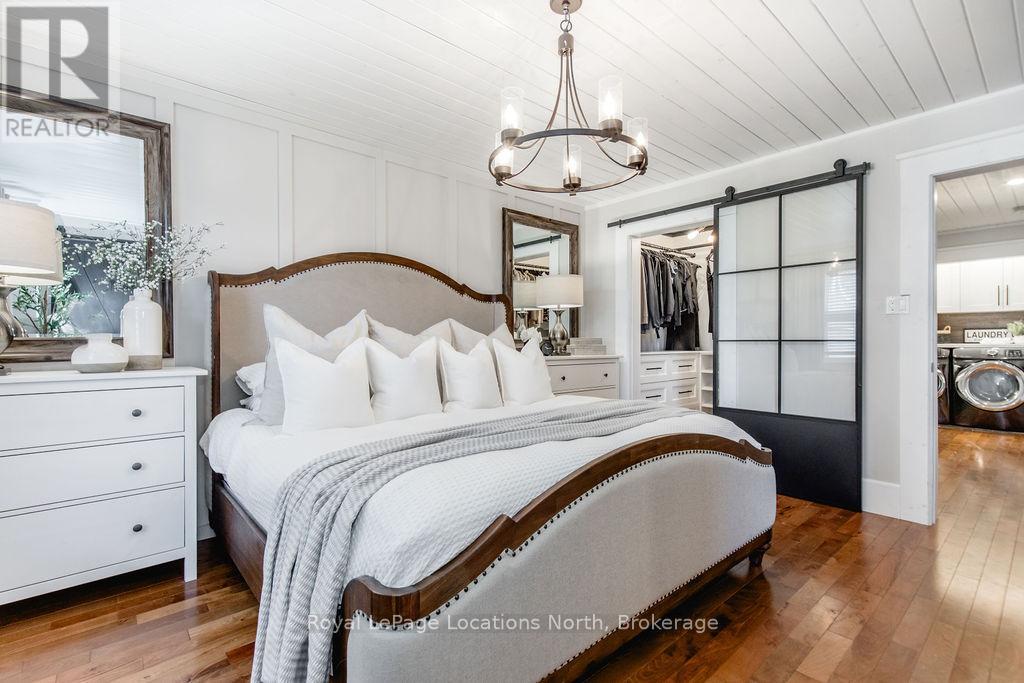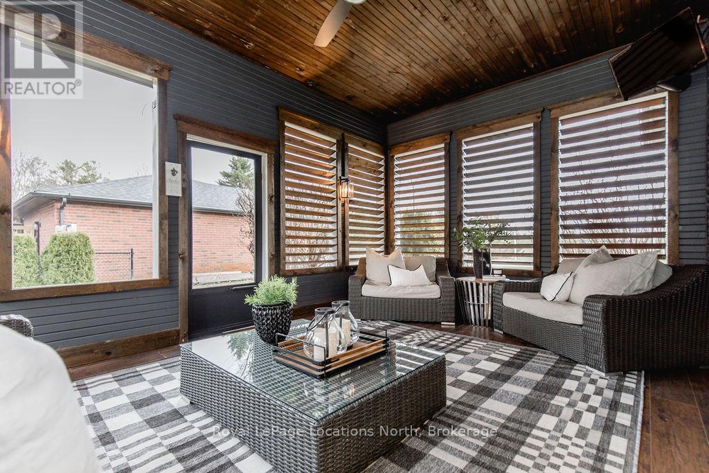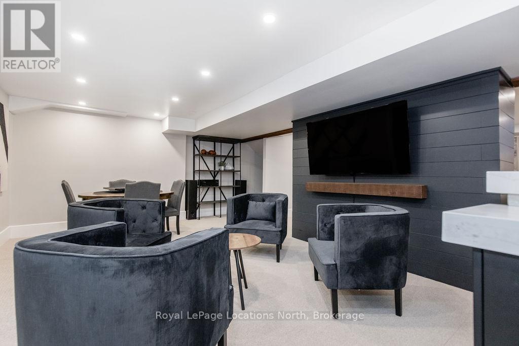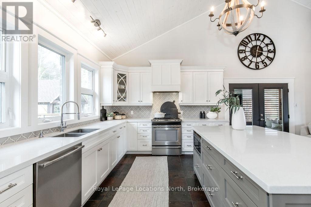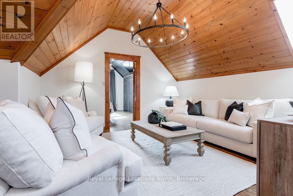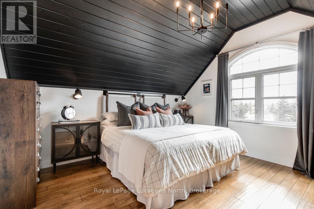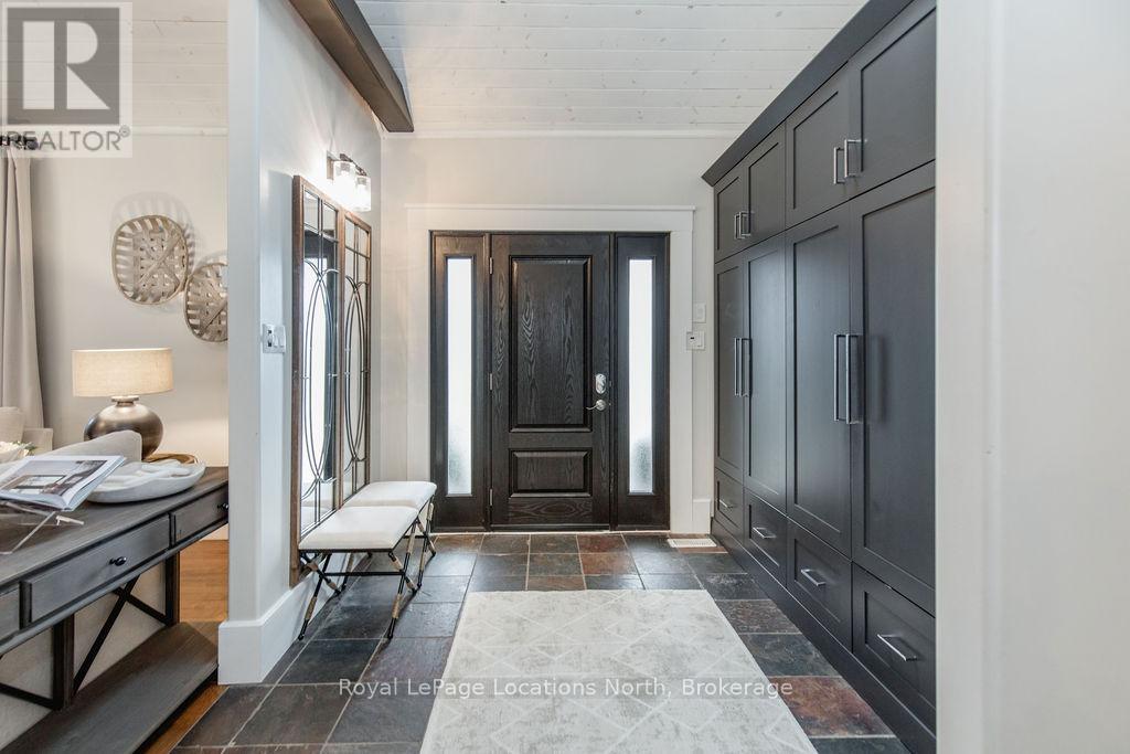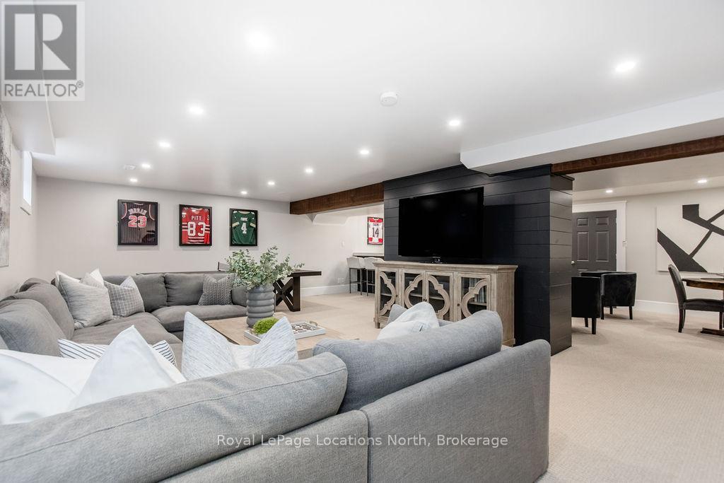 Set on a large, mature estate lot backing onto trees in the popular Wasaga Sands estate area, this custom-built modern rustic home offers privacy and warmth. Summer evenings invite you into the backyard where the timber-frame gazebo glows under custom lighting, the fire pit crackles and the treed backdrop creates a peaceful, resort-like setting. In winter, the snow-covered trees provide a serene view, perfect for unwinding by the fireplace after a day of skiing or snowshoeing. Inside, the home showcases vaulted ceilings with classic chandeliers, rich hardwood flooring throughout, and a stunning floor-to-ceiling stone fireplace that is the center piece to the open-concept family room and kitchen. The custom kitchen is ideal for entertaining, featuring a bright white palette, quartz countertops, custom backsplash and a spacious 9-foot island. Steps from the kitchen is a beautifully finished 3-season room, offering a comfortable retreat to enjoy the outdoors. Wide hallways lead to a built-in office nook and main-floor laundry. The primary bedroom is on the main floor, offering a retreat with a walk-in closet and a spa-inspired ensuite. Highlights include a floating soaker tub under a chandelier, a black-framed glass walk-in shower and quartz countertops. A second main-floor 4PC bathroom features a multi-head steam shower for a spa experience. Upstairs, the timber-frame loft creates a cozy second living area, complemented by two bedrooms with vaulted ceilings and an additional 4PC bathroom. The lower level features a custom dry bar, space for movies, ping pong, and poker nights. Sports lovers will appreciate the dedicated hockey shooting room, or turn it into a fitness room that supports an active lifestyle. Additional unfinished space offers future potential for two more bedrooms, a wine cellar. Outside, the deck provides room for outdoor dining and leads to a private hot tub. Double-car garage, fully drywalled and insulated with inside entry, plus parking for 4-6. (id:64974)
