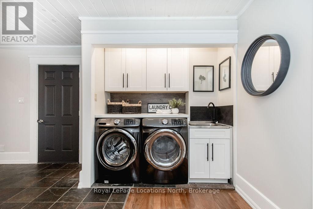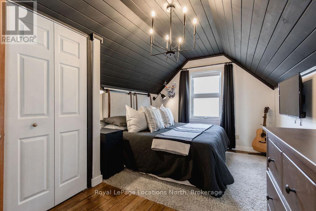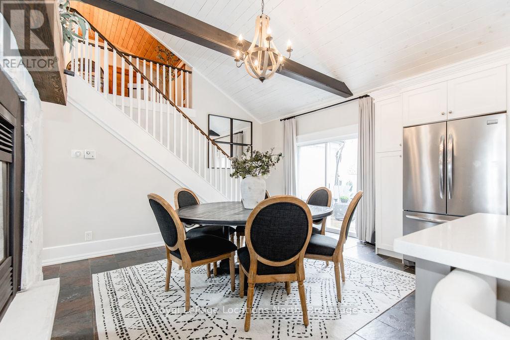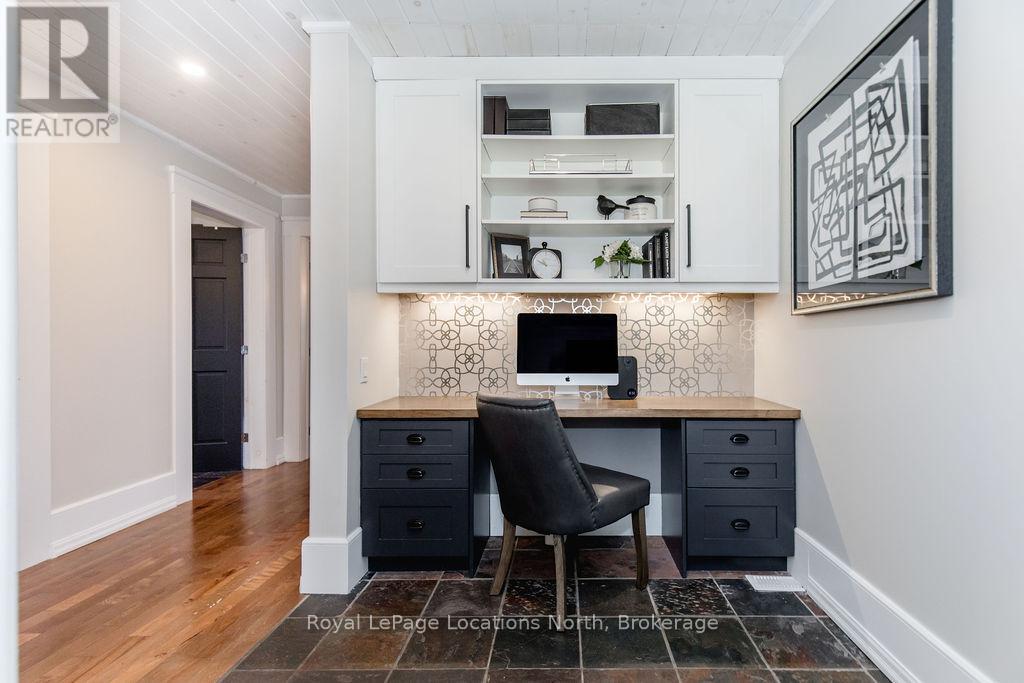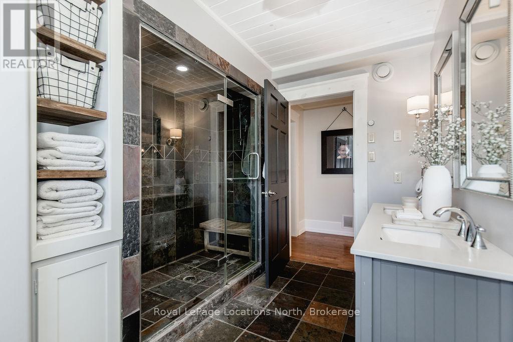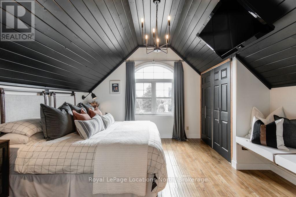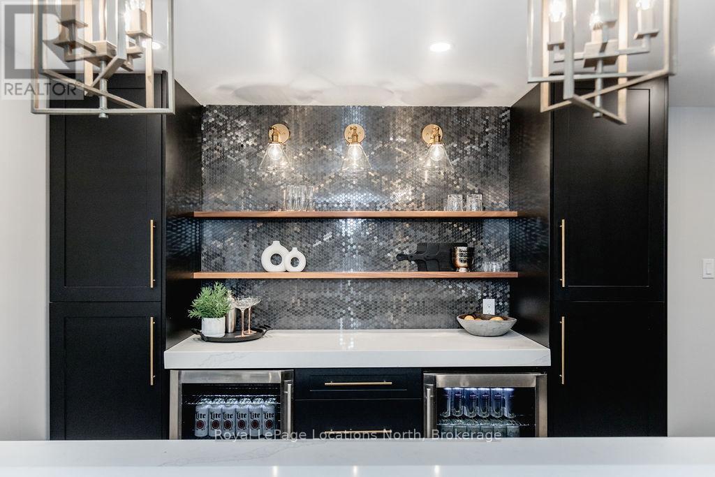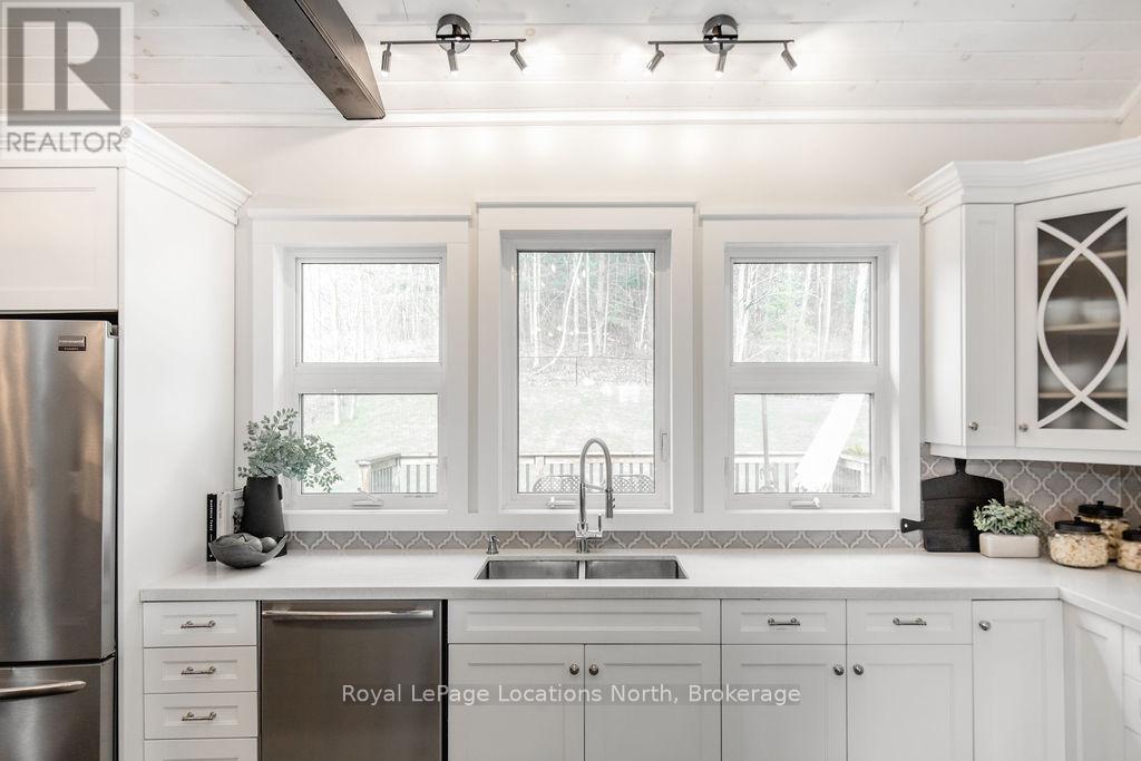 Set on a large, mature estate lot backing onto trees in the popular Wasaga Sands estate area, this custom-built modern rustic home offers privacy and warmth. Summer evenings invite you into the backyard where the timber-frame gazebo glows under custom lighting, the fire pit crackles and the treed backdrop creates a peaceful, resort-like setting. In winter, the snow-covered trees provide a serene view, perfect for unwinding by the fireplace after a day of skiing or snowshoeing. Inside, the home showcases vaulted ceilings with classic chandeliers, rich hardwood flooring throughout, and a stunning floor-to-ceiling stone fireplace that is the center piece to the open-concept family room and kitchen. The custom kitchen is ideal for entertaining, featuring a bright white palette, quartz countertops, custom backsplash and a spacious 9-foot island. Steps from the kitchen is a beautifully finished 3-season room, offering a comfortable retreat to enjoy the outdoors. Wide hallways lead to a built-in office nook and main-floor laundry. The primary bedroom is on the main floor, offering a retreat with a walk-in closet and a spa-inspired ensuite. Highlights include a floating soaker tub under a chandelier, a black-framed glass walk-in shower and quartz countertops. A second main-floor 4PC bathroom features a multi-head steam shower for a spa experience. Upstairs, the timber-frame loft creates a cozy second living area, complemented by two bedrooms with vaulted ceilings and an additional 4PC bathroom. The lower level features a custom dry bar, space for movies, ping pong, and poker nights. Sports lovers will appreciate the dedicated hockey shooting room, or turn it into a fitness room that supports an active lifestyle. Additional unfinished space offers future potential for two more bedrooms, a wine cellar. Outside, the deck provides room for outdoor dining and leads to a private hot tub. Double-car garage, fully drywalled and insulated with inside entry, plus parking for 4-6. (id:64974)