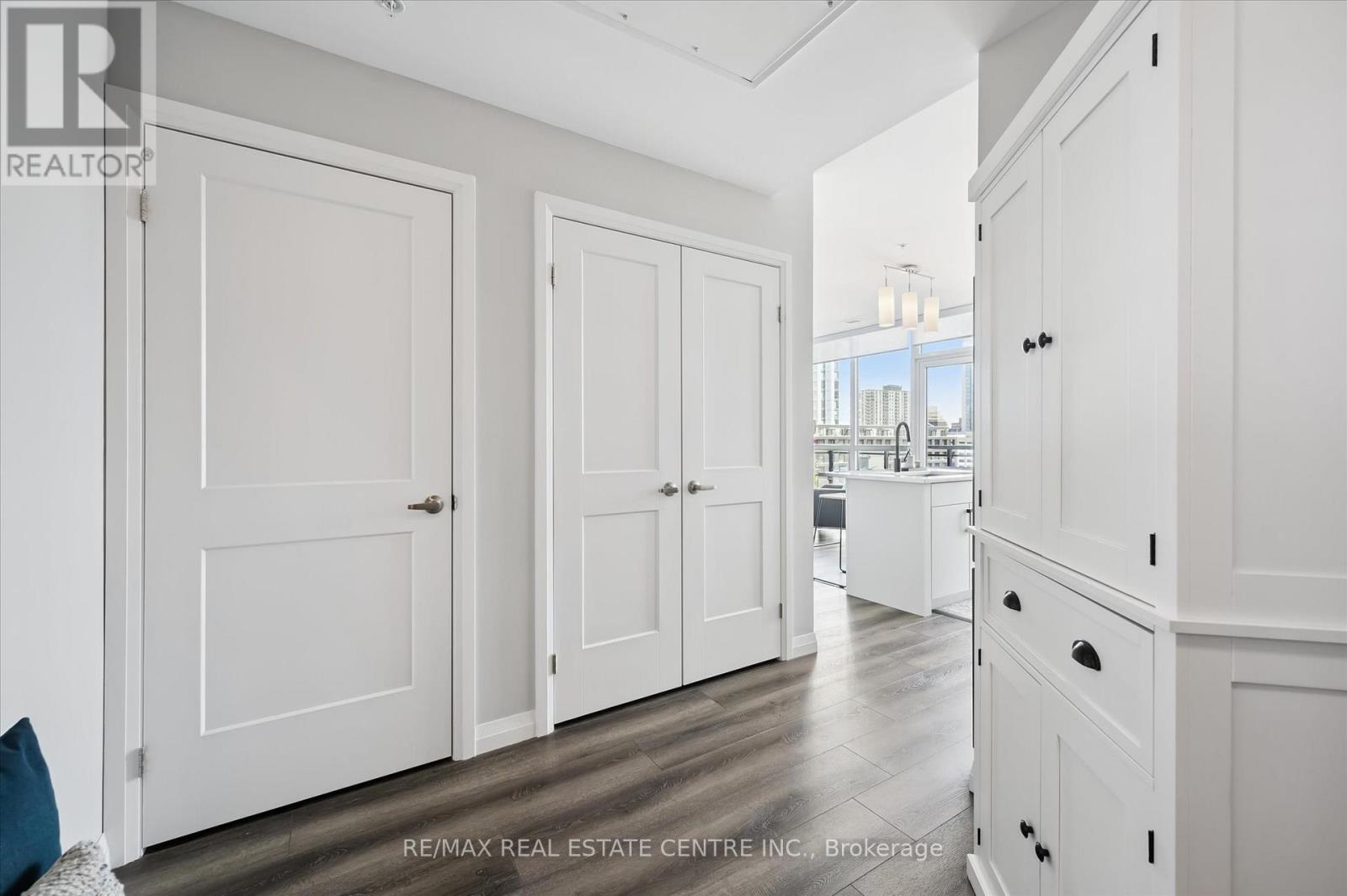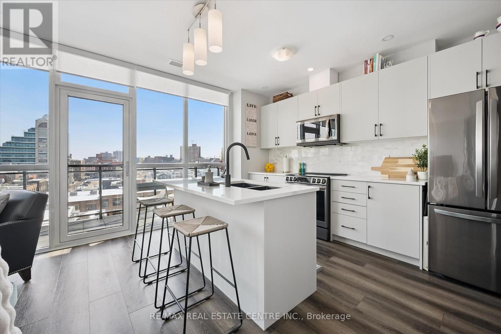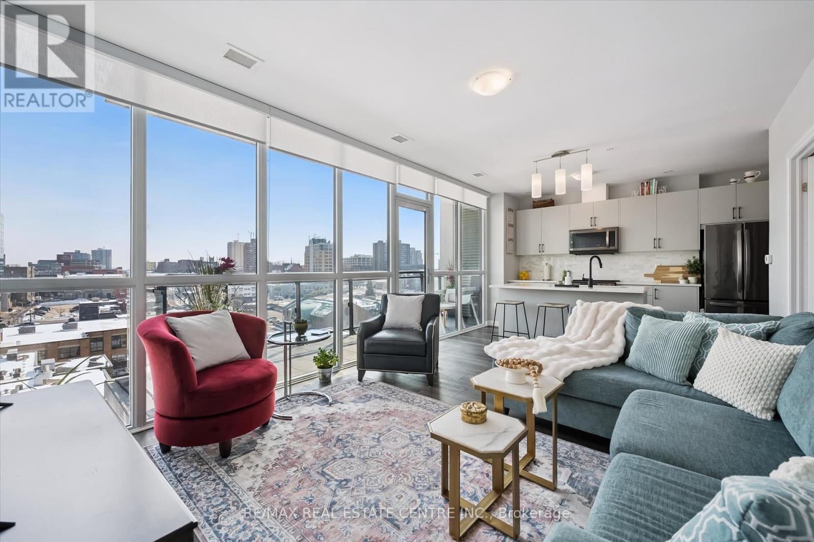 Welcome to Unit 702 at Charlie West, a beautifully upgraded 2-bedroom, 2-bathroom corner suite ideally positioned adjacent to Victoria Park with desirable east-facing park views. Offering approximately 894 sq ft of thoughtfully designed living space, this move-in ready residence features over $50,000 in builder upgrades and custom built-in closet systems that maximize storage and functionality. The open-concept layout showcases upgraded flooring, a modern white kitchen with stainless steel appliances, stylish backsplash, under-cabinet lighting, and 9 foot ceilings that adds architectural character. The master bedroom includes a private ensuite and tailored builtins from Closets by Design. Large windows fill the space with natural light while framing treetop and park views. Private 21 square foot balcony with decking. Additional conveniences include a locker located directly across the hallway and one underground parking space with access just one floor below on the 6th floor. The fitness centre, yoga studio, outdoor landscape terrace with BBQs, catering kitchen, pet run and washing station are all conveniently located on the 7th floor. No need to use the elevator to access these amenities. Charlie West offers concierge service with evening and weekend security. The guest suite is just one floor down on the 6th floor. EV charging stations, and secure car and bike parking available in the parkade. Steps to the ION LRT, Victoria Park, City Hall, Google headquarters, and downtown Kitchener's restaurants and cafés. Move-in ready. Exceptional location. Outstanding value. (id:64974)