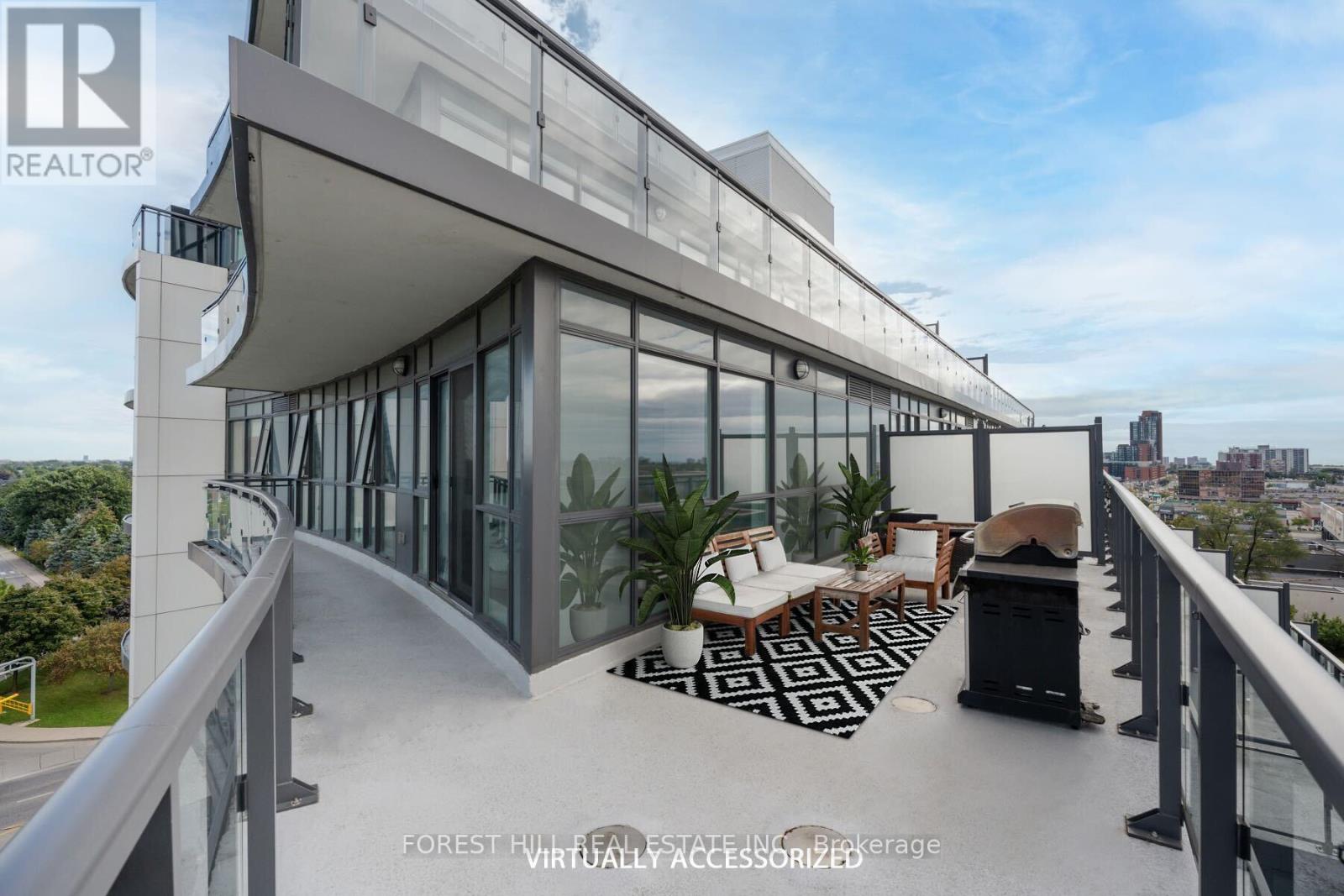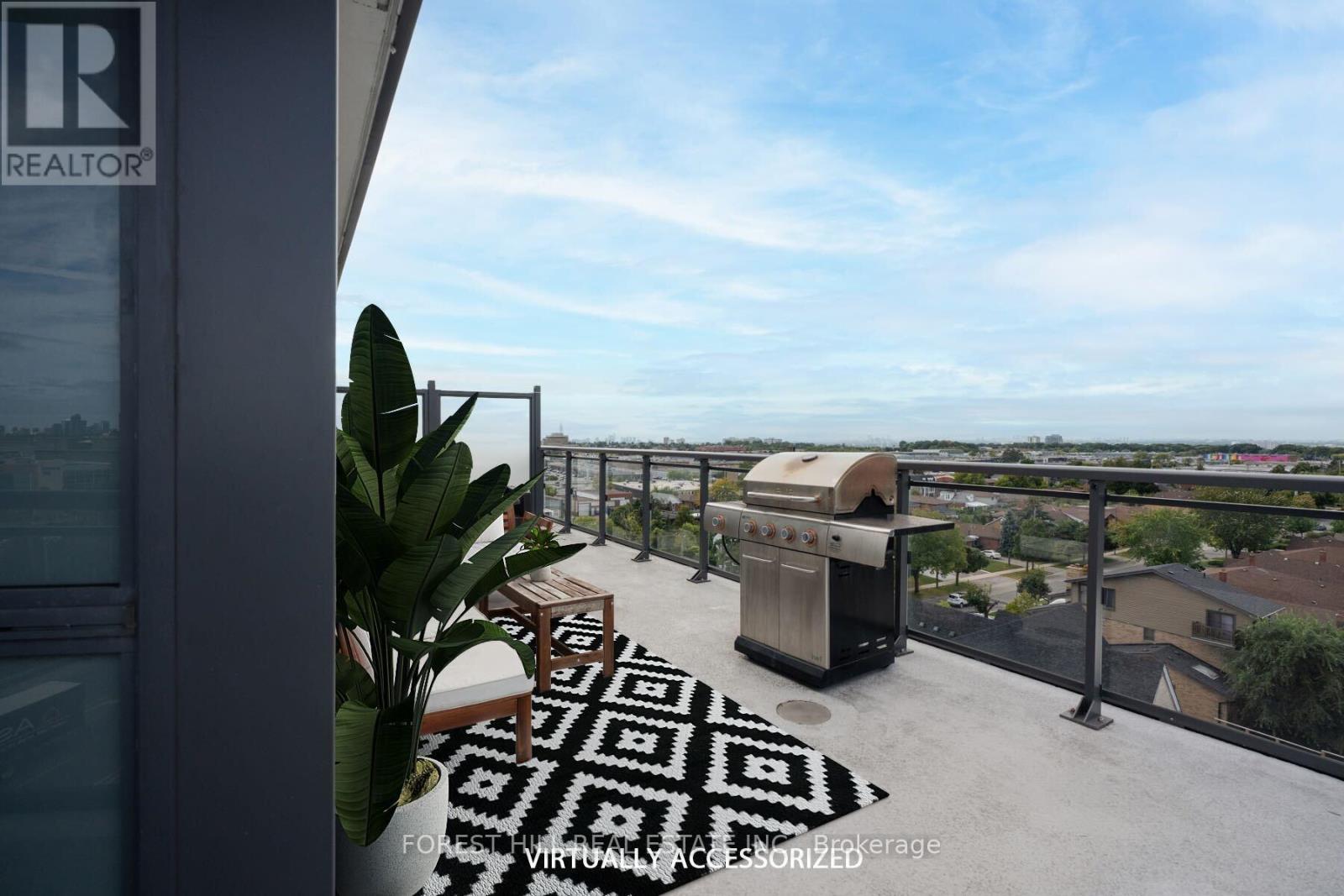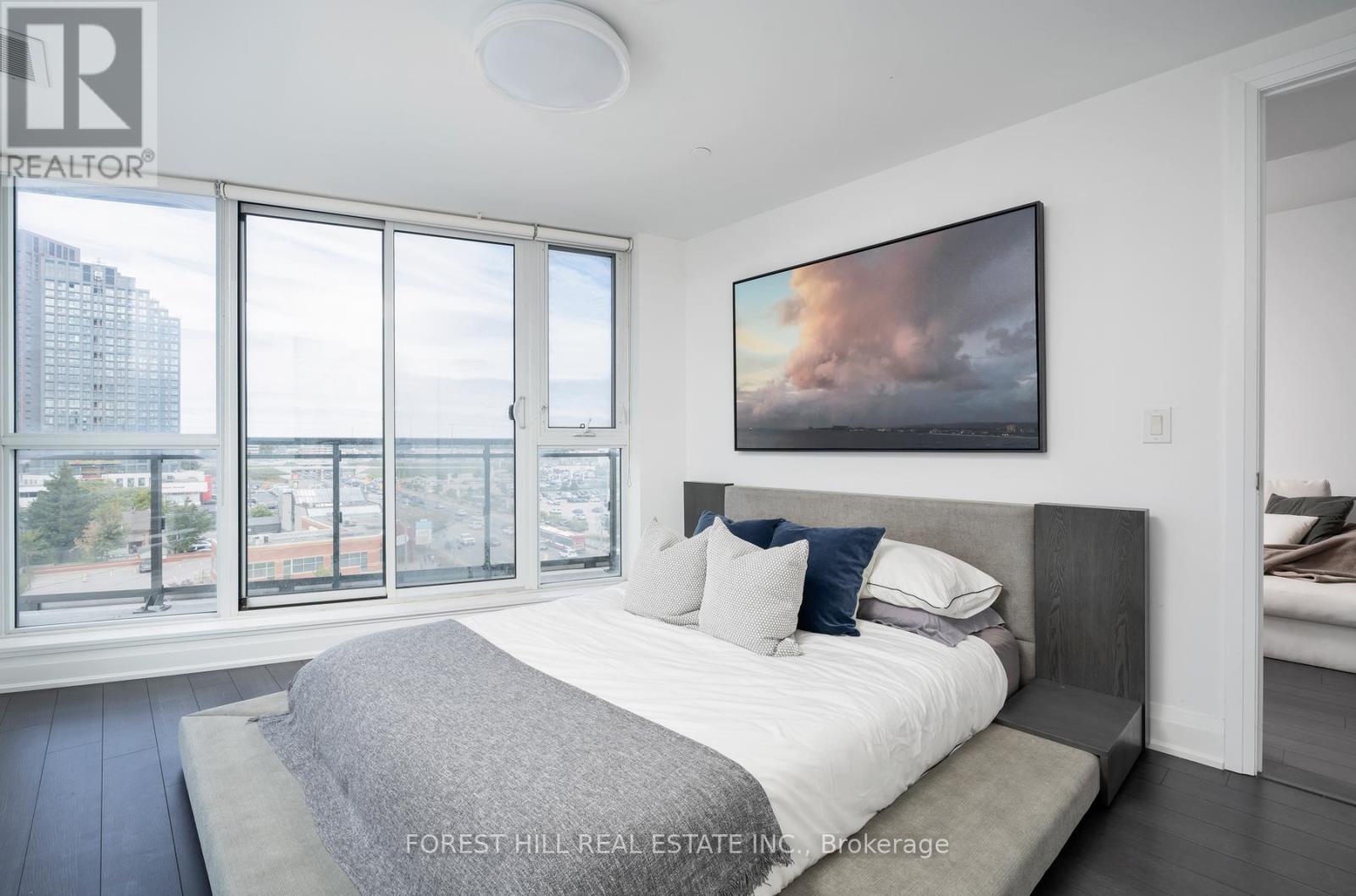 Welcome to this stunning, boutique-style private condo located in the highly sought-after Yorkdale area. This spacious 863 sq. ft. unit offers a thoughtful split layout with two large bedrooms, two full bathrooms, and a large den. The unit is finished with quartz countertops, modern bathrooms, and large floor-to-ceiling windows, offering an abundance of natural light. Unique to the area, it boasts an expansive wrap-around corner terrace of over 470 sq. ft., perfect for entertaining while enjoying magnificent sunsets, BBQs permitted too! This home includes 1 extra wide parking space and 1 locker. The building provides 24/7 virtual concierge service and security cameras on every floor. Situated steps from Yorkdale Mall, Highway 401, subway access, an easy drive to the airport, coffee shops, restaurants, universities, and more. Don't miss this rare opportunity! (id:64974)