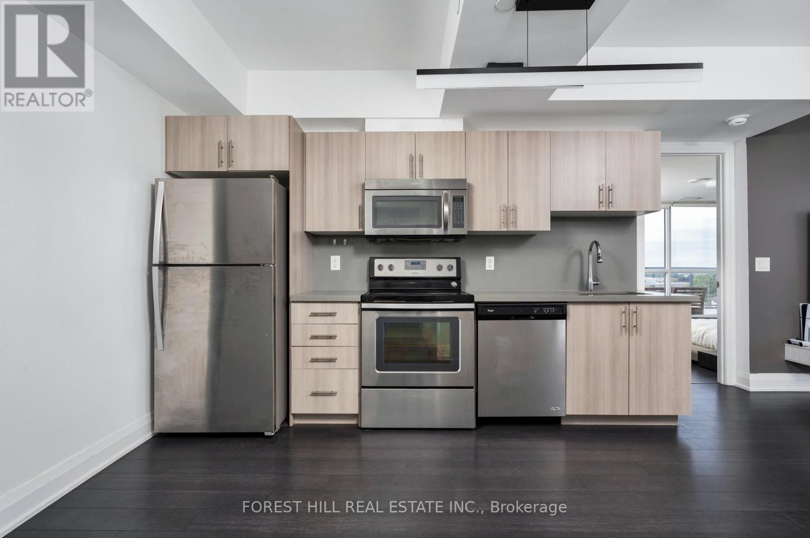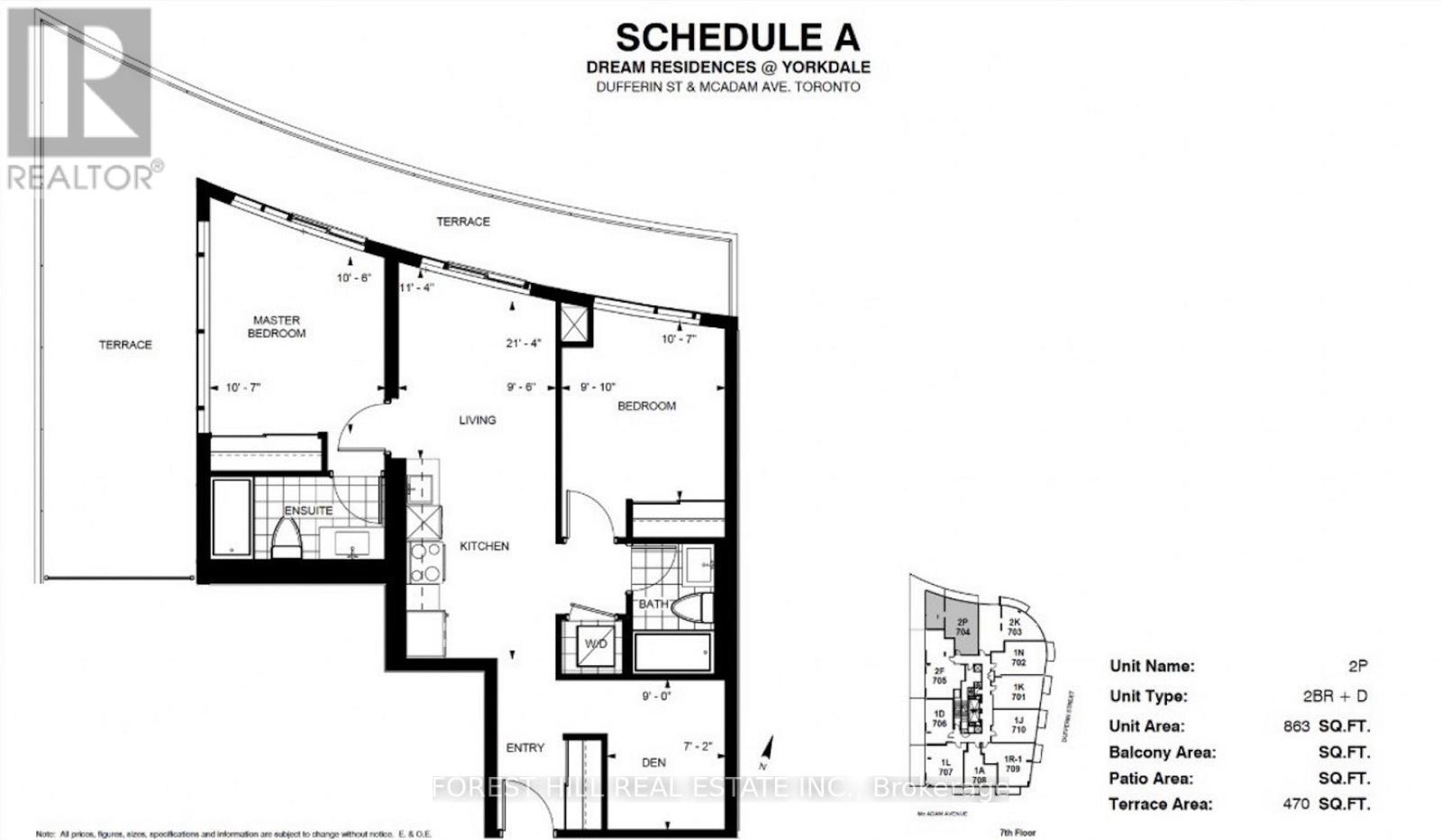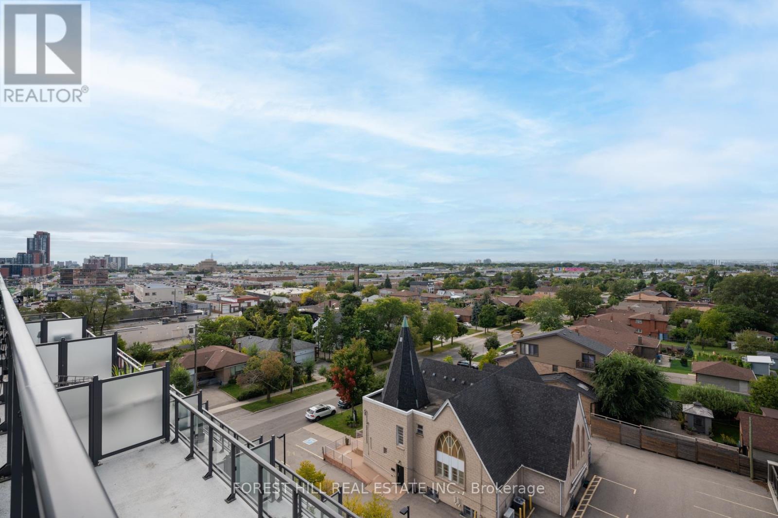 Welcome to this stunning, boutique-style private condo located in the highly sought-after Yorkdale area. This spacious 863 sq. ft. unit offers a thoughtful split layout with two large bedrooms, two full bathrooms, and a large den. The unit is finished with quartz countertops, modern bathrooms, and large floor-to-ceiling windows, offering an abundance of natural light. Unique to the area, it boasts an expansive wrap-around corner terrace of over 470 sq. ft., perfect for entertaining while enjoying magnificent sunsets, BBQs permitted too! This home includes 1 extra wide parking space and 1 locker. The building provides 24/7 virtual concierge service and security cameras on every floor. Situated steps from Yorkdale Mall, Highway 401, subway access, an easy drive to the airport, coffee shops, restaurants, universities, and more. Don't miss this rare opportunity! (id:64974)